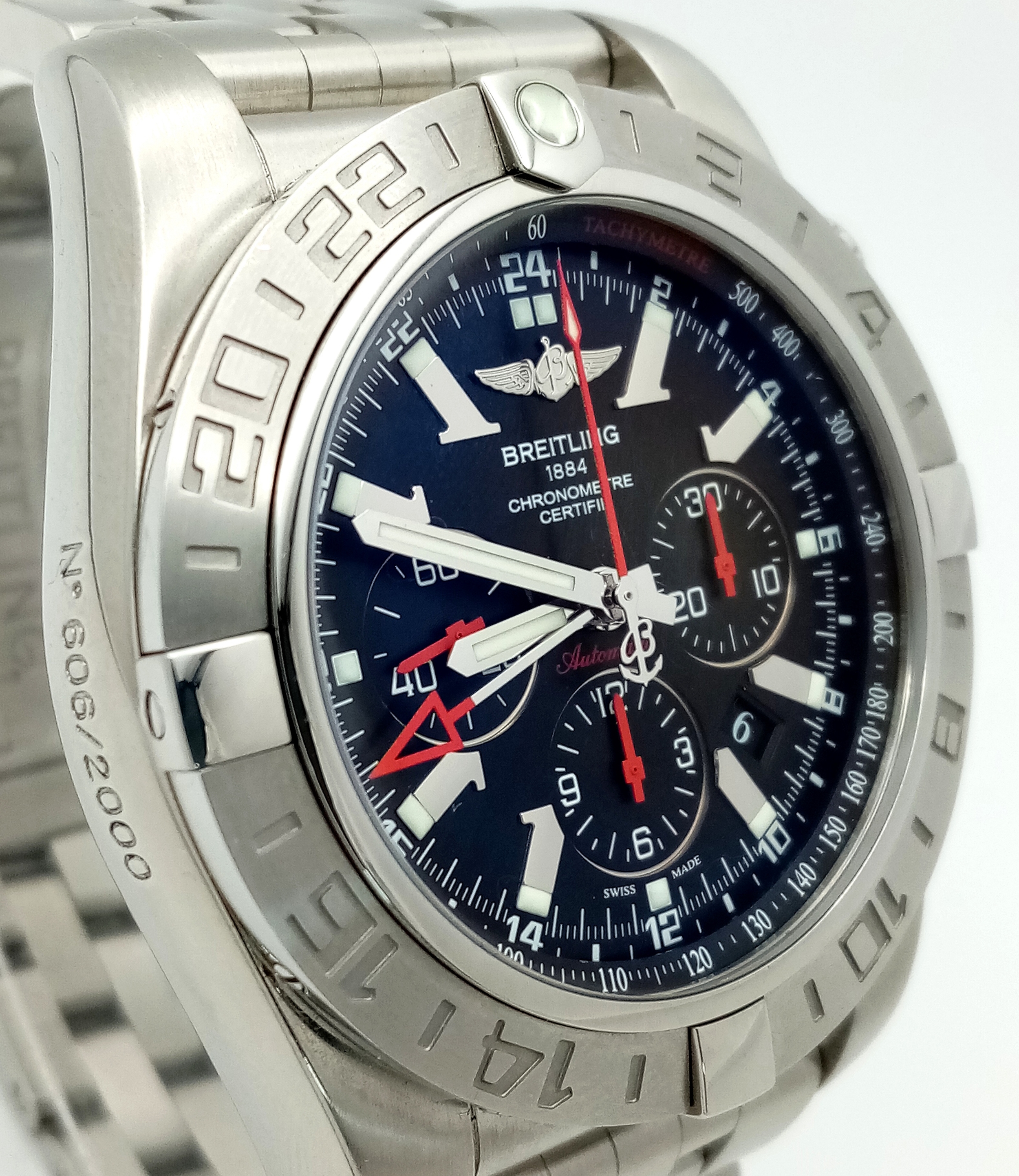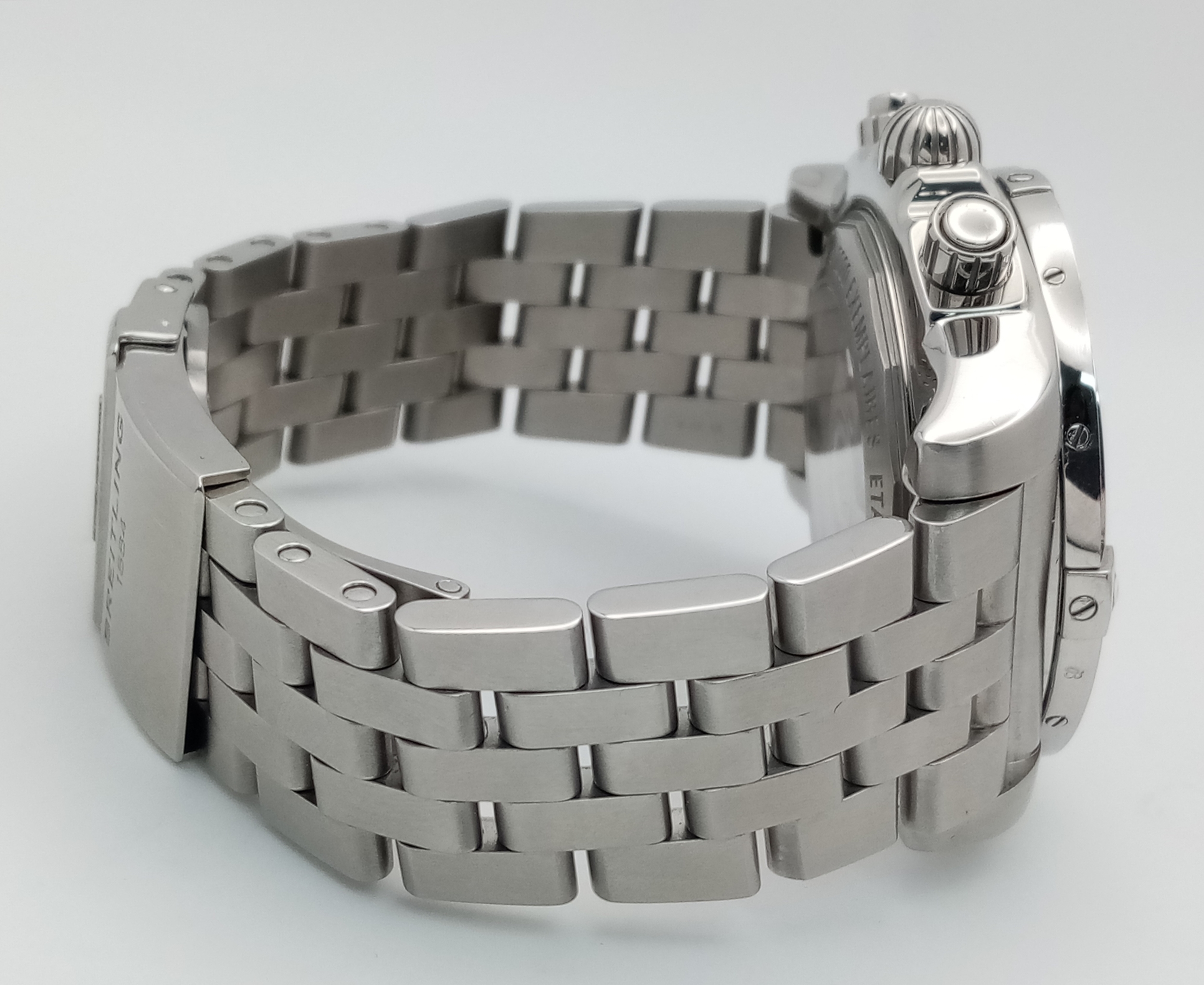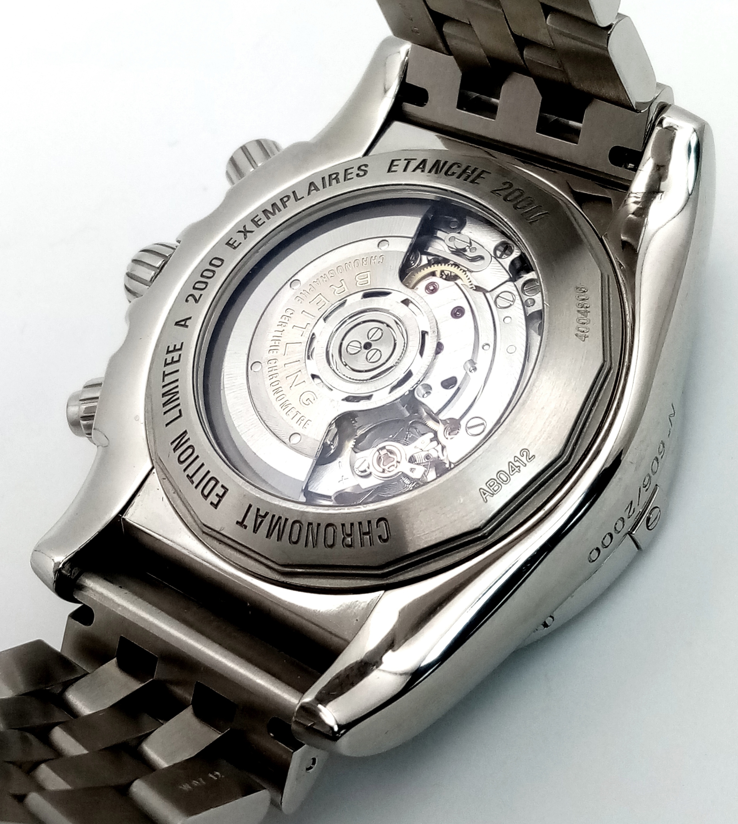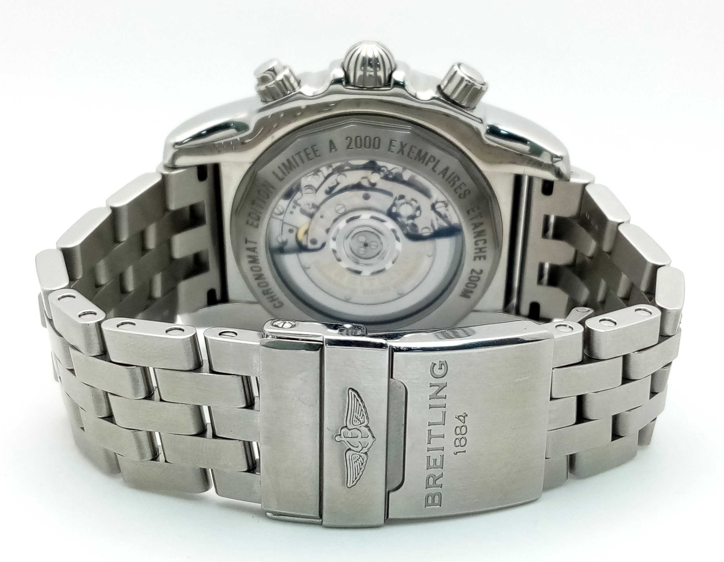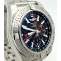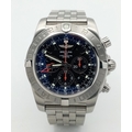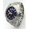 A Breitling Chronomat Limited Edition Automatic Gents Watch. Model AB0412. Stainless steel bracelet and case - 47mm. Black dial with three sub dials. Skeleton back. Comes with box and an array of papers. In good condition and working order. Ref: 09648