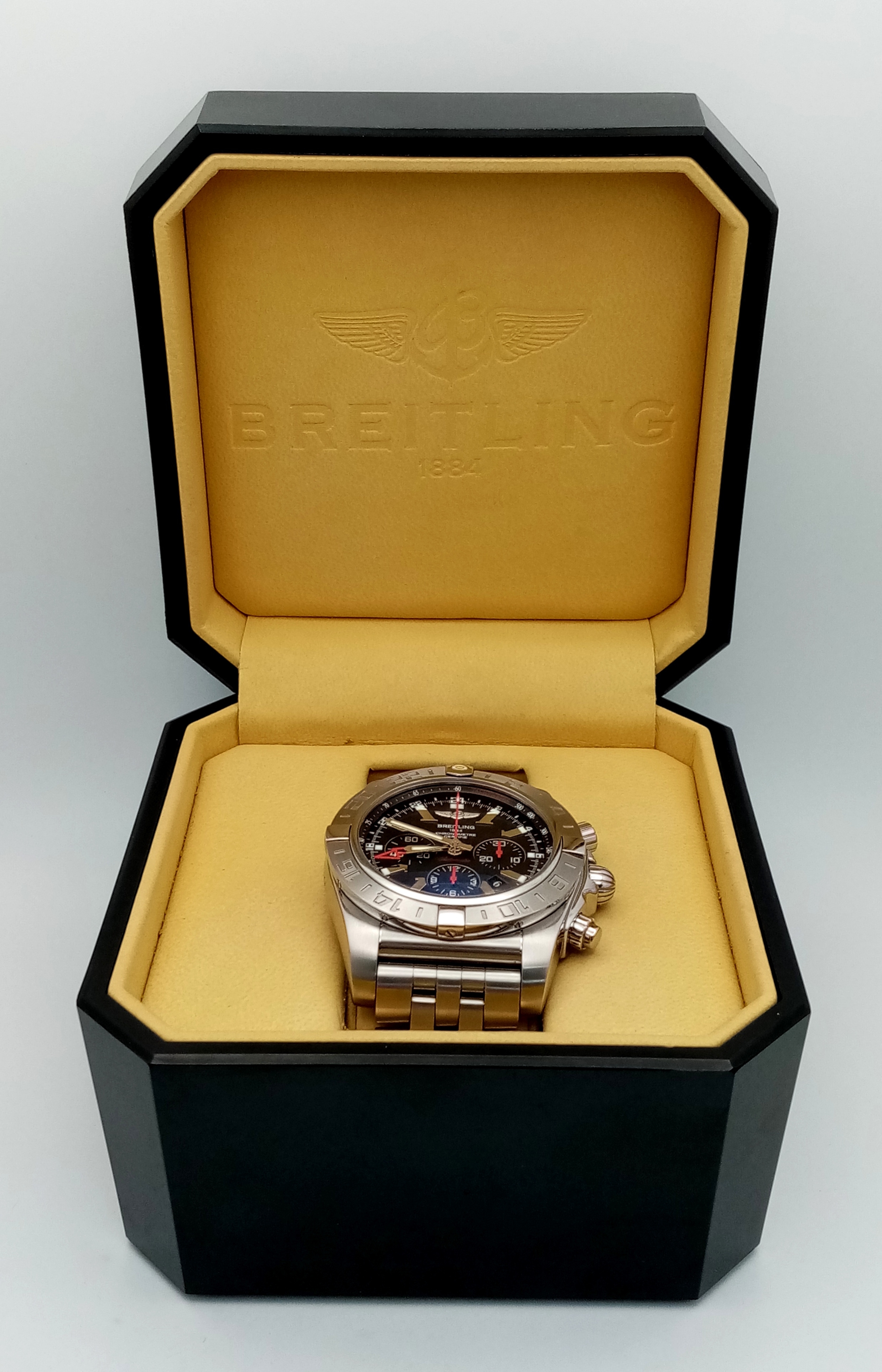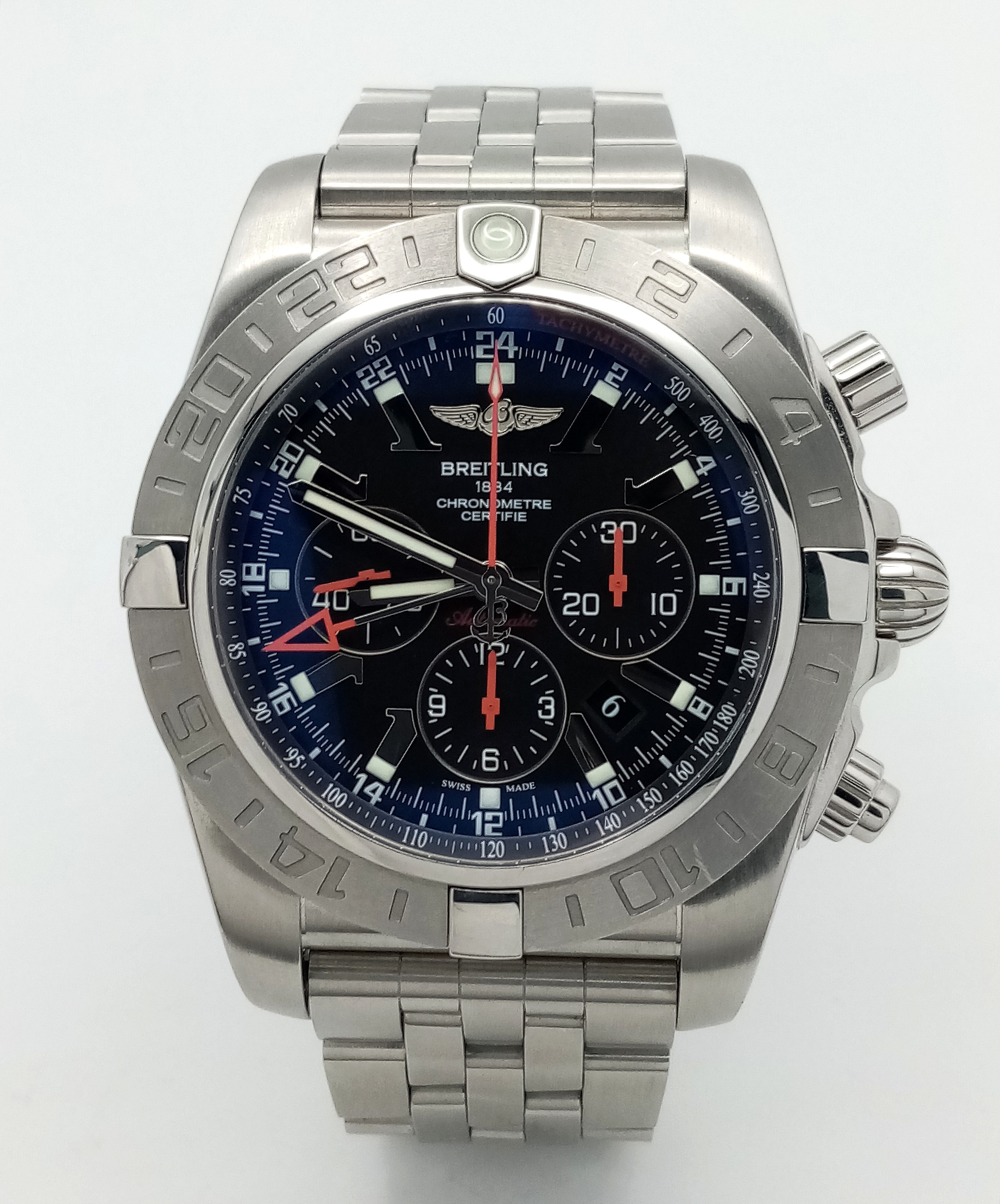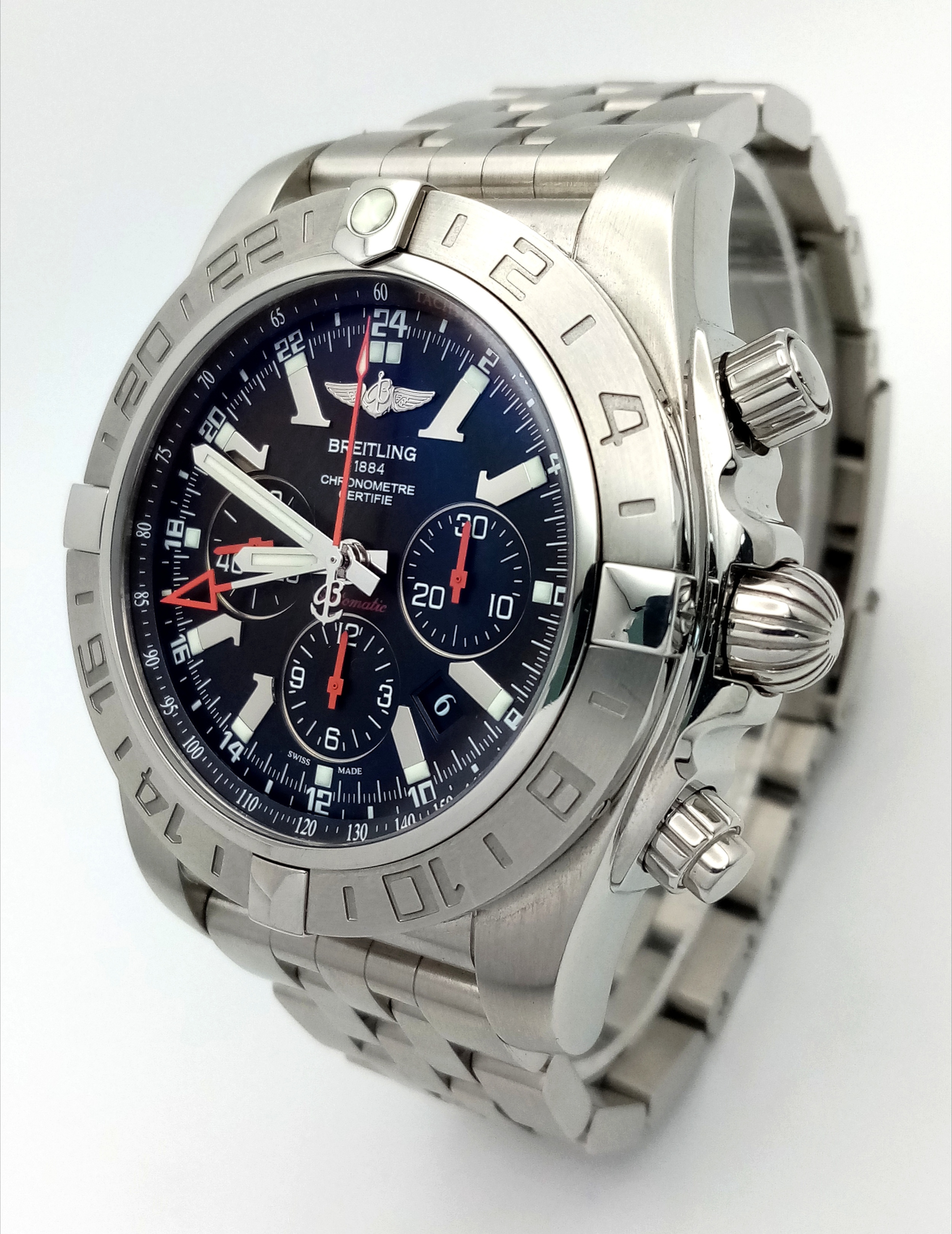A Breitling Chronomat Limited Edition Automatic Gents Watch. Model AB0412. Stainless steel bracelet and case - 47mm. Black dial with three sub dials. Skeleton back. Comes with box and an array of papers. In good condition and working order. Ref: 09648