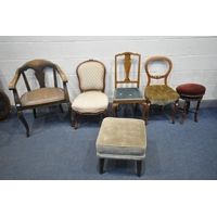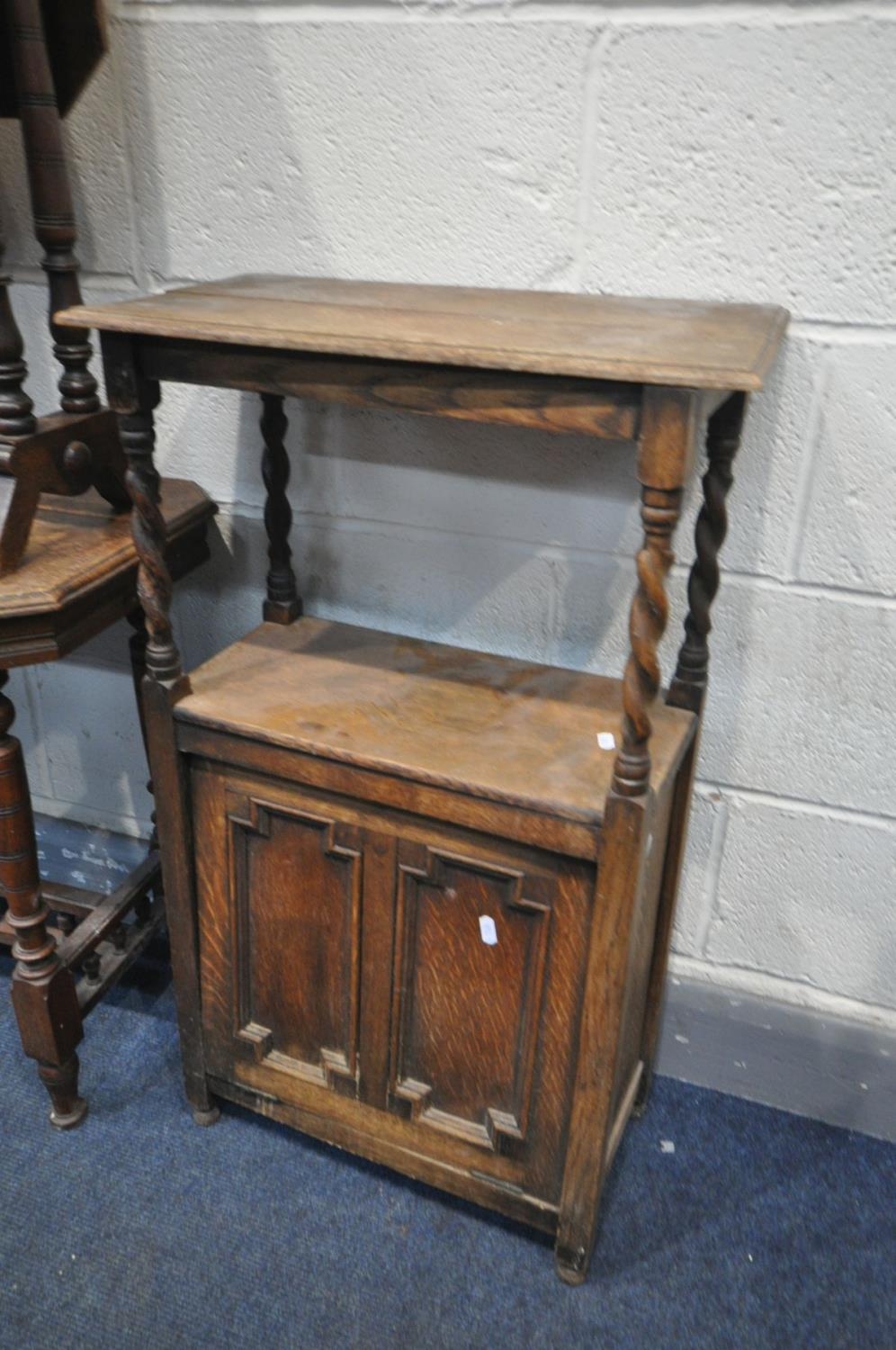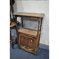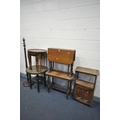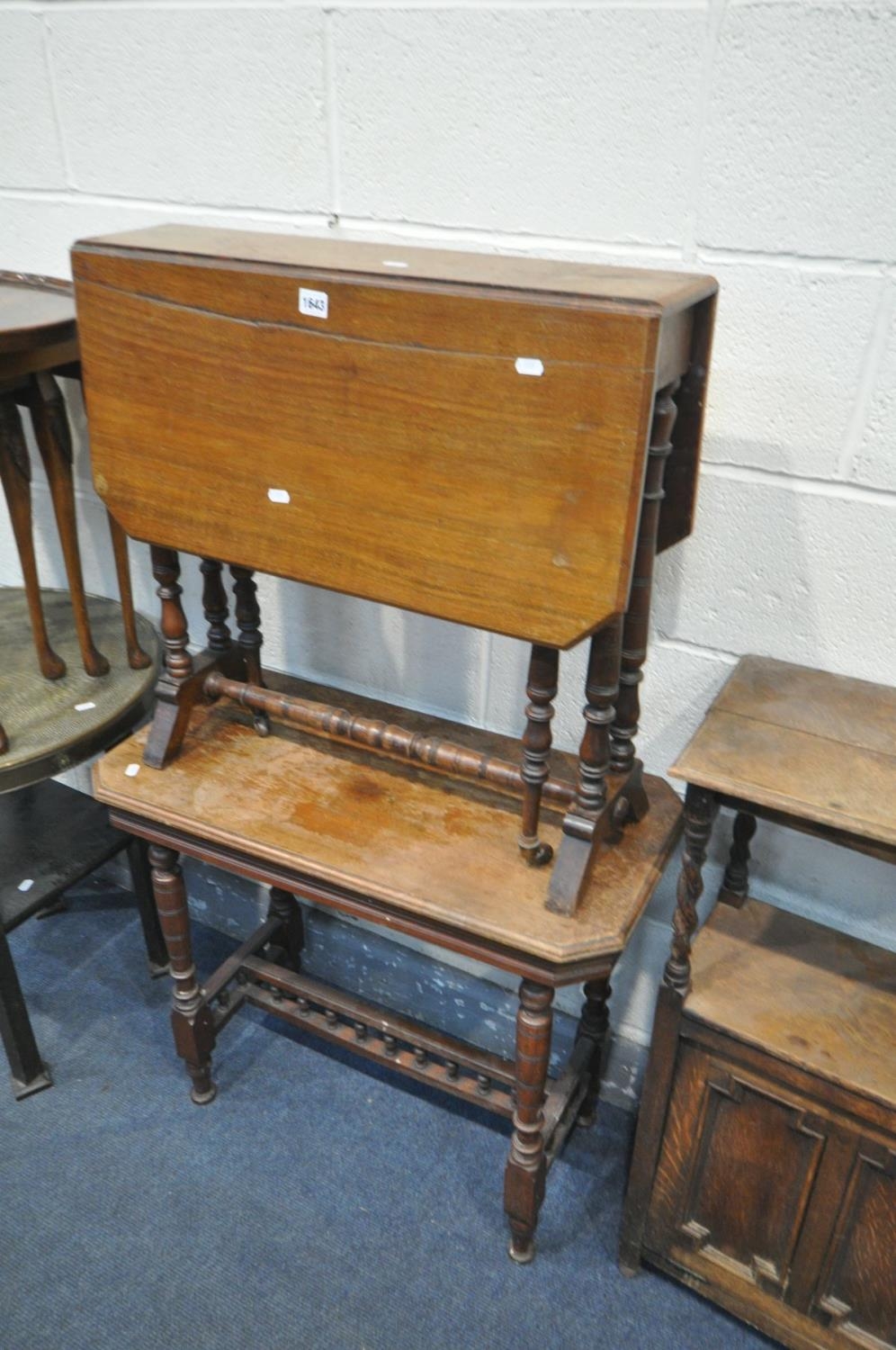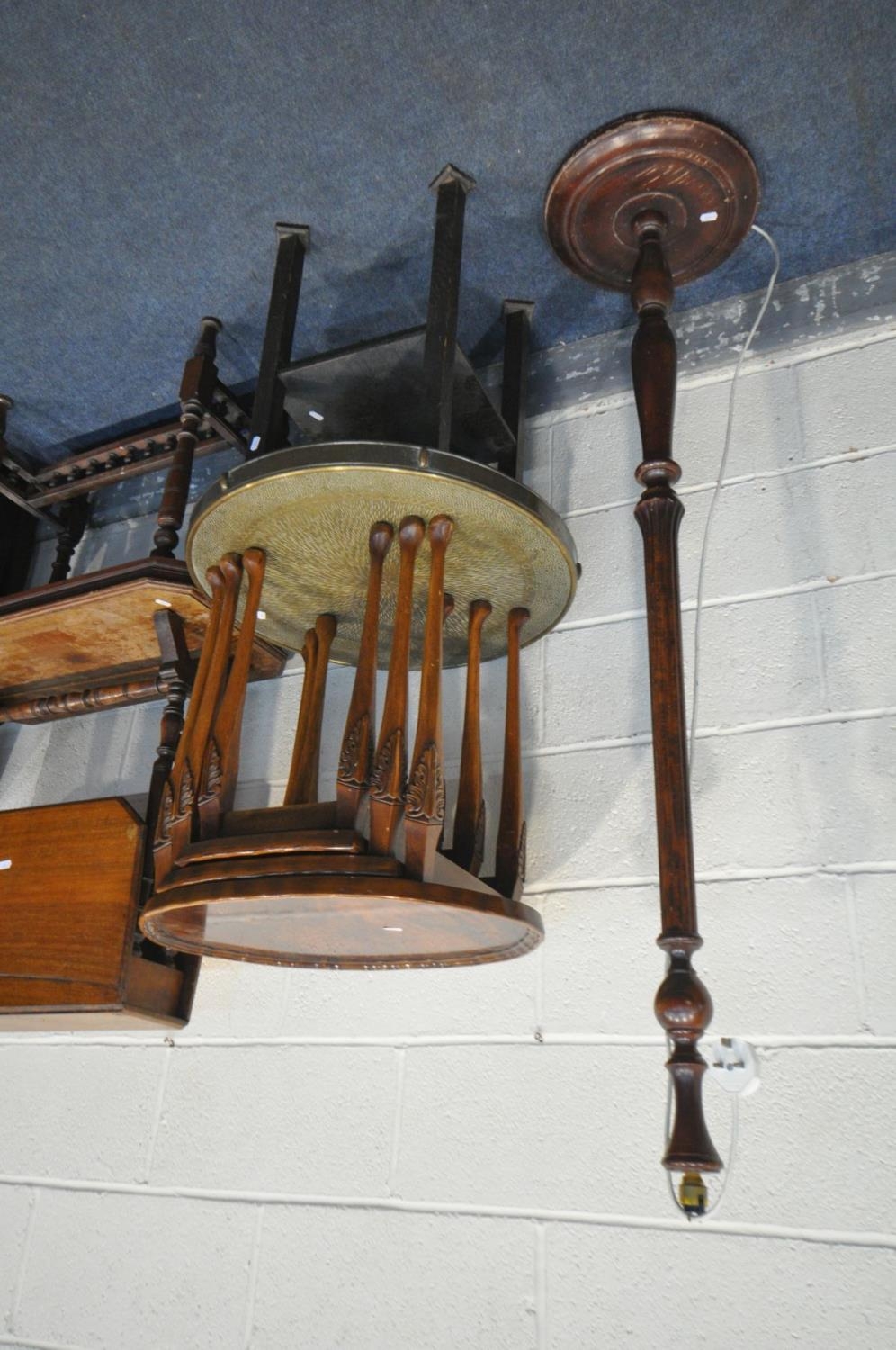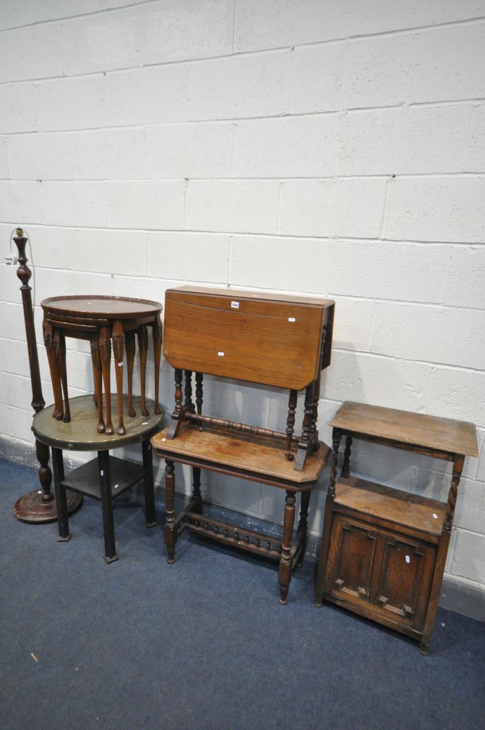 A SELECTION OF EARLY 20TH CENTURY OCCASIONAL FURNITURE, to include a walnut Sutherland table, walnut centre table, oak fall front cabinet, a circular brass top occasional table, mahogany oval nest of three tables and a standard lamp (condition:-four items with surface wear and staining) (6)