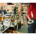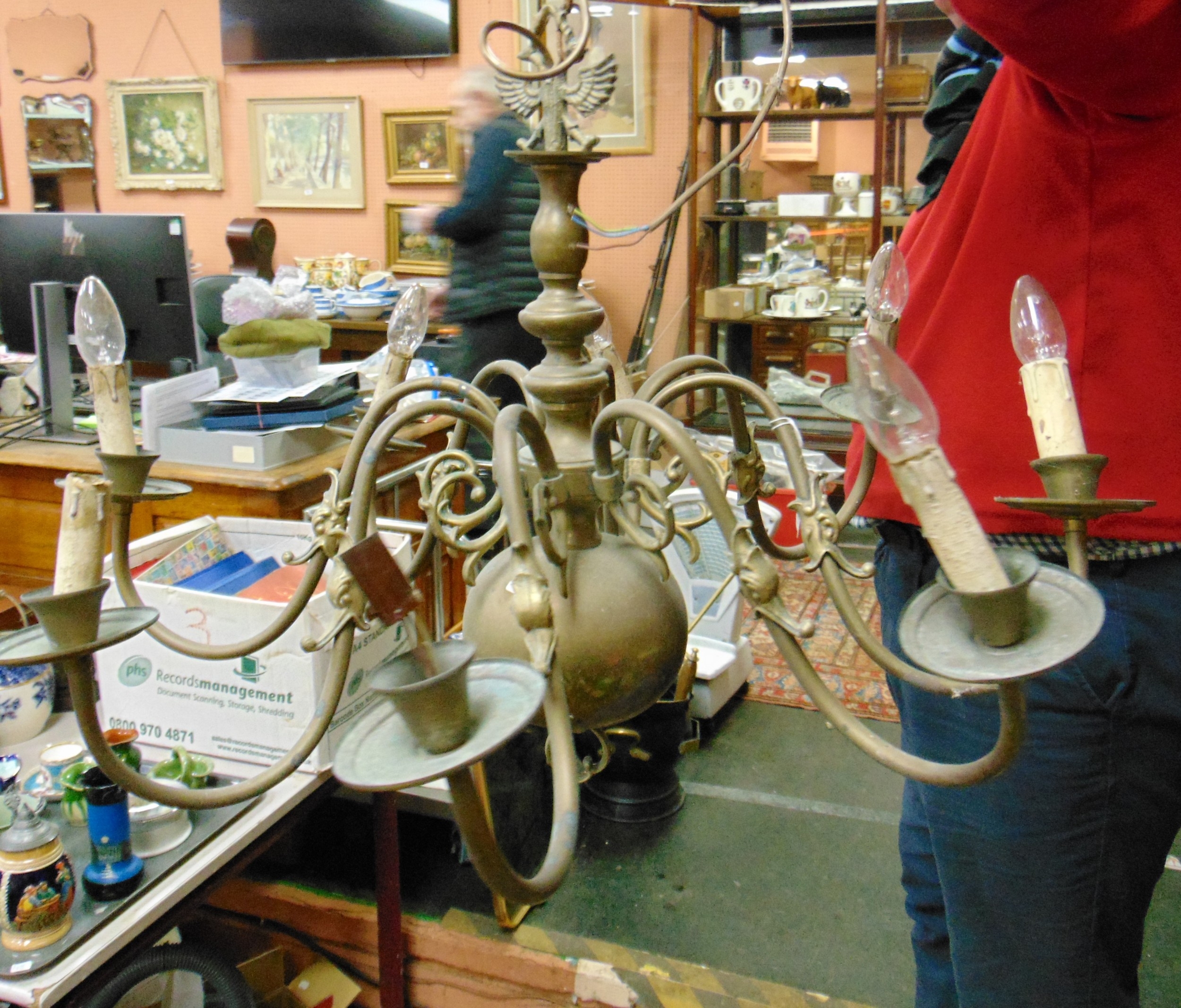 A brass eight branch light fitting, of shaped form.