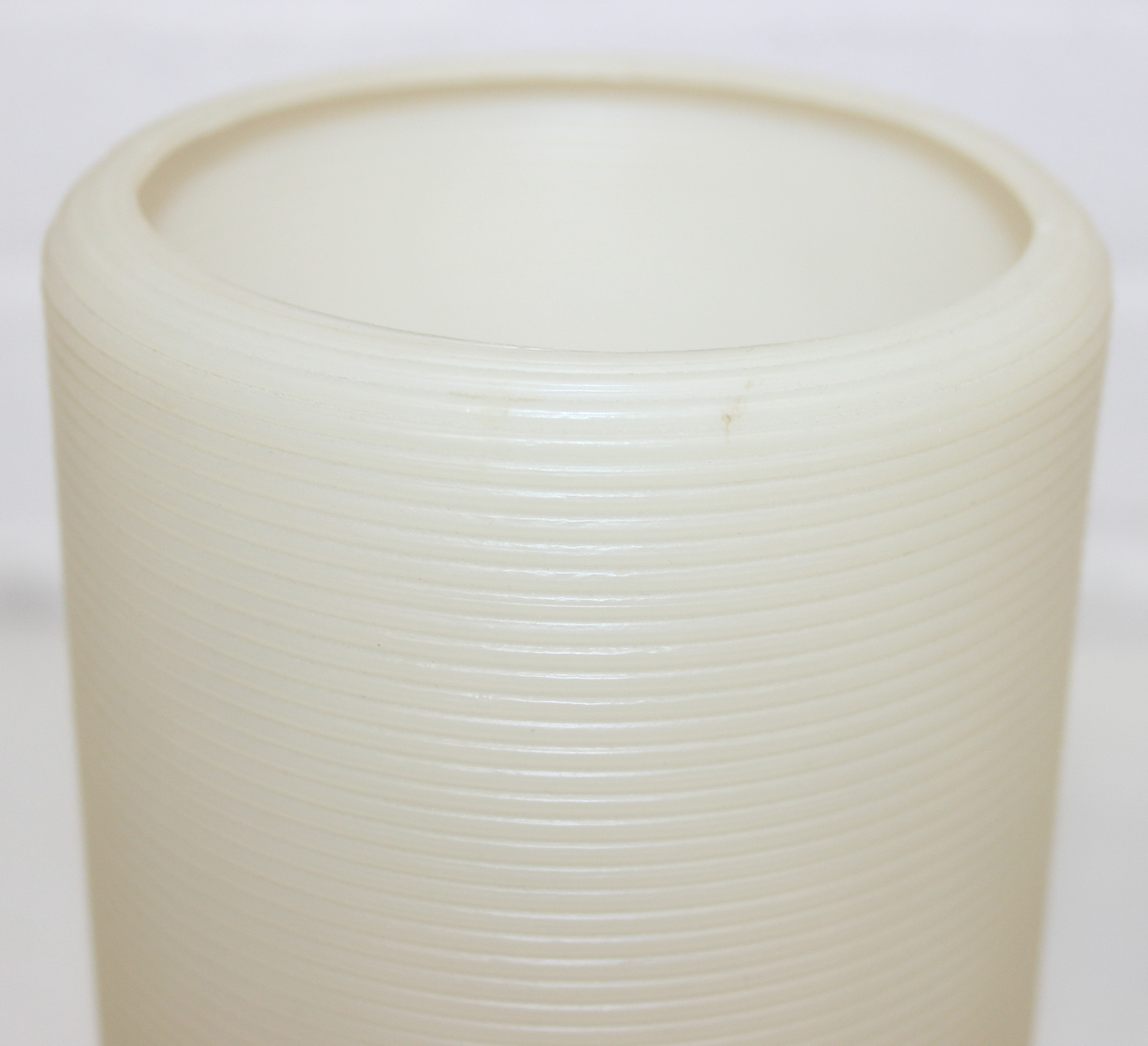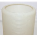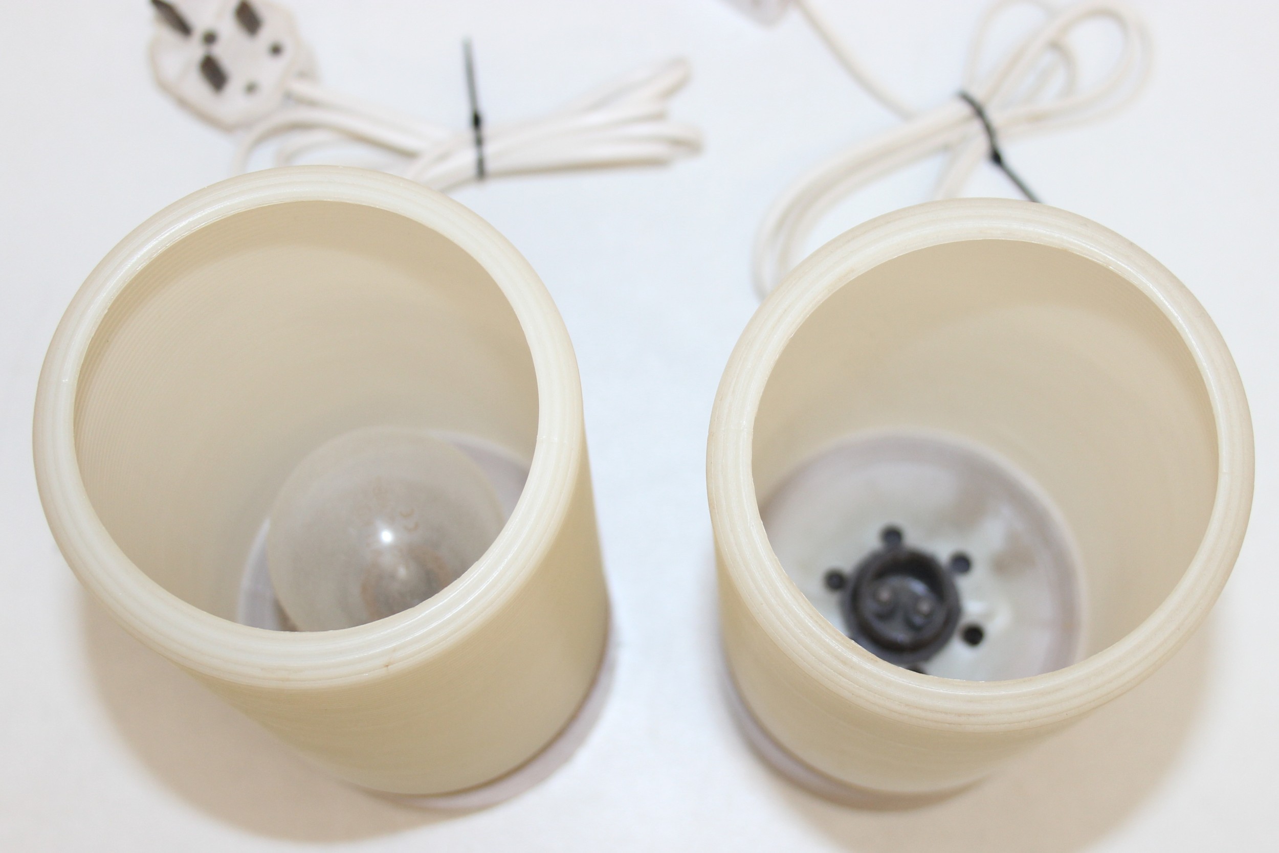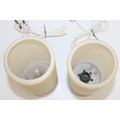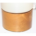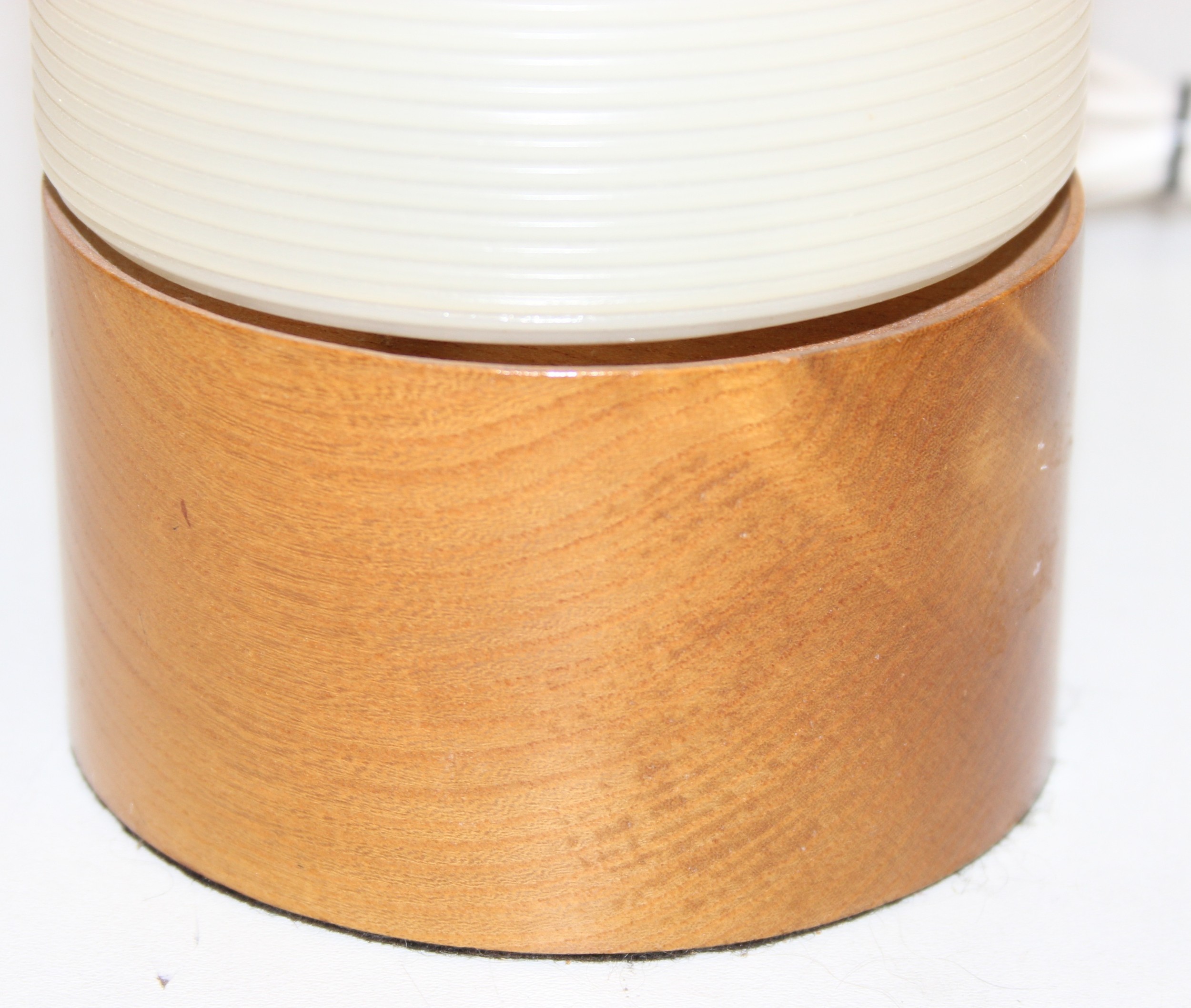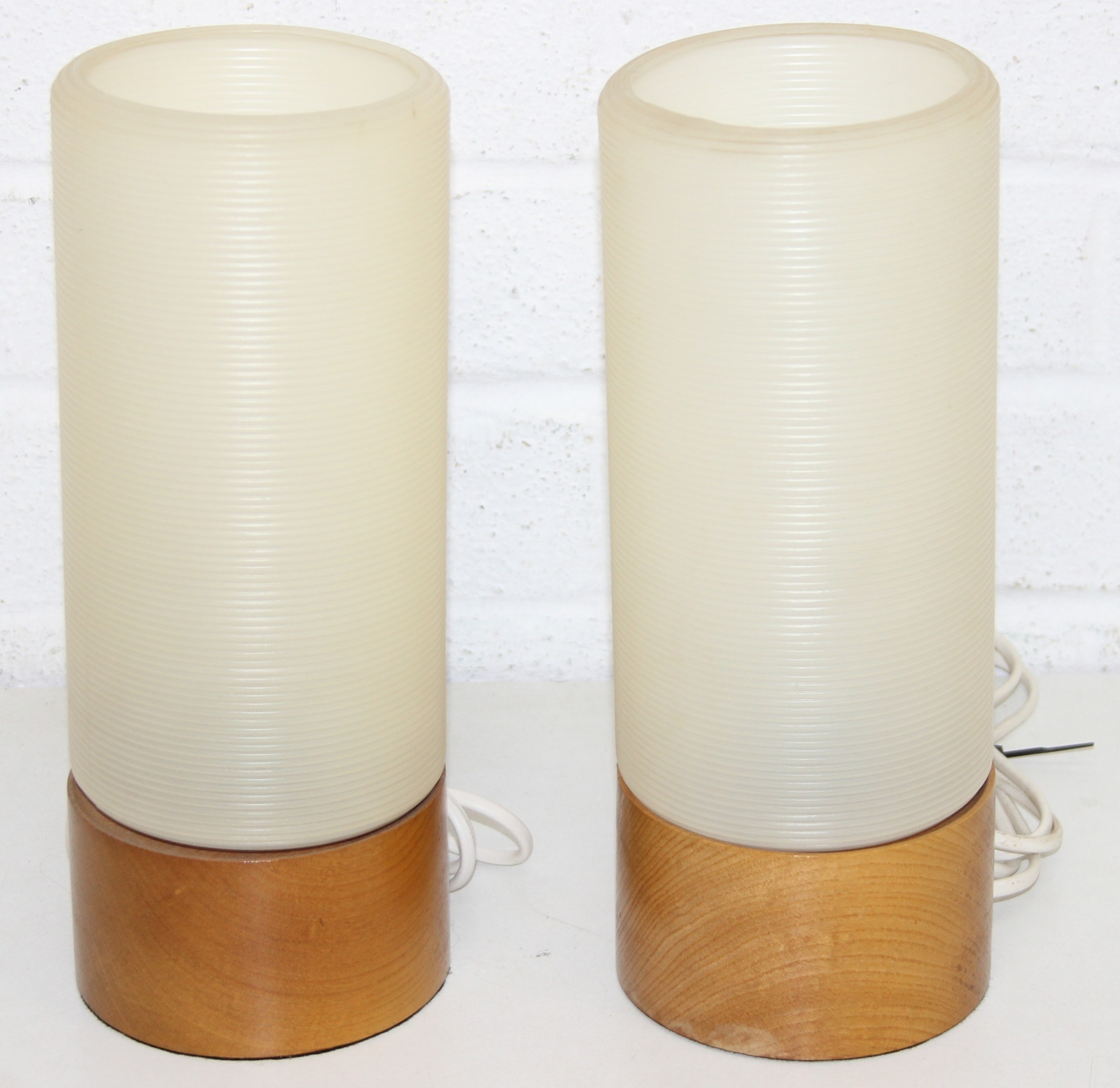 A pair of retro rocket style table lamps with wooden bases and ribbed white plastic shades, each 28cm tall
