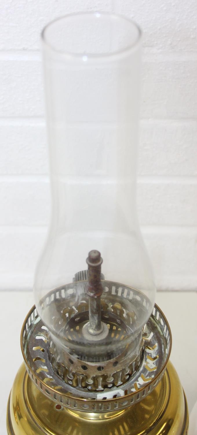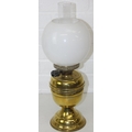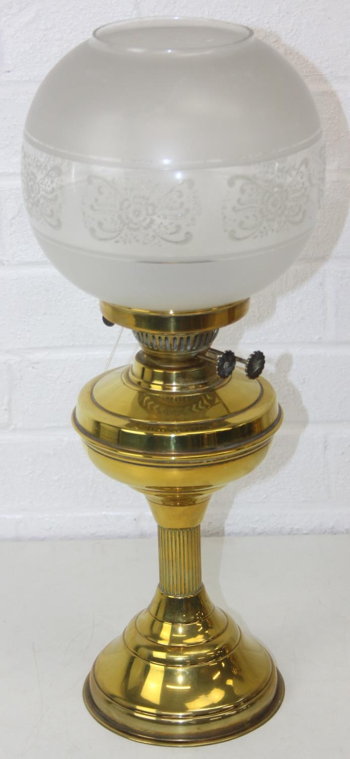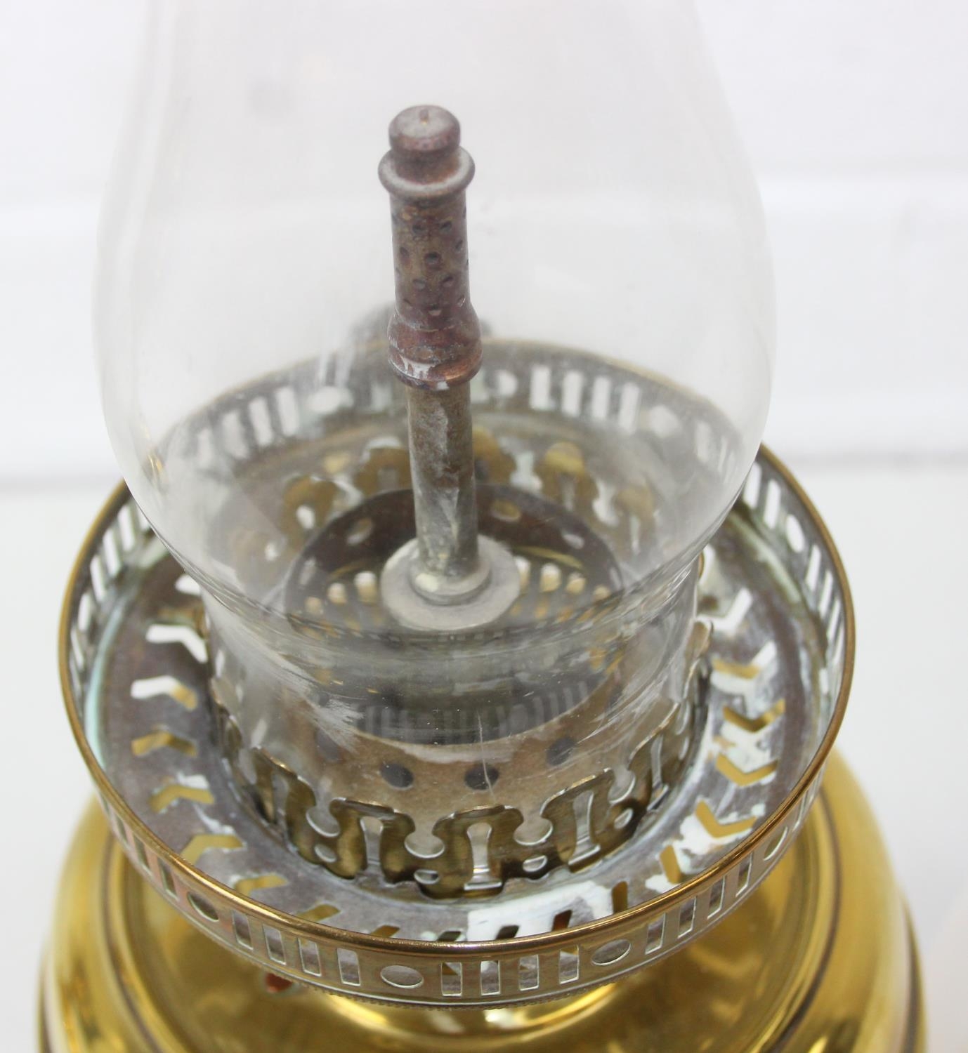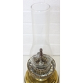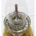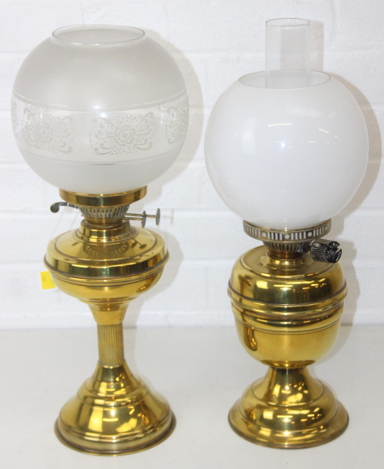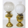 Two brass and glass lamps, one an oil lamp and the other a gas lamp, one with chimney but both with shades, the largest 50cm tall [2]