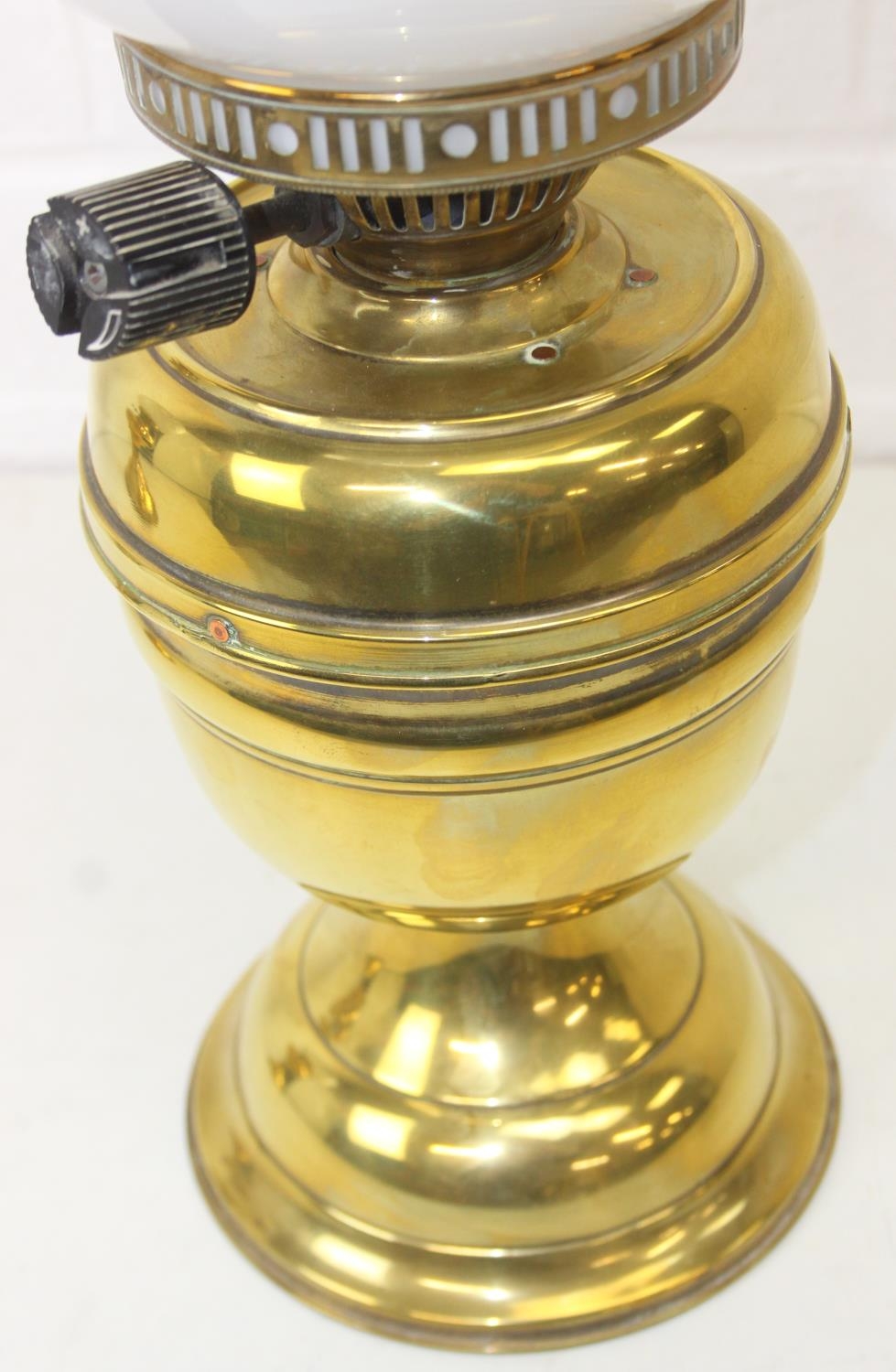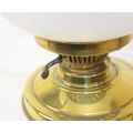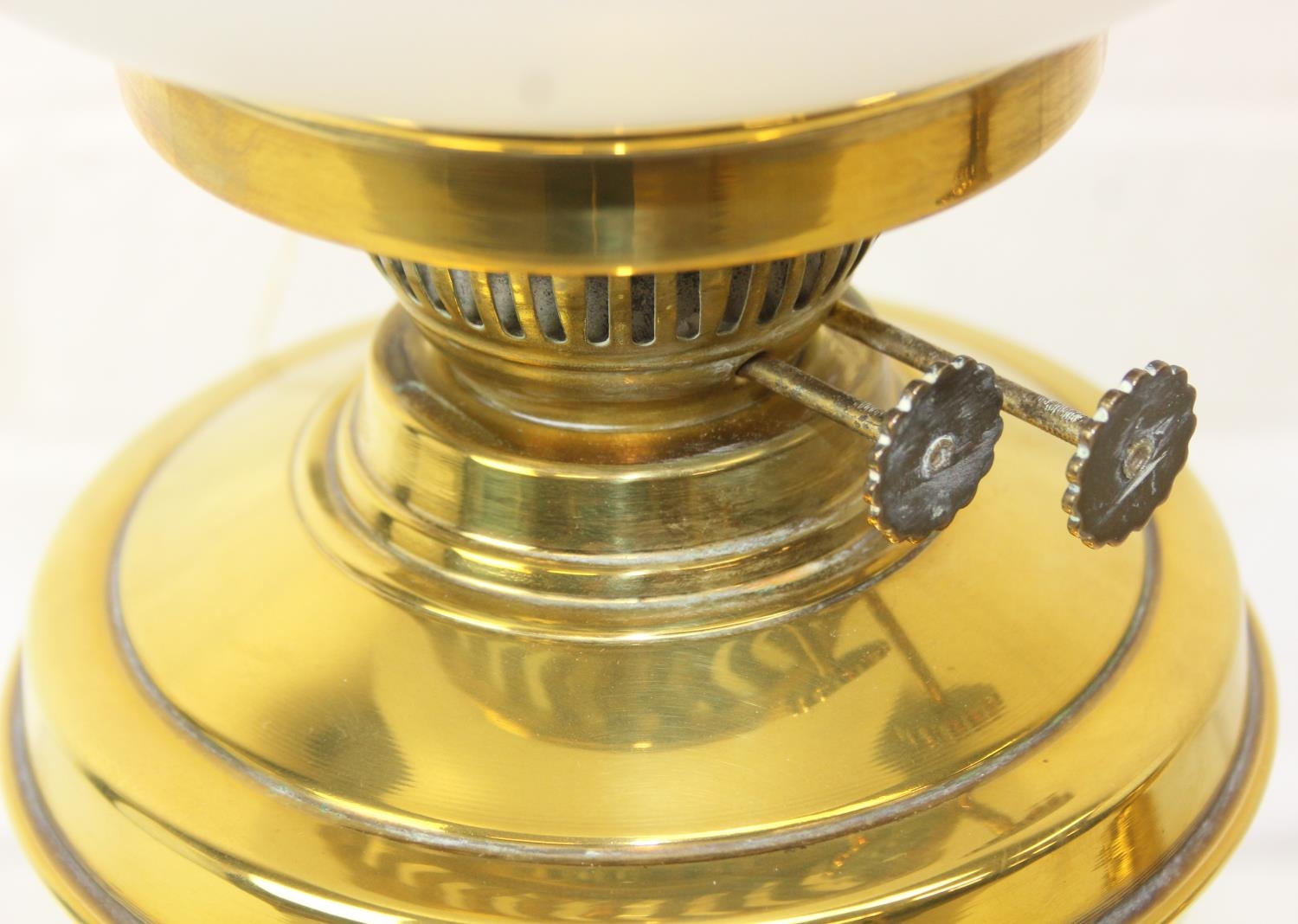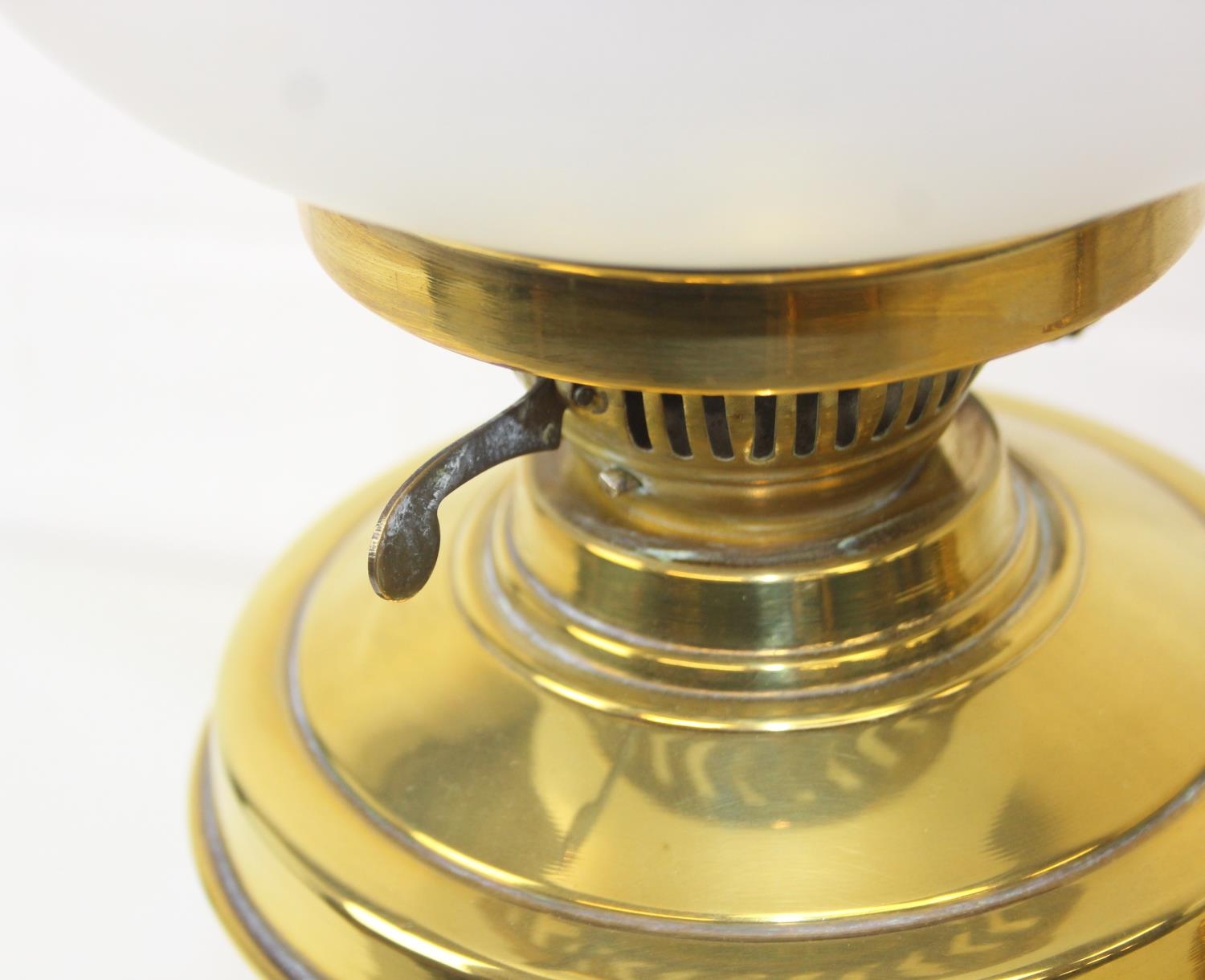 Two brass and glass lamps, one an oil lamp and the other a gas lamp, one with chimney but both with shades, the largest 50cm tall [2]
