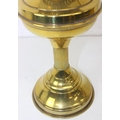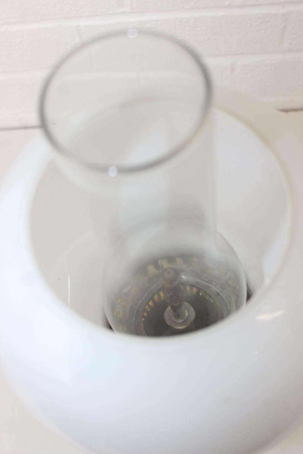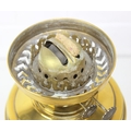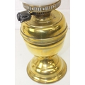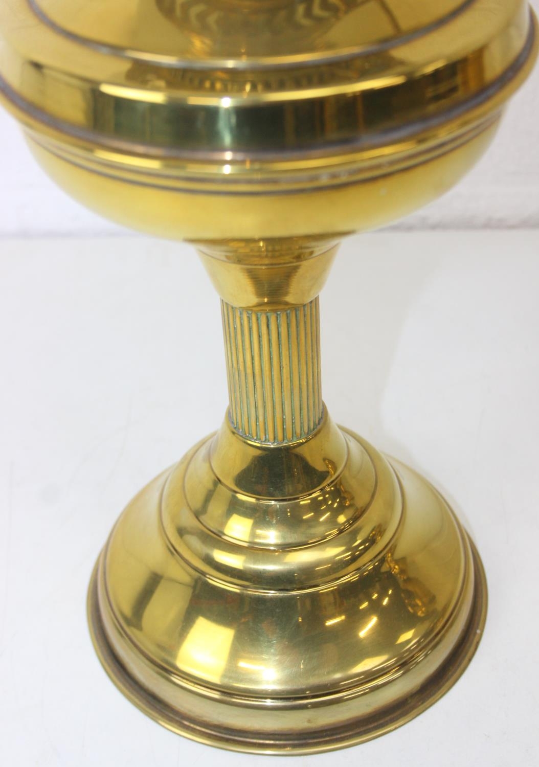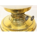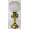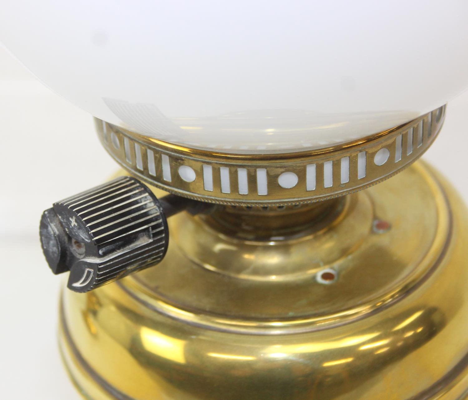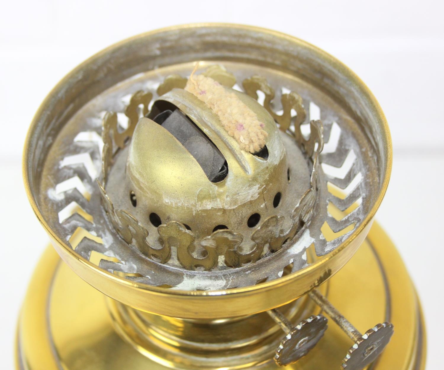 Two brass and glass lamps, one an oil lamp and the other a gas lamp, one with chimney but both with shades, the largest 50cm tall [2]