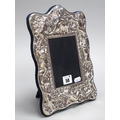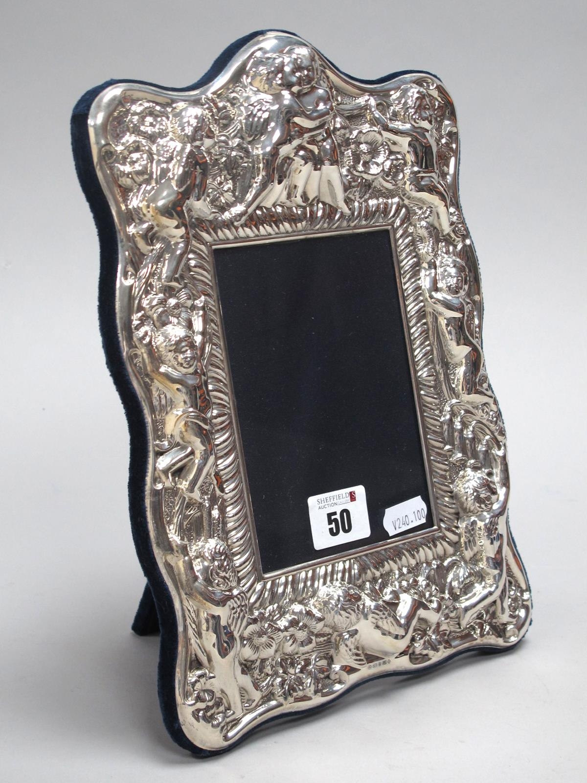 A Modern Highly Decorative Hallmarked Silver Mounted Photograph Frame, RC (Carrs), Sheffield 2000, of shaped design, profusely detailed in relief with winged cherubs and flowerheads, on dark blue plush easel back, overall height 28cm, boxed.