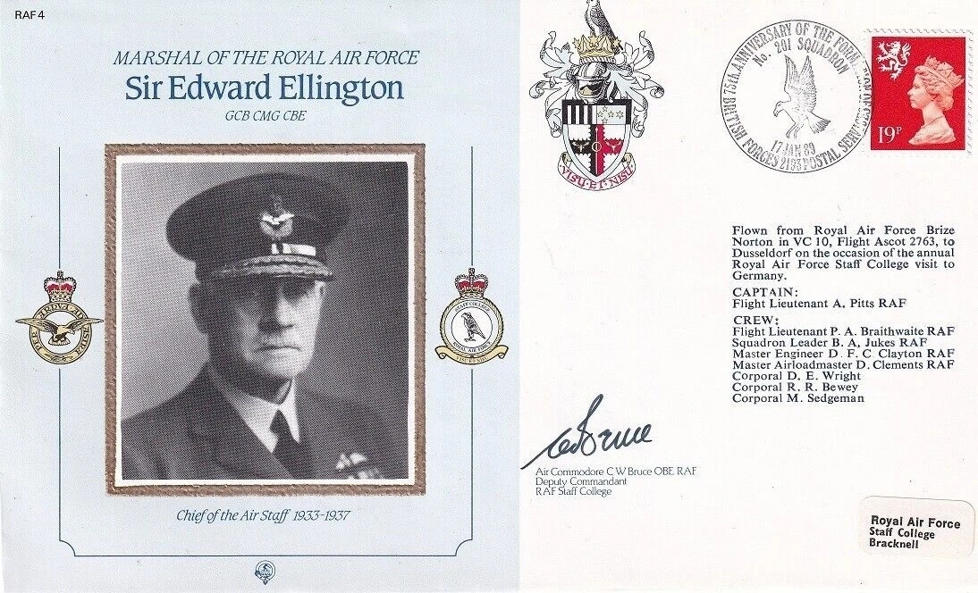 CMD4a MRAF Sir Edward Ellington Signed. Air vice Marshal Bryant. 17 Jan 89 BFPS 2193 MRAF Sir Edward Ellington Flown in VC 10 Personally Signed Air vice Marshal Bryant. Deputy Commandant RAF Staff College. Certified Copy No 0368 of 1500 Signed Gp Capt W S O Randle WW11 Wellington Pilot Shot Down and made his way home. Single Vendor RAF cover collection. Good condition. All autographs come with a Certificate of Authenticity. We combine postage on multiple winning lots and can ship worldwide. UK postage from £5.99, EU from £7.99, Rest of World from £9.99