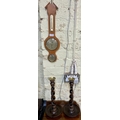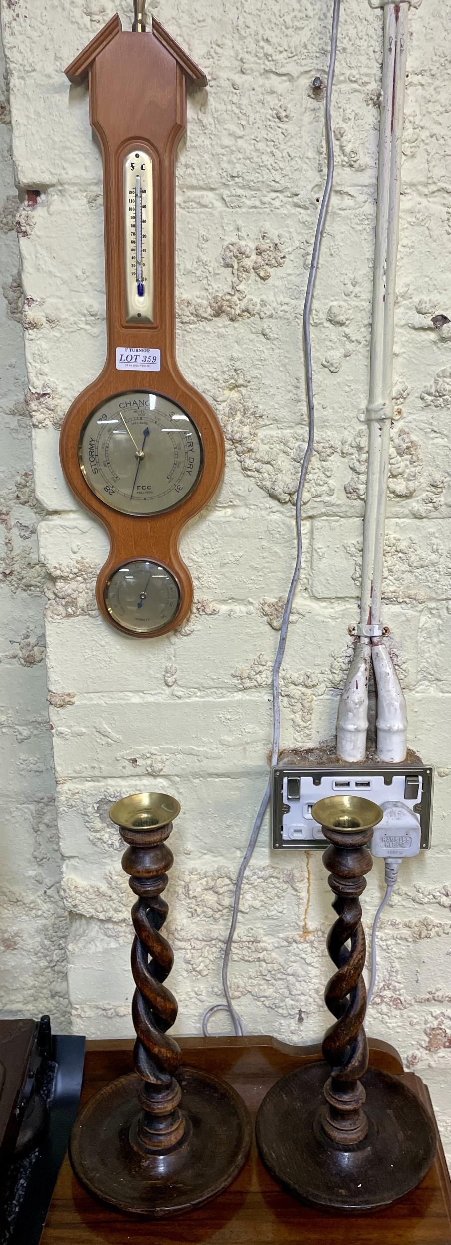 WOODEN CASED BAROMETER AND A PAIR OF OAK TWIST CANDLESTICK WITH BRASS SCONCES