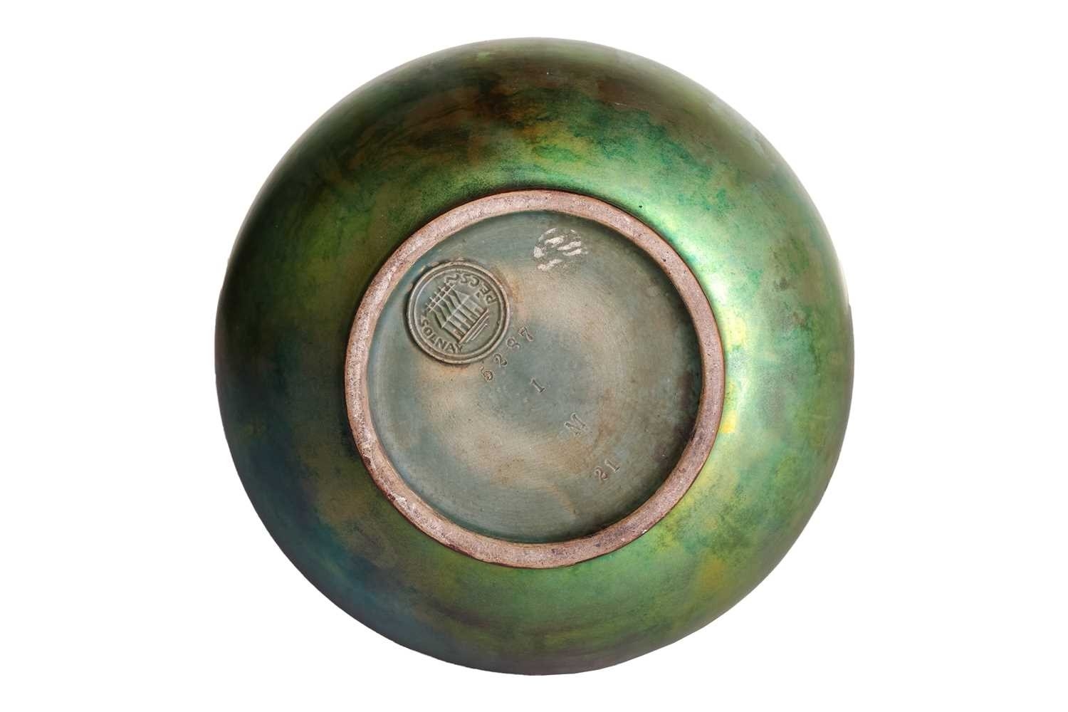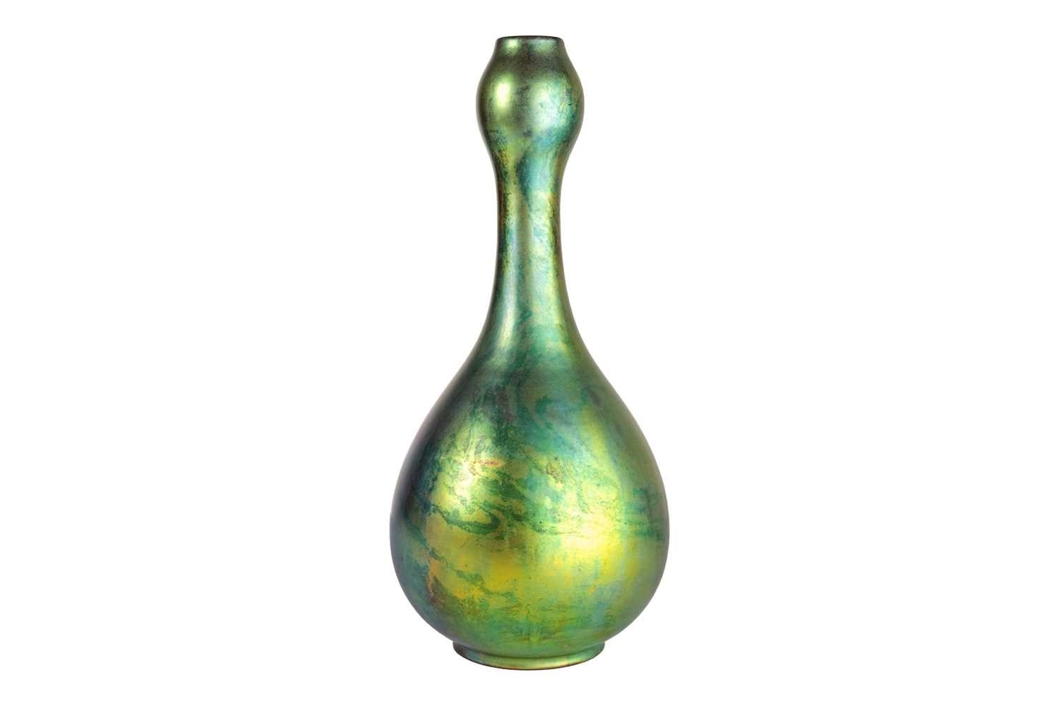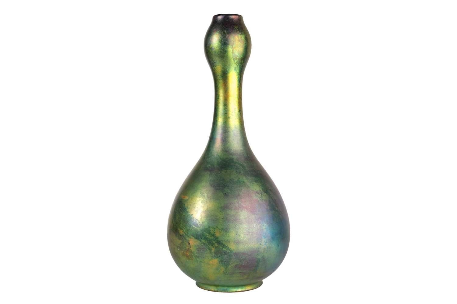 A large and impressive Zsolnay Pecs double gourd Eosin glaze vase, 1900-1910, possibly by Tádé Sikorsky, embossed marks and numbered 5287 M 21 to the underside, 40 cm high.