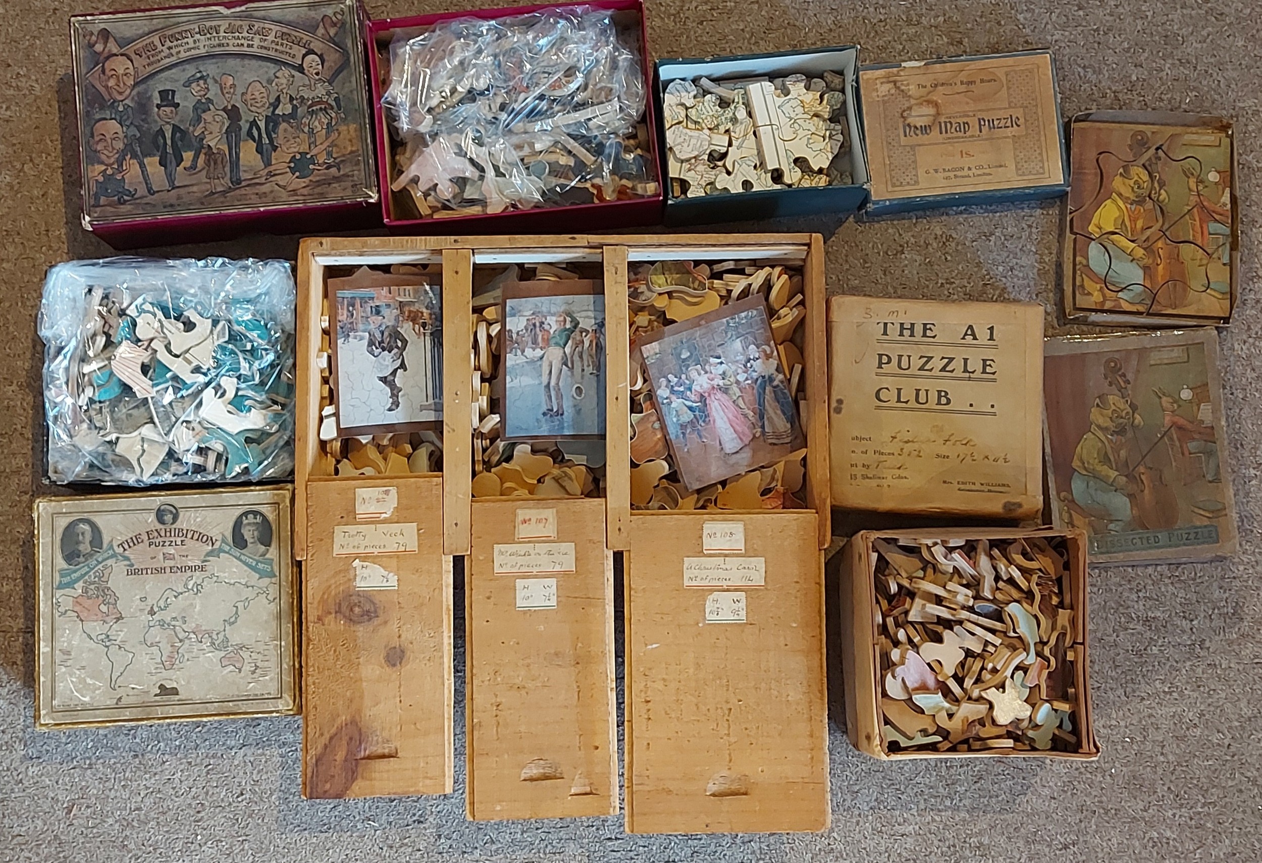 An Early Jigsaw puzzle The Exhibition Puzzle of The British Empire together with a collection of early wooden puzzles to include maps