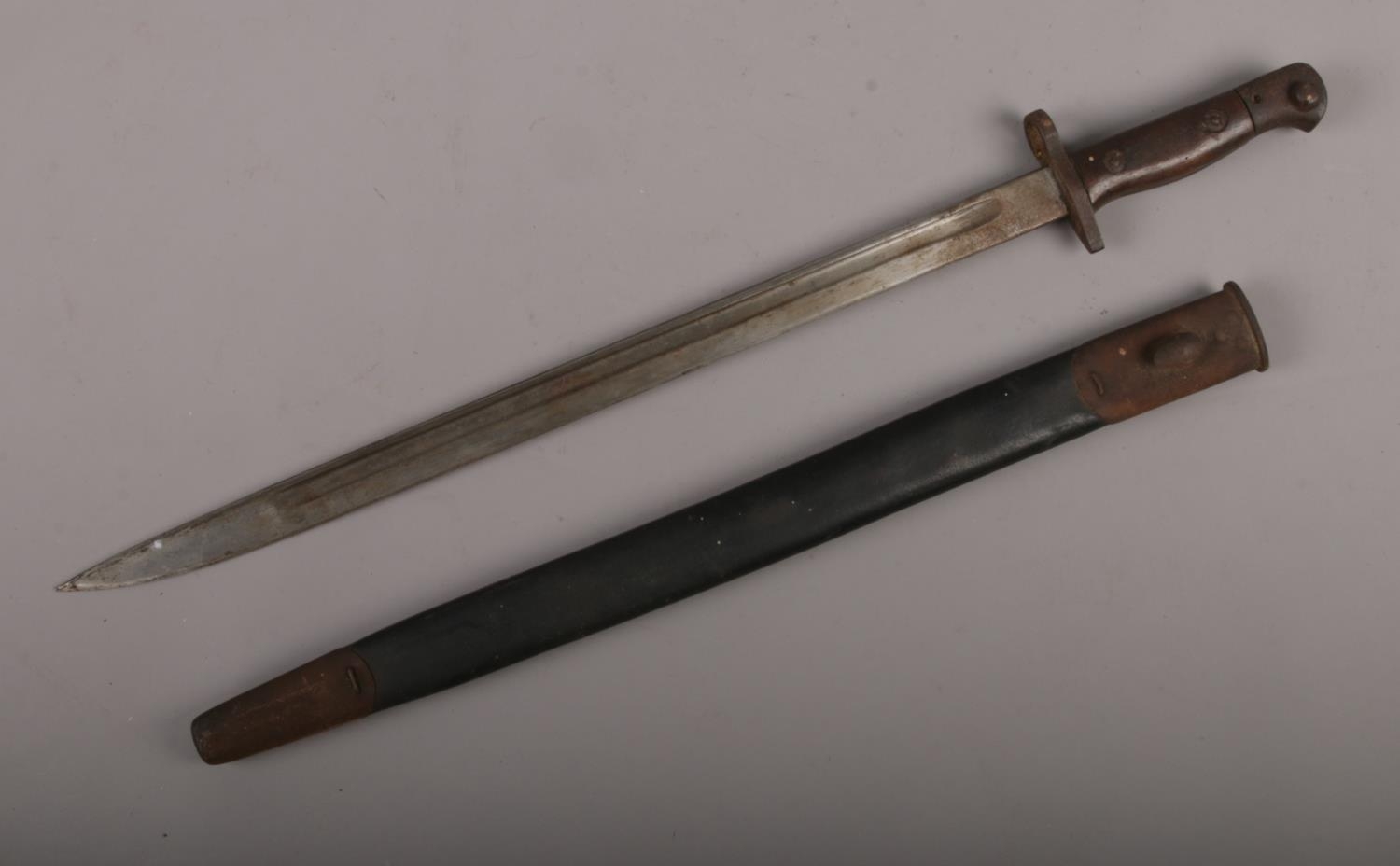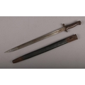 A sword bayonet in leather scabbard. Unmarked, blade length 43.5cm.