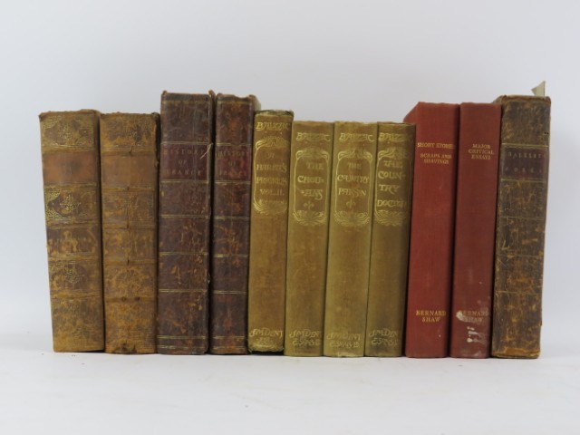 Various antique novel books and The History of France, Volumes I & III. Books include ‘Bernard Shaw’s ‘Major Critical Essays’ and ’Short Stories - Scraps and Engravings’ dated 1932, Thomas Chalkley - ‘A Collection of Works’, dated 1791 and four books by Honoré de Balzac. (11 items) cm tallest height.