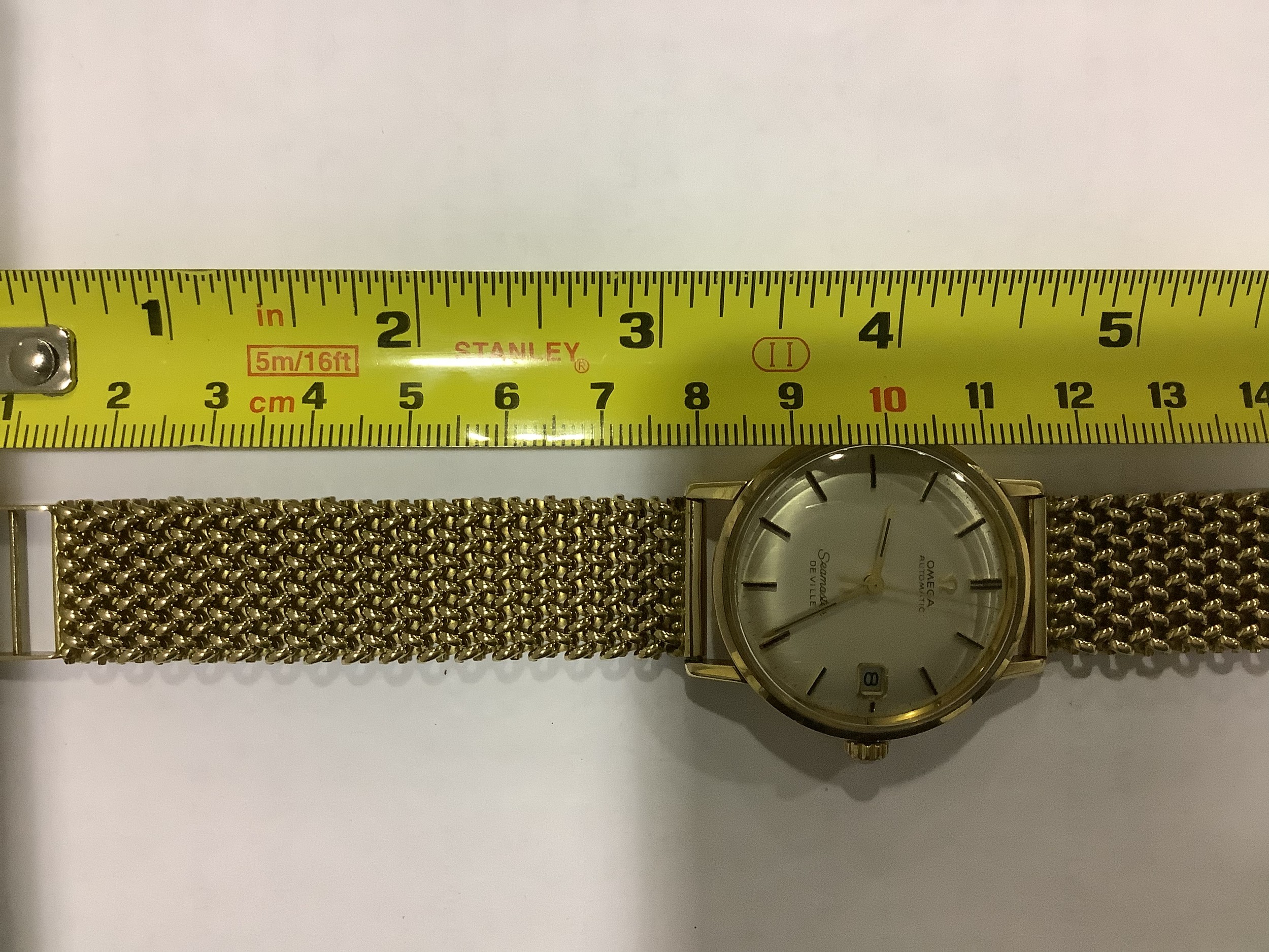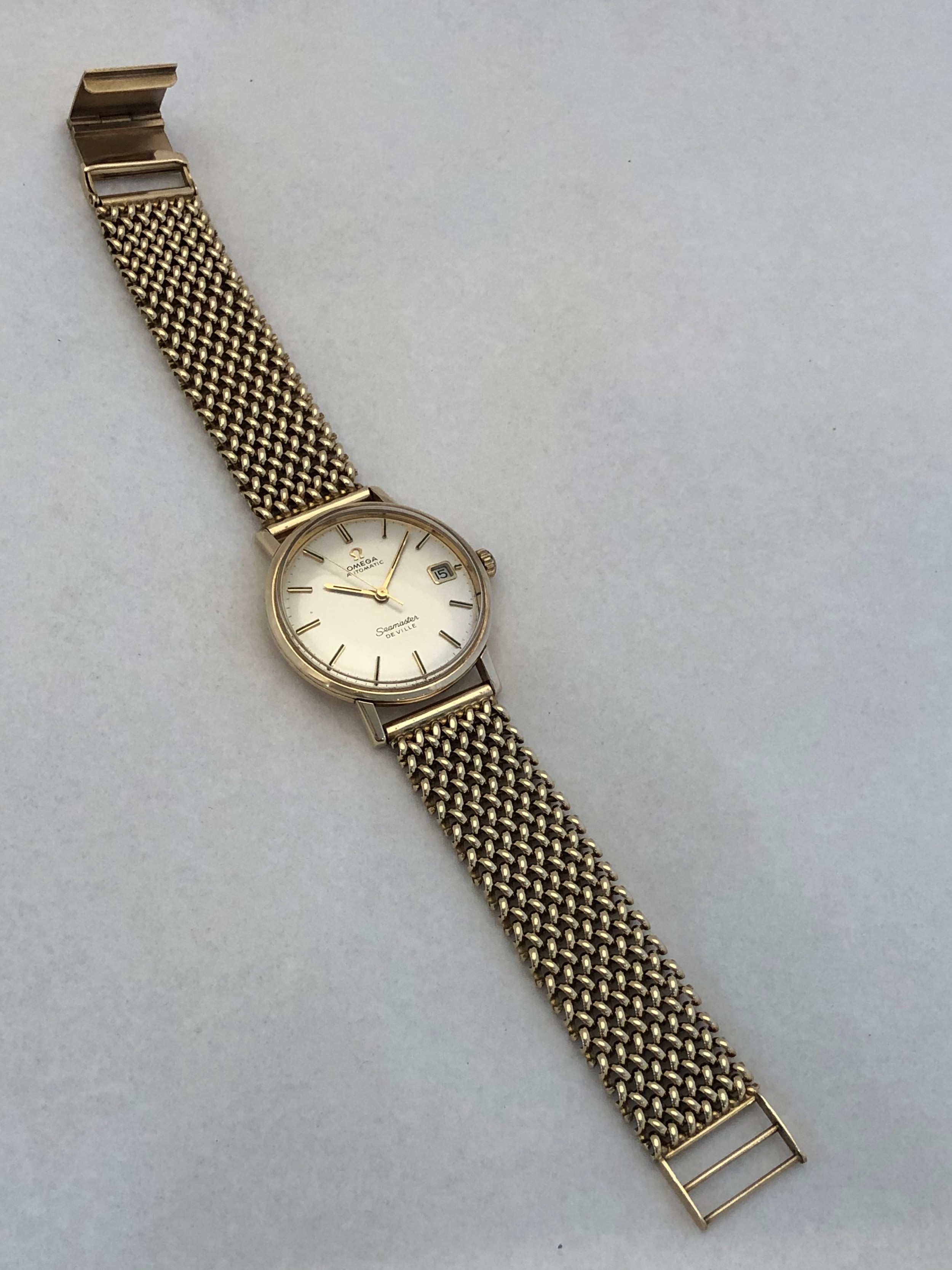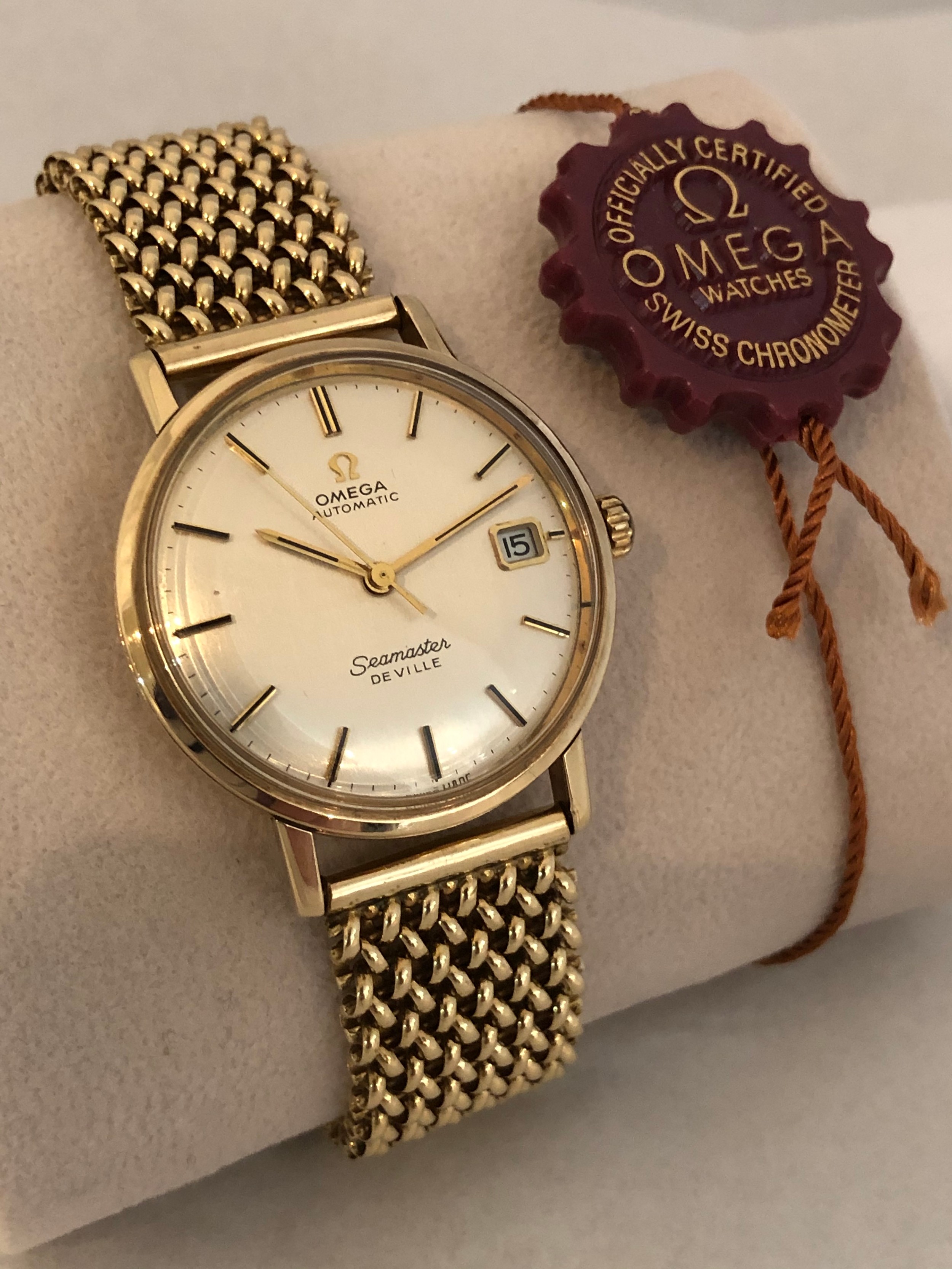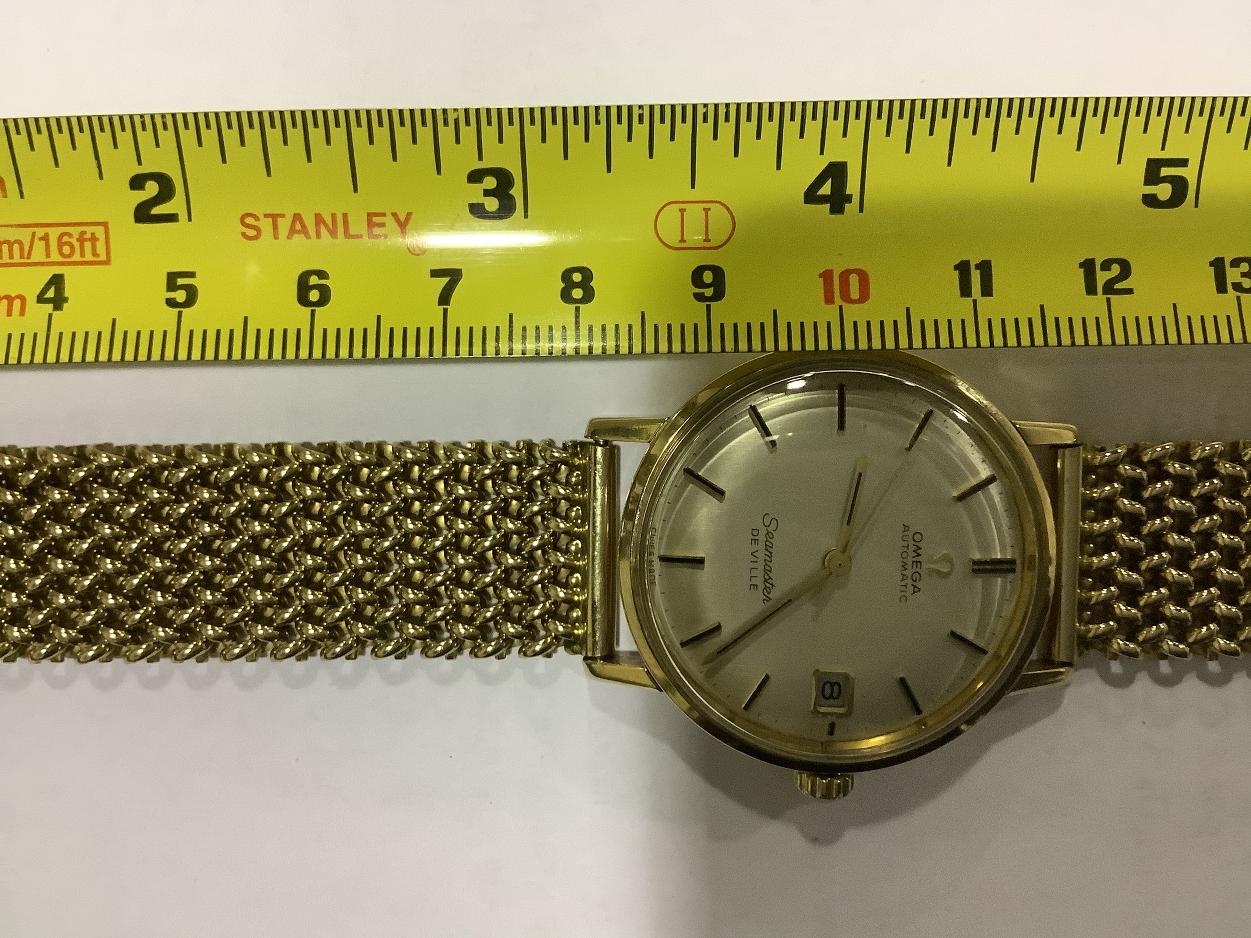 A gents 9ct gold cased Omega Seamaster De Ville automatic wristwatch, the silvered dial with applied gold batons denoting hours and date aperture at 3 o’clock position, on later 9ct gold mesh bracelet, 34mm case diameter excluding winding crown, in later fitted box, gross weight of watch approximately 60.7g