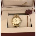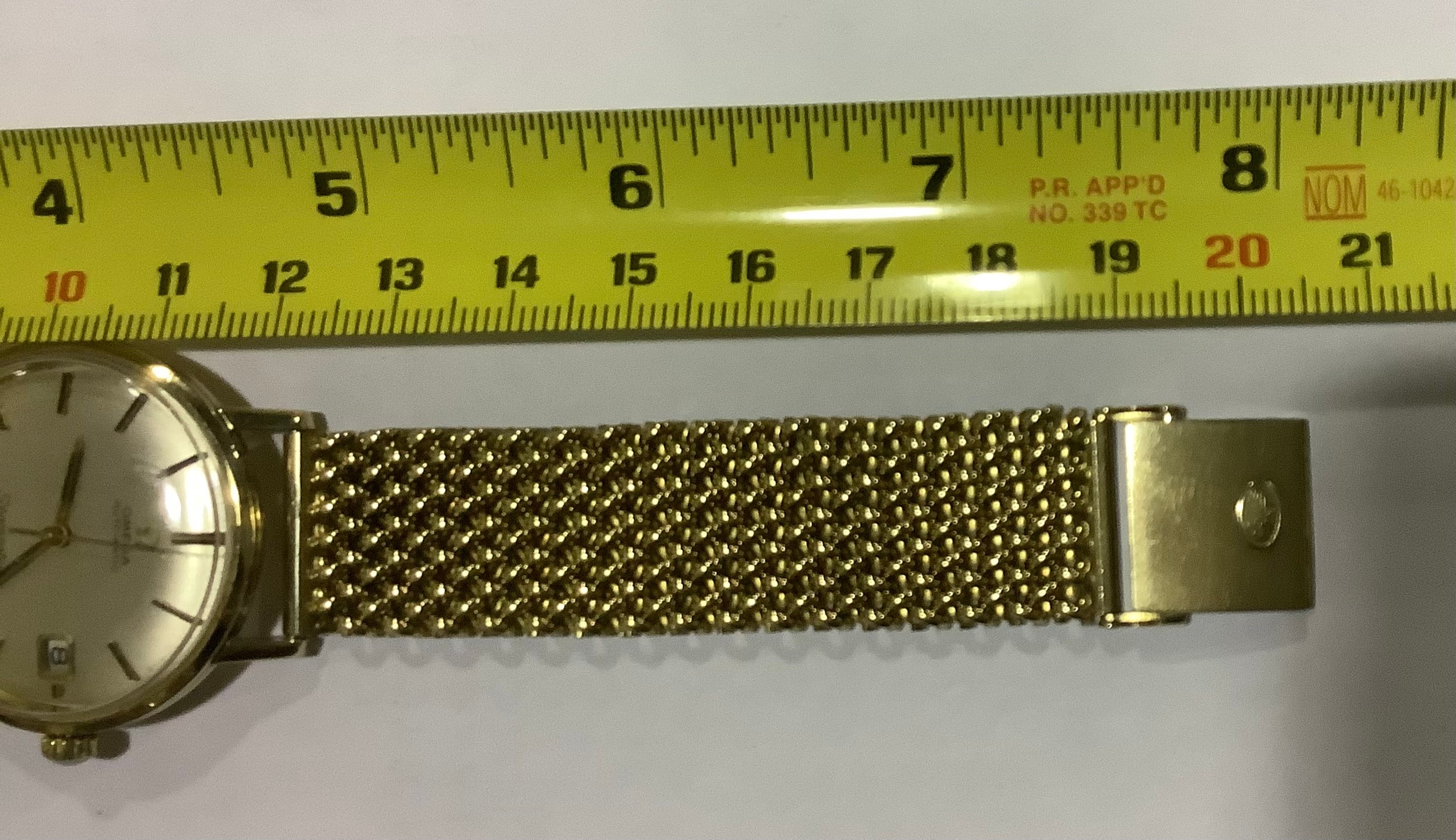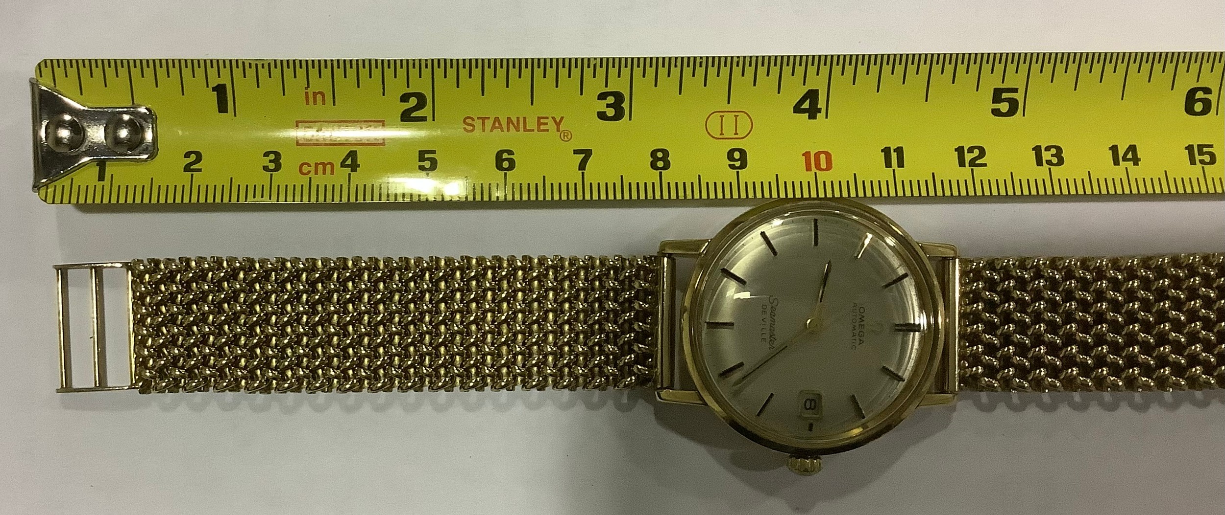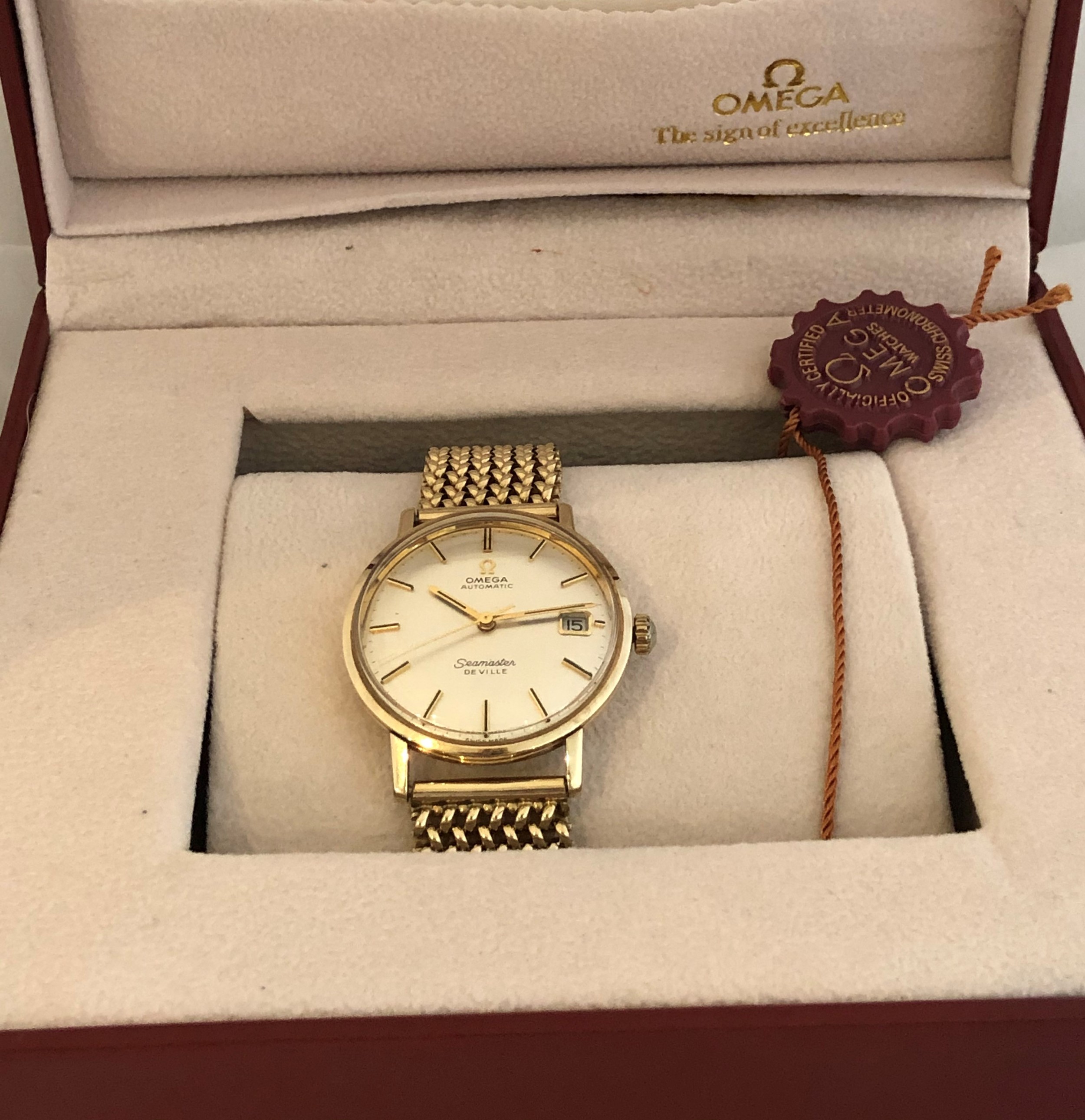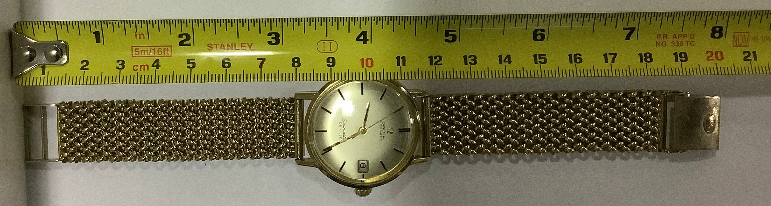 A gents 9ct gold cased Omega Seamaster De Ville automatic wristwatch, the silvered dial with applied gold batons denoting hours and date aperture at 3 o’clock position, on later 9ct gold mesh bracelet, 34mm case diameter excluding winding crown, in later fitted box, gross weight of watch approximately 60.7g