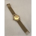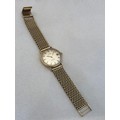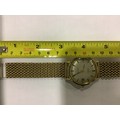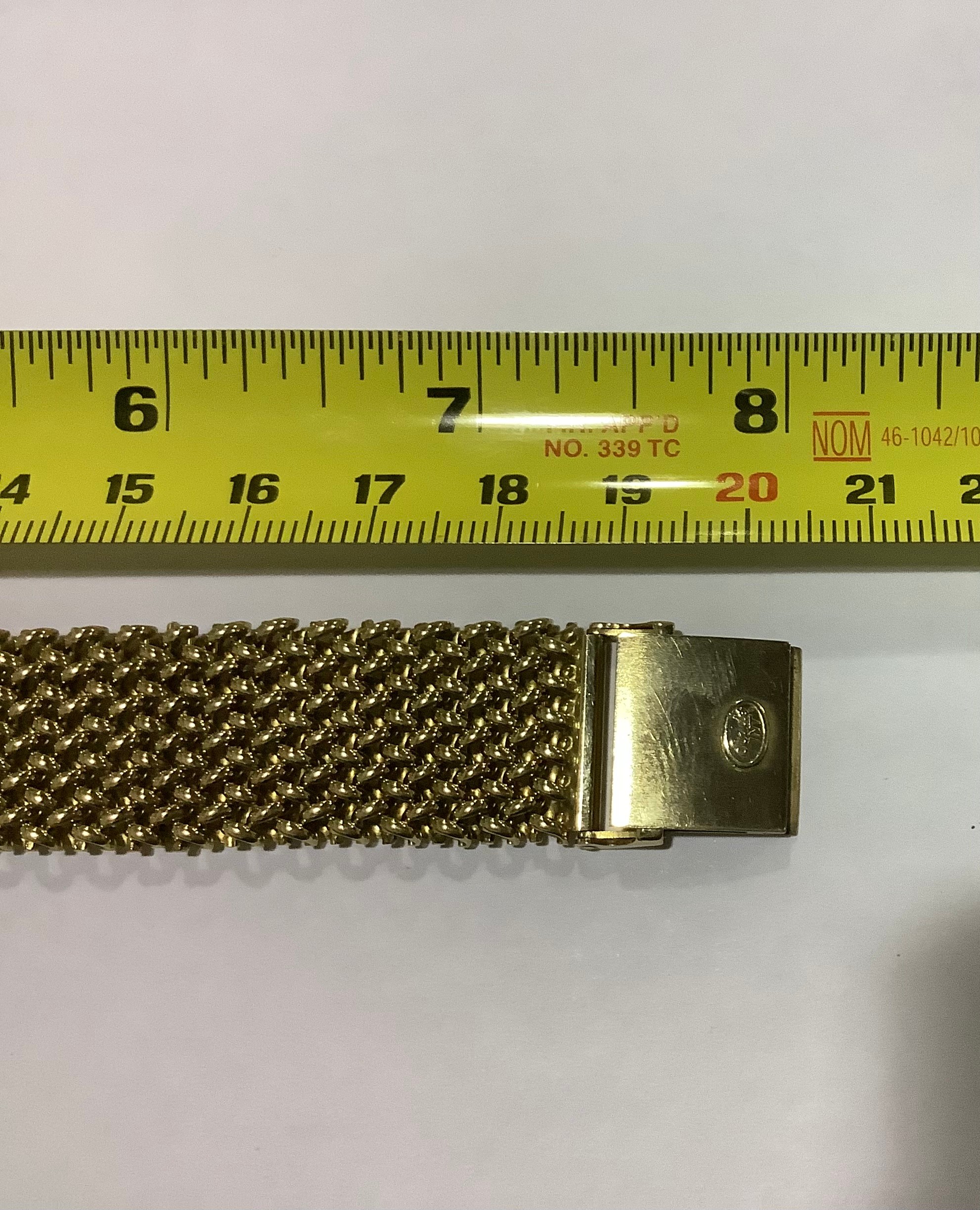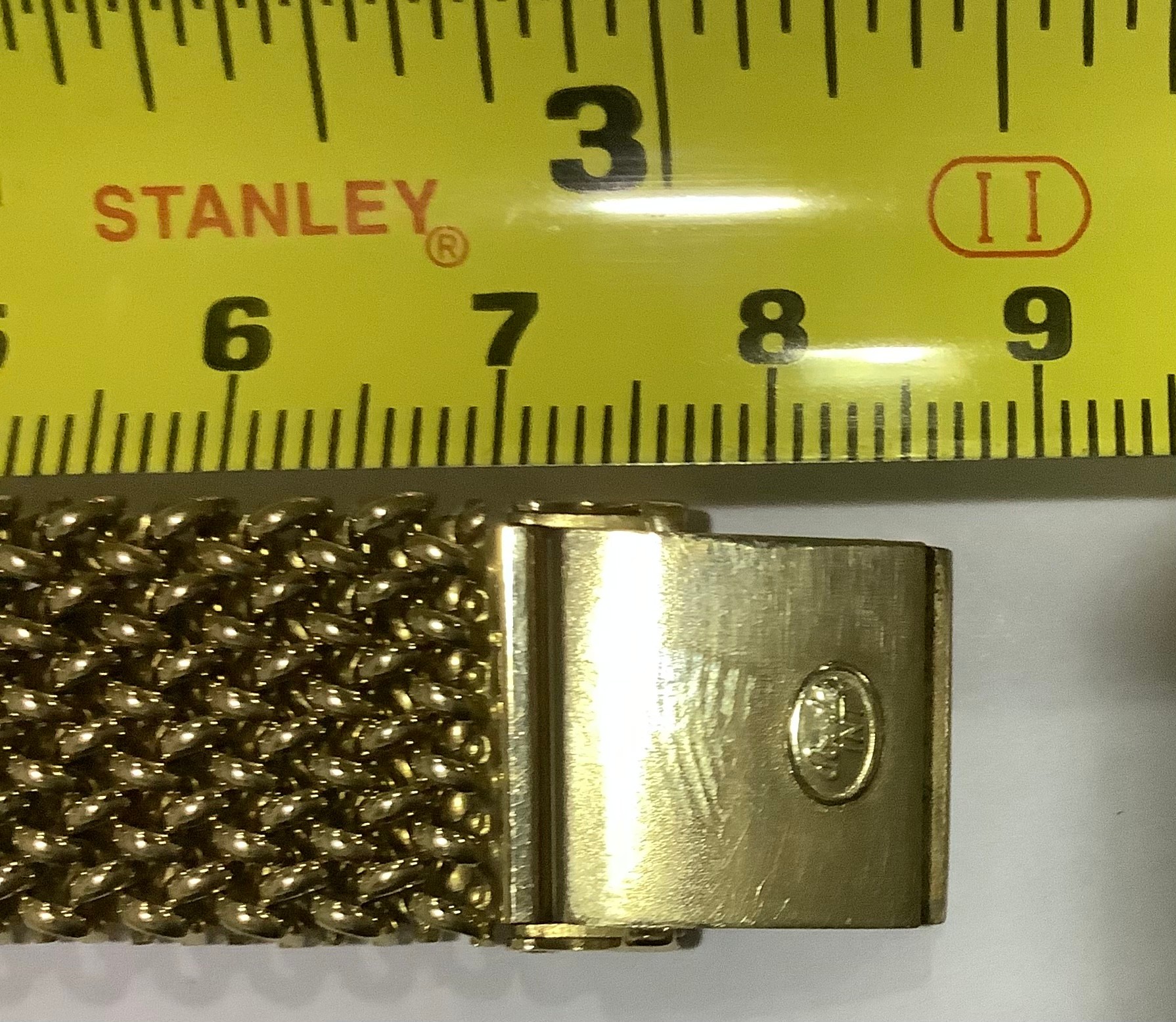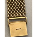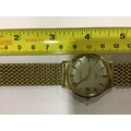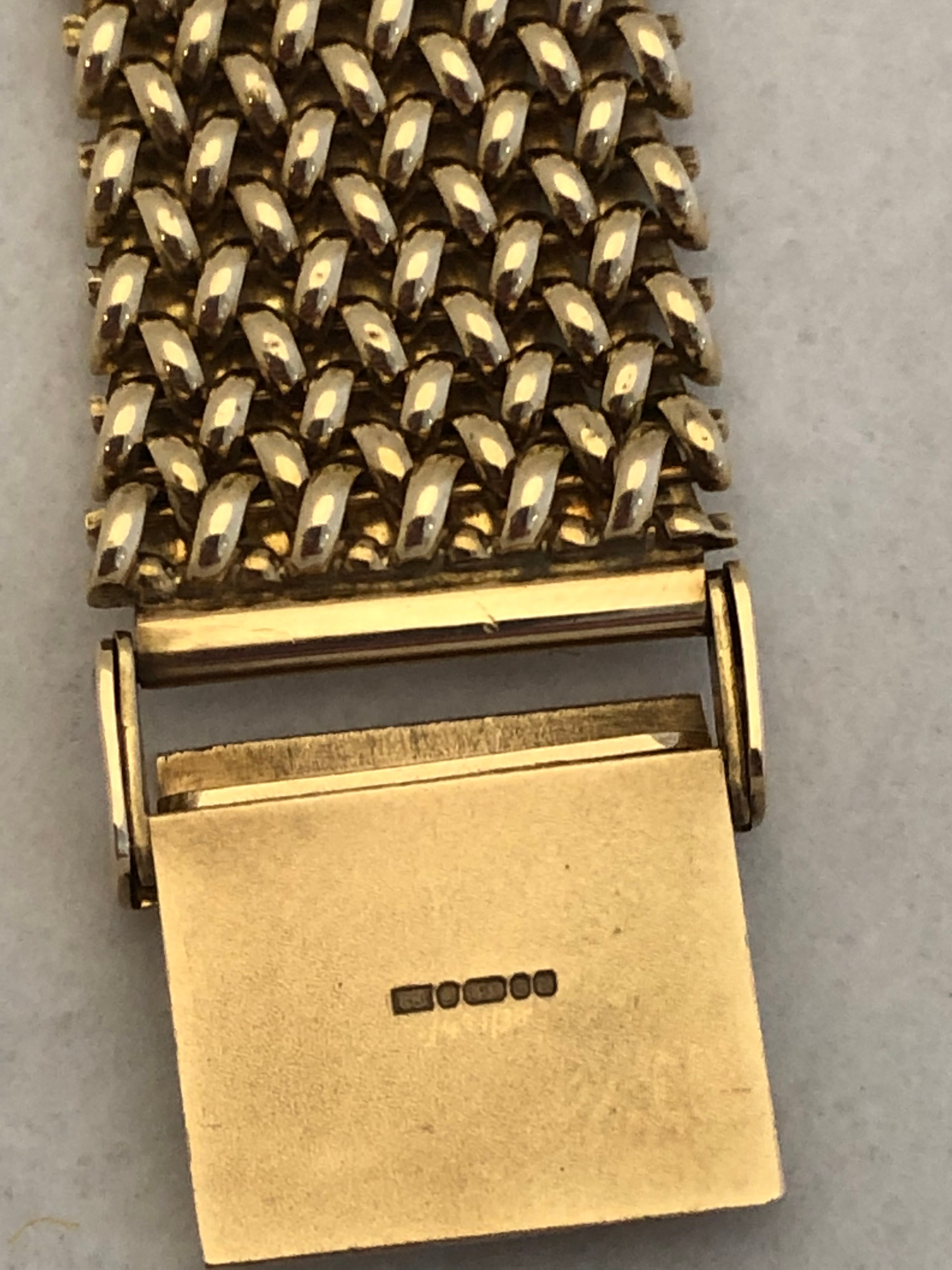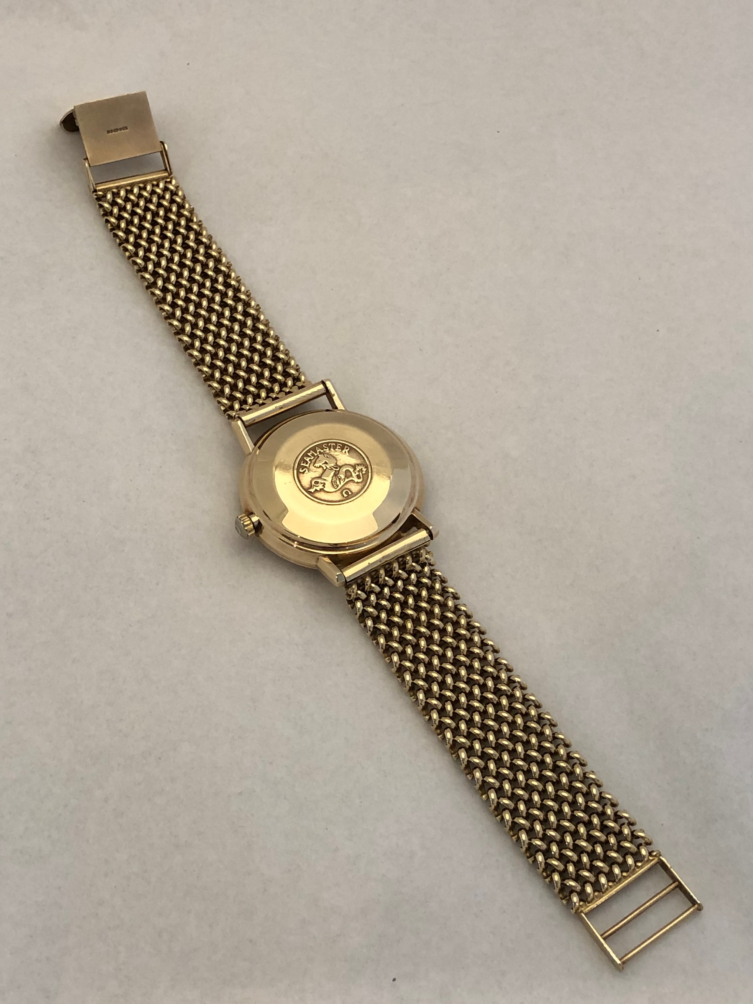 A gents 9ct gold cased Omega Seamaster De Ville automatic wristwatch, the silvered dial with applied gold batons denoting hours and date aperture at 3 o’clock position, on later 9ct gold mesh bracelet, 34mm case diameter excluding winding crown, in later fitted box, gross weight of watch approximately 60.7g