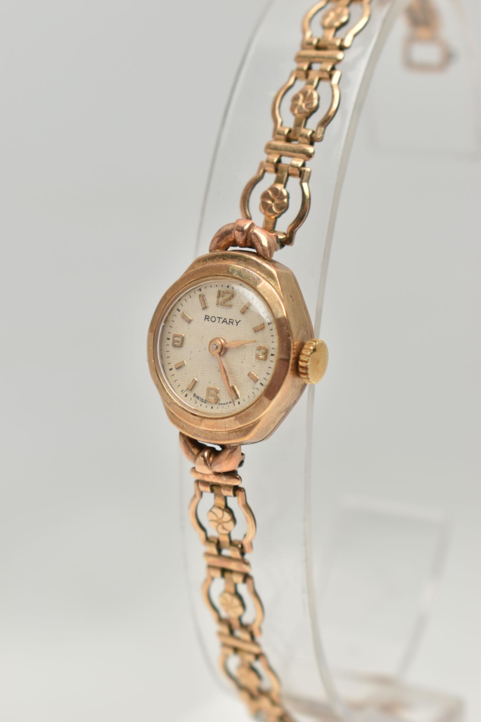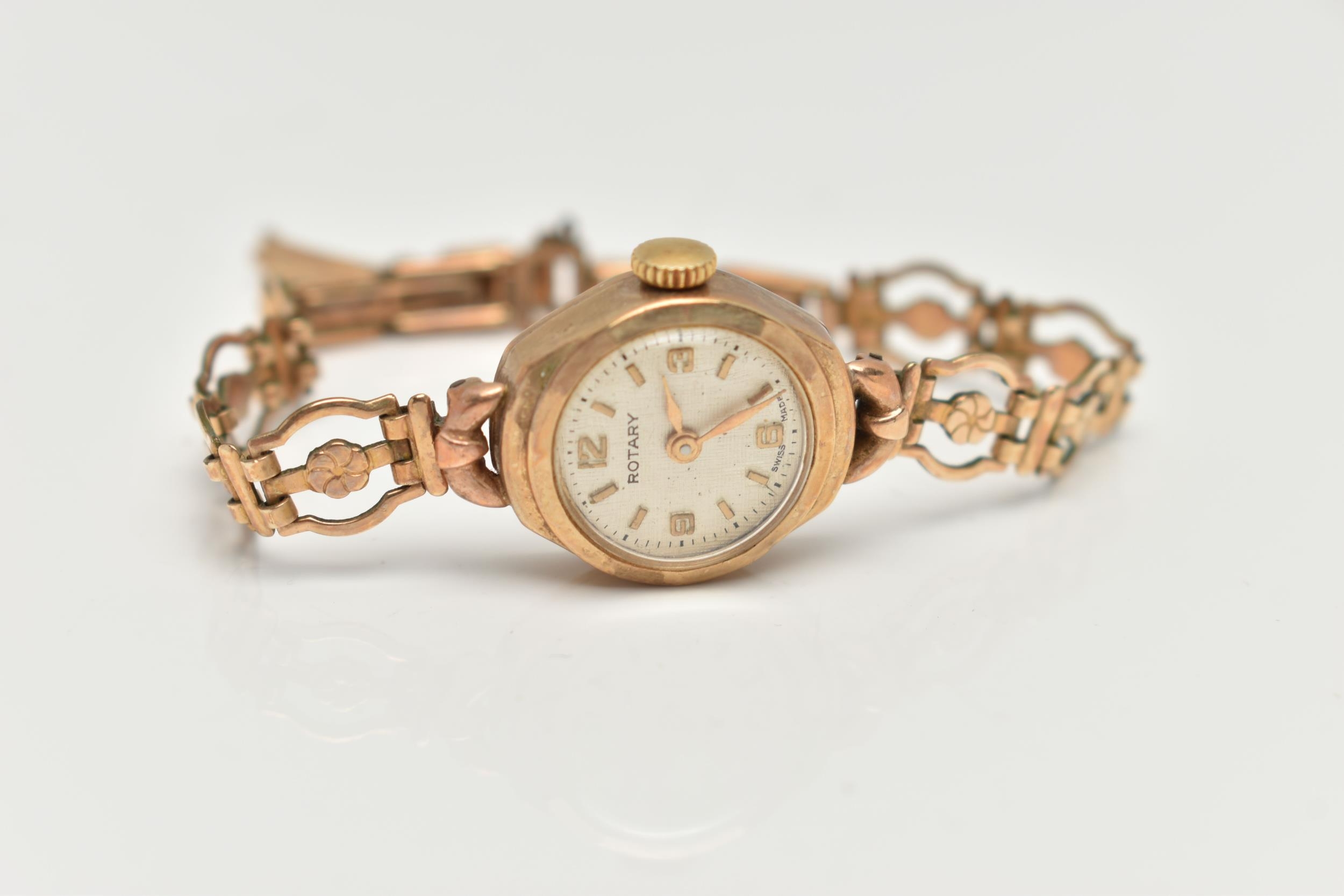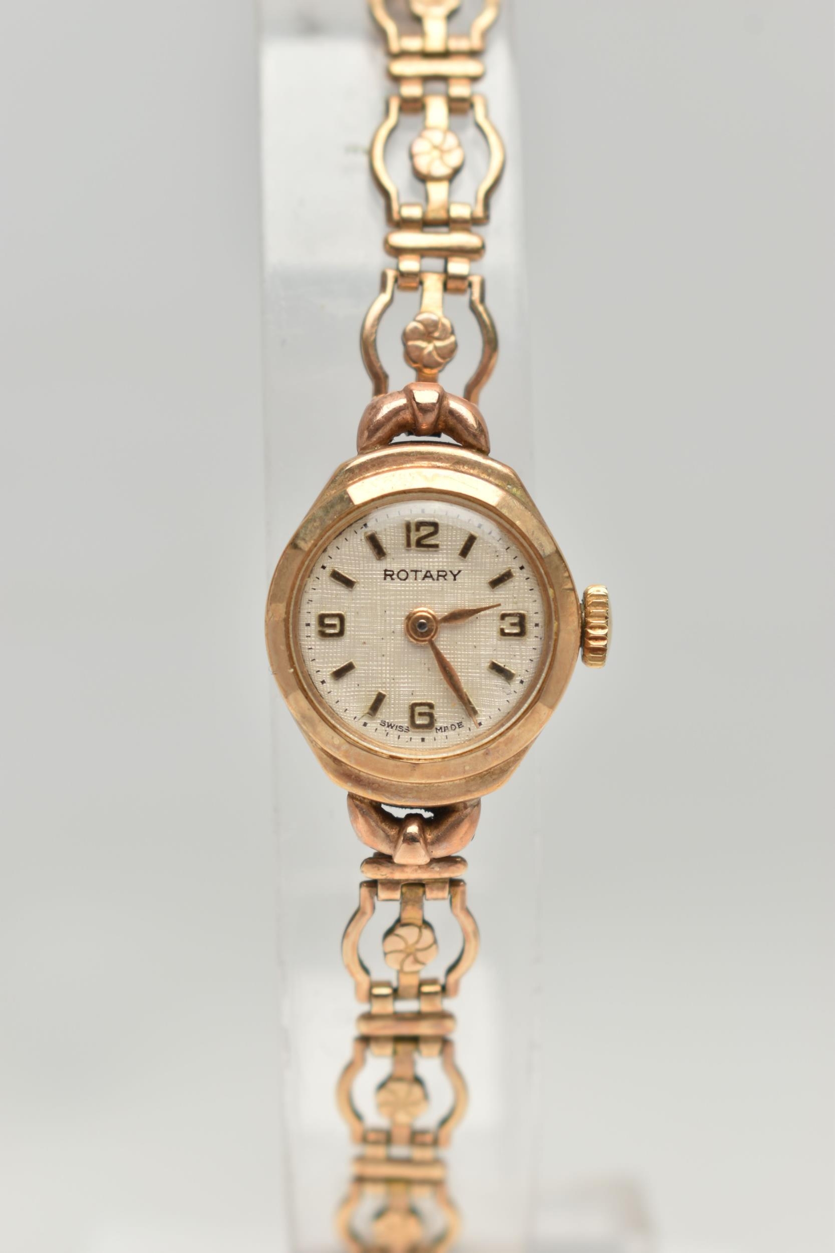 A 9CT GOLD ROTARY WRISTWATCH, hand wound movement, round dial signed 'Rotary', baton and Arabic numerals, inside case back hallmarked 9ct Birmingham London, approximate gross weight of case back 1.3 grams, fitted with a rolled gold bracelet (condition report: general moderate wear, currently working, time keeping not tested)