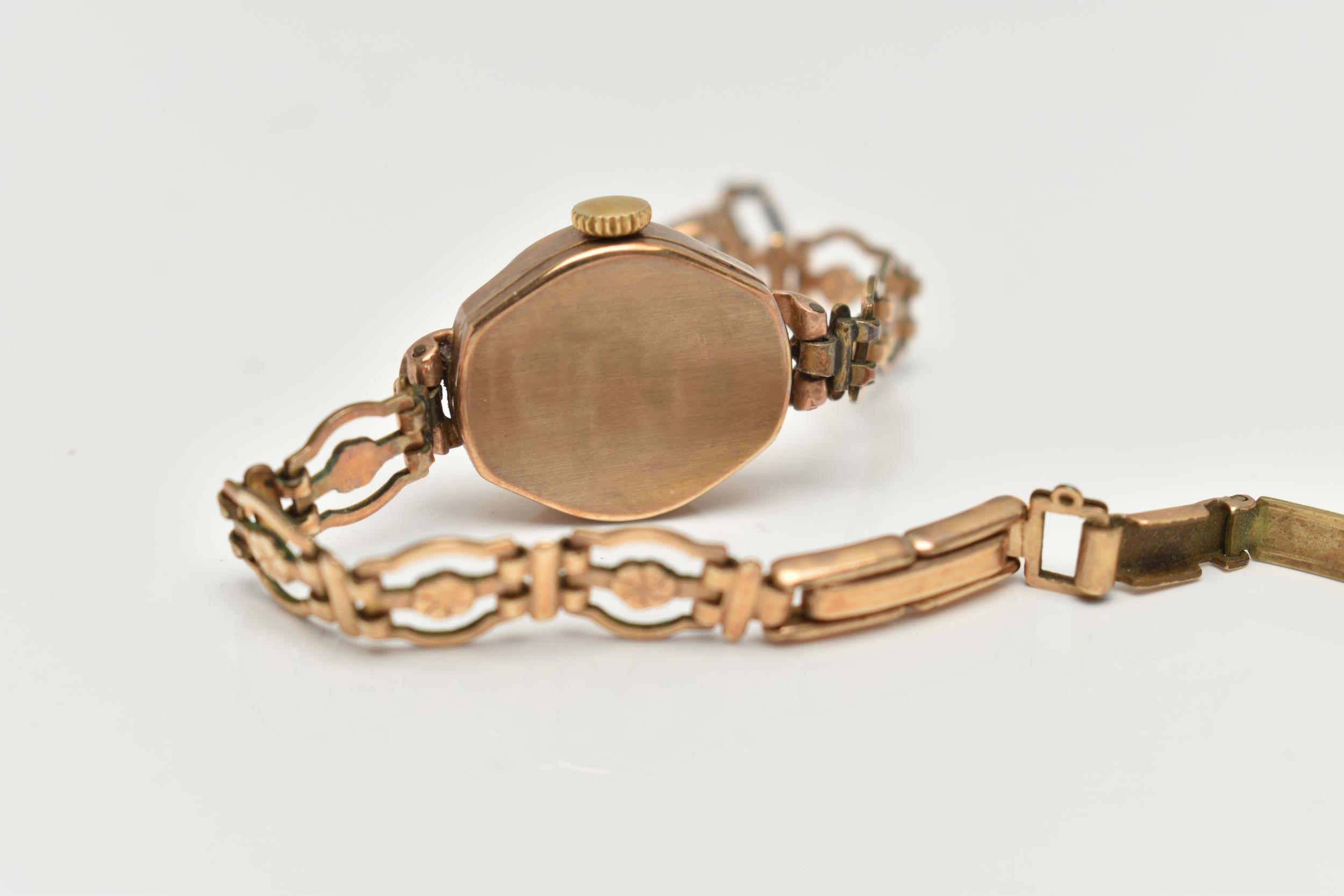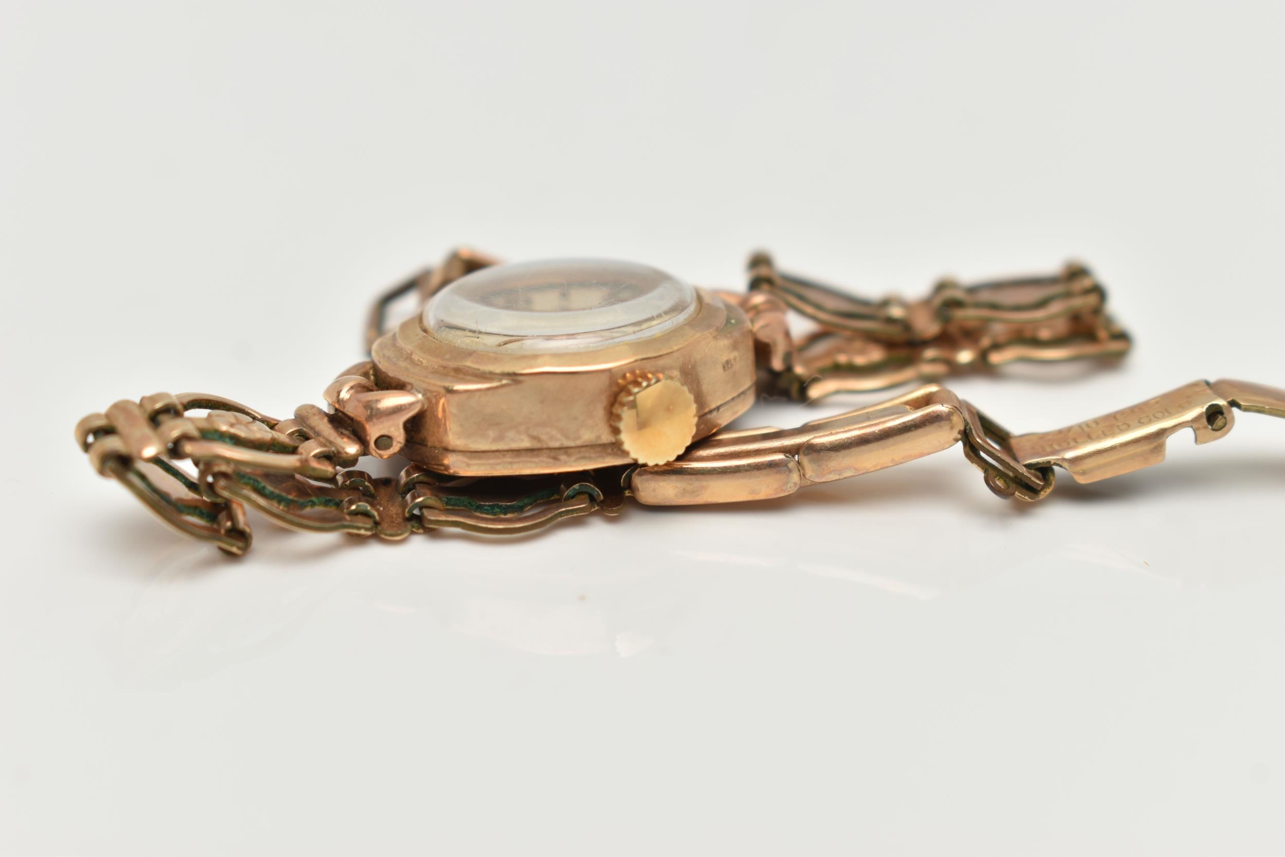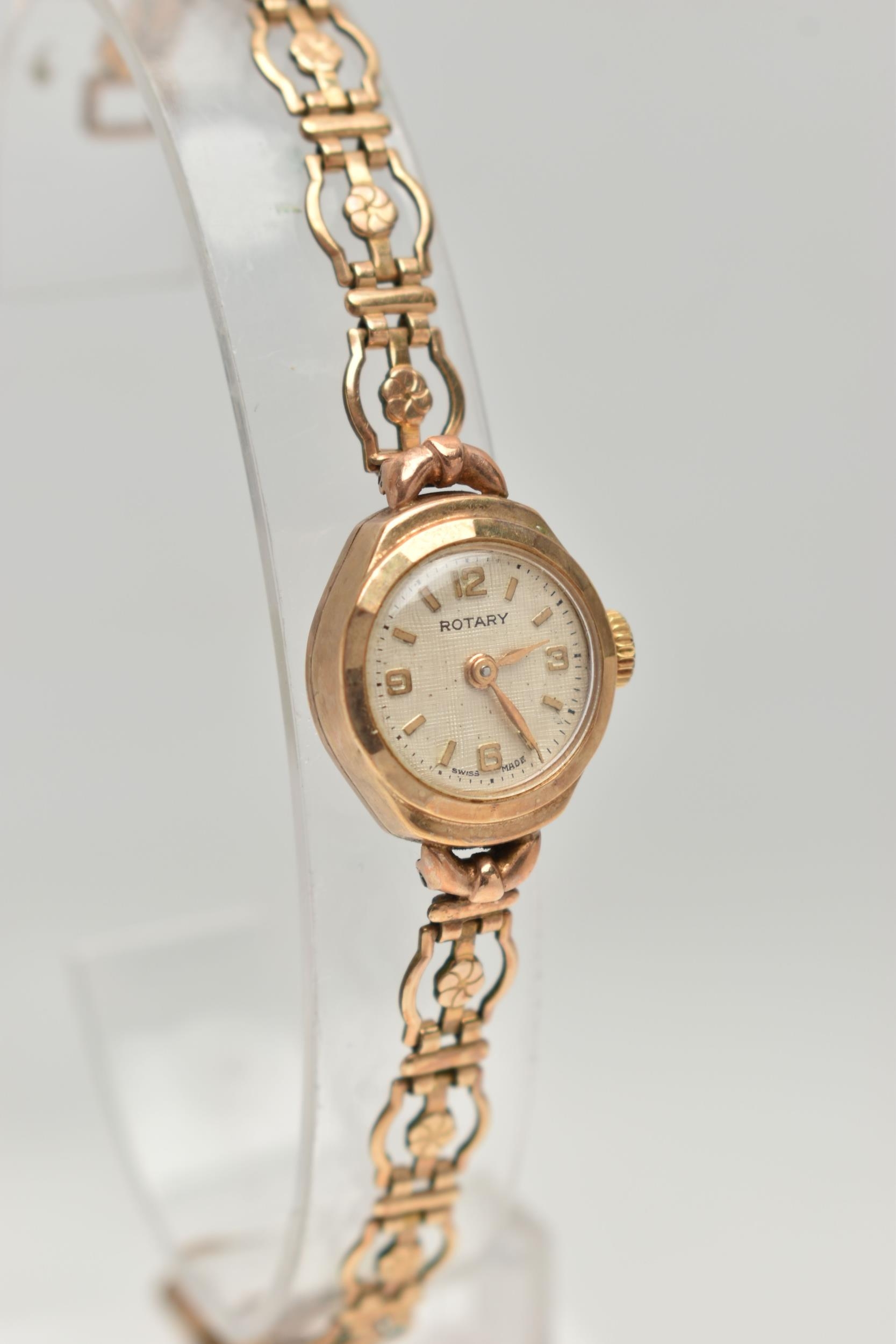 A 9CT GOLD ROTARY WRISTWATCH, hand wound movement, round dial signed 'Rotary', baton and Arabic numerals, inside case back hallmarked 9ct Birmingham London, approximate gross weight of case back 1.3 grams, fitted with a rolled gold bracelet (condition report: general moderate wear, currently working, time keeping not tested)