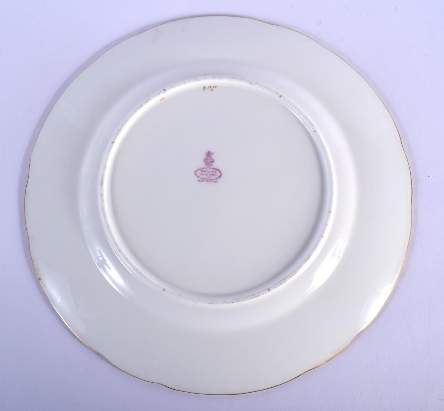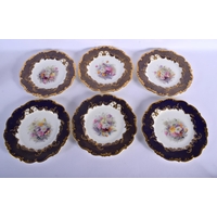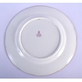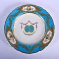 LATE 19TH C. MINTON PLATE WITH TURQUOISE BORDER HAVING THREE PANELS OF FLOWERS AND ELABORATE GILDING SURROUNDING CENTRAL INITIALS ED AND A GILT URN WITH SWAGS OF FLOWERS. 24cm diameter