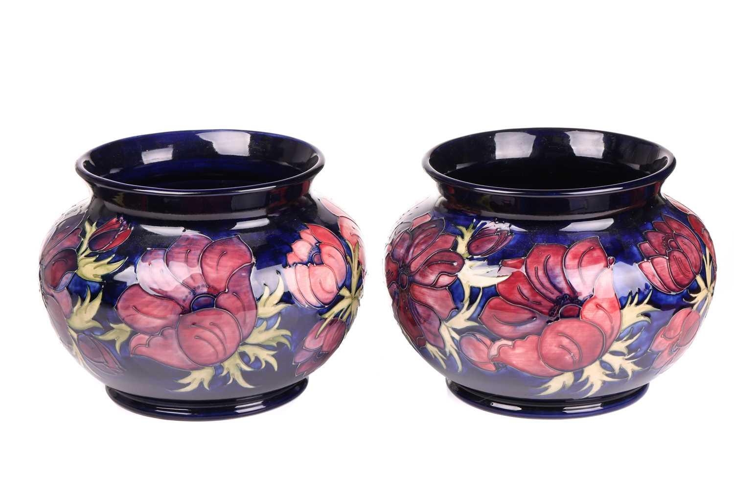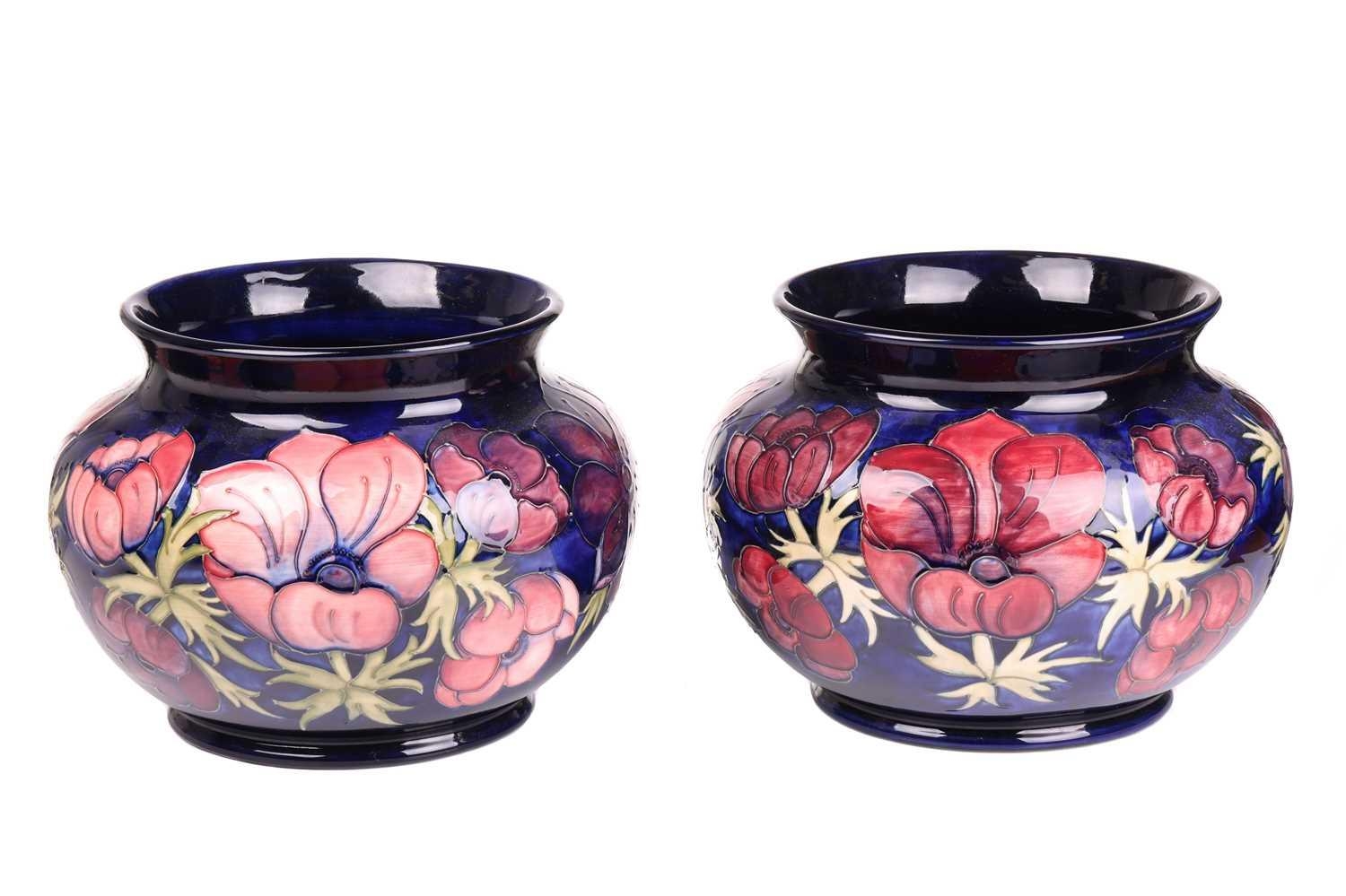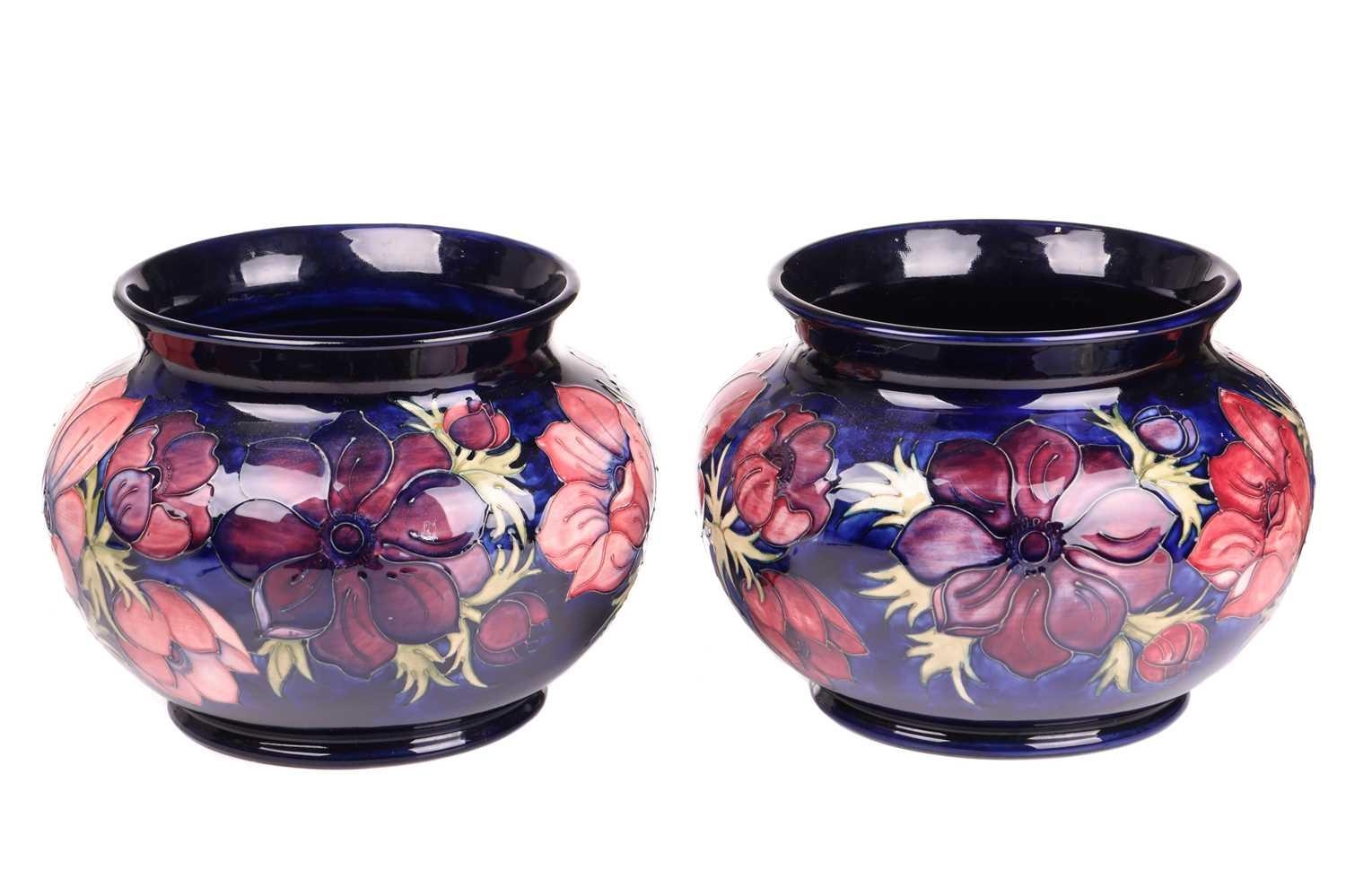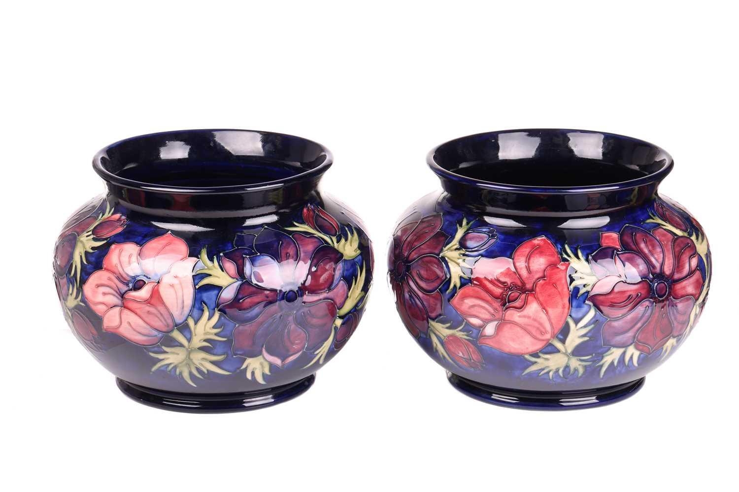 A pair of Walter Moorcroft large jardinieres, in the Anenome pattern, tube-lined decoration on a dark blue ground, impressed and painted marks to base, 21 cm high x 24 cm wide. Qty: (2)
