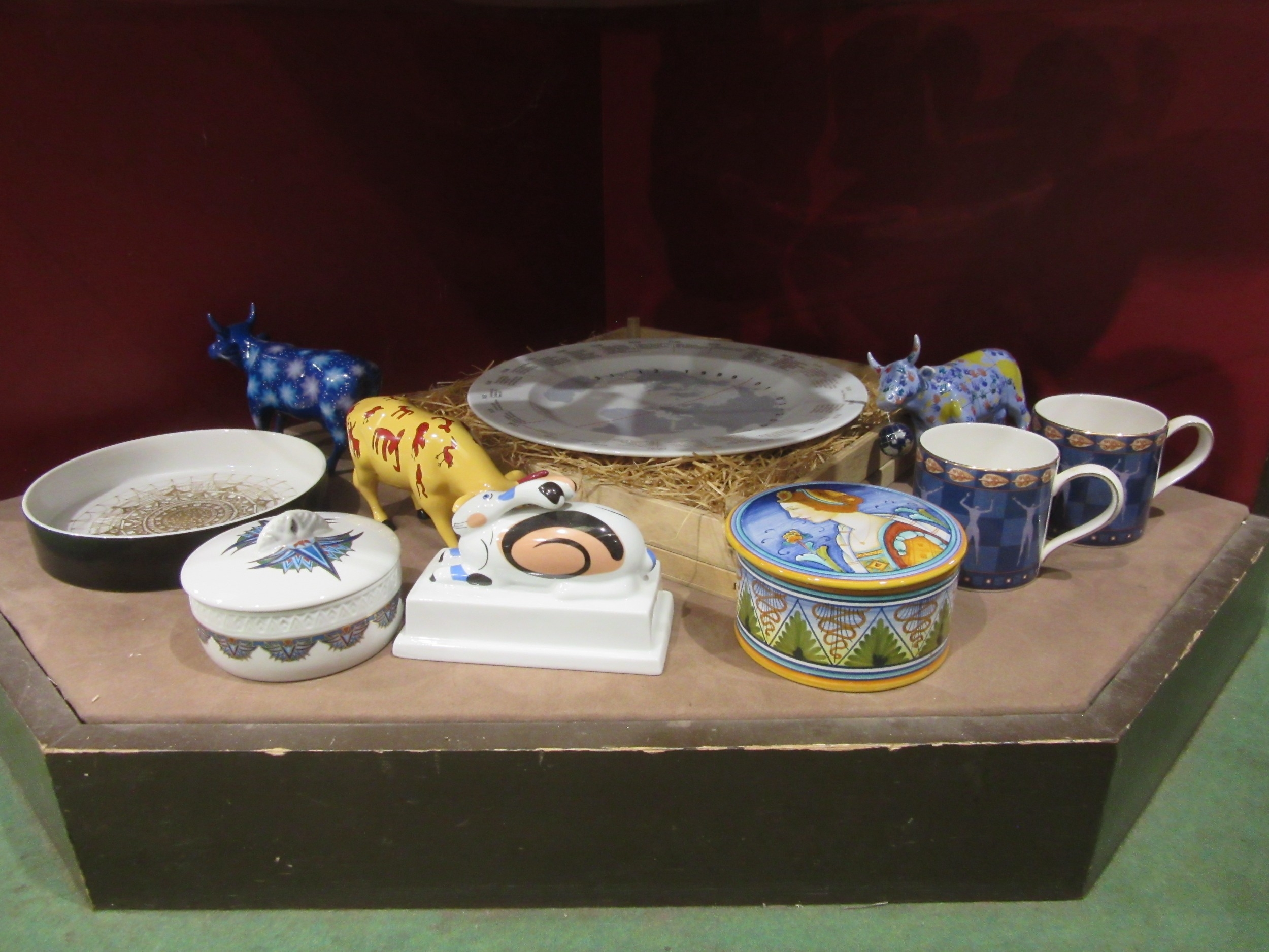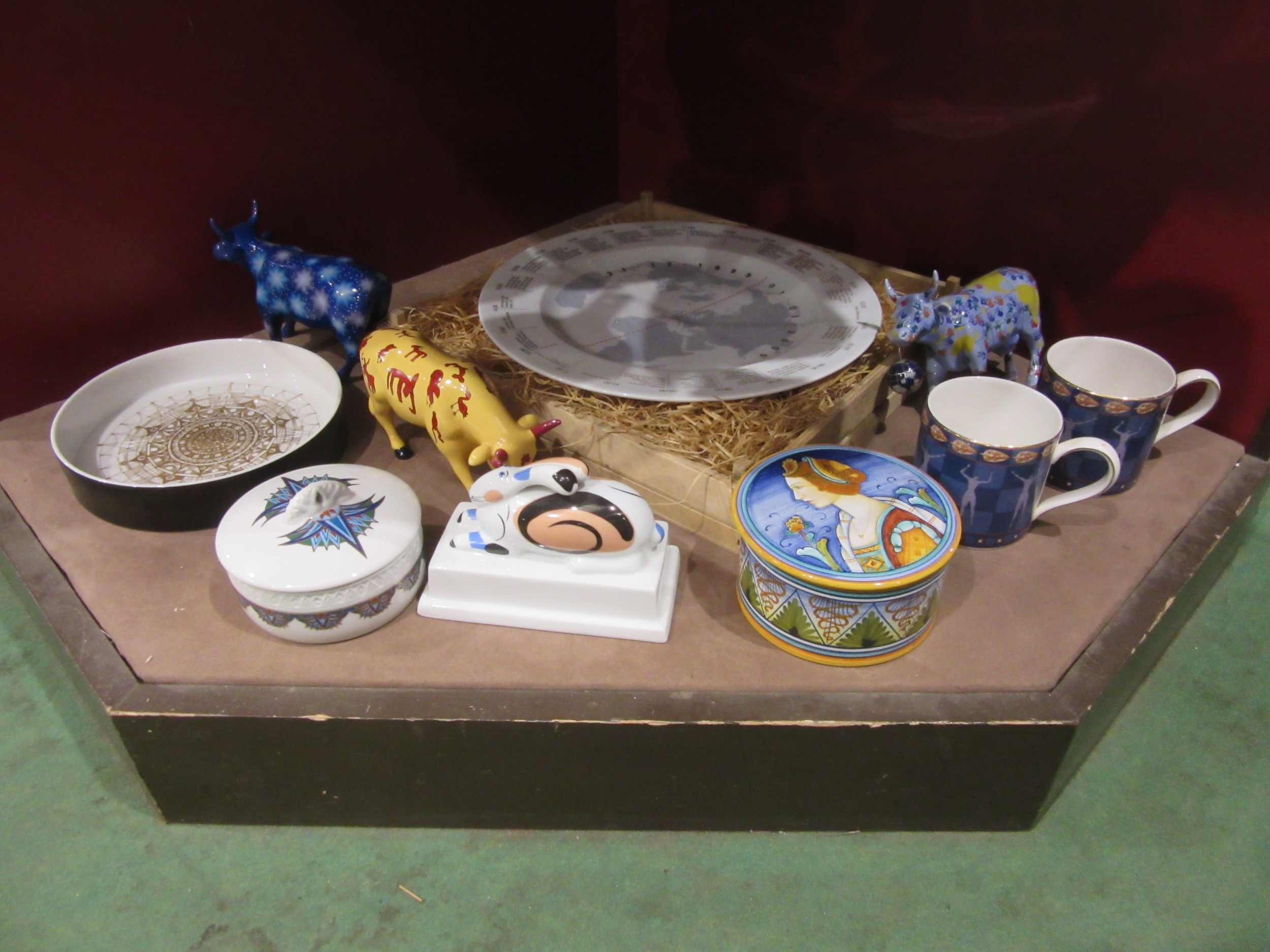 A selection of ceramics including Rosenthal Studio Line dish, Wedgwood Millennium mugs, Villeroy & Boch rabbit, Cow Parade cows (one a/f) and a Eschenbach porcelain world time zones wall plate