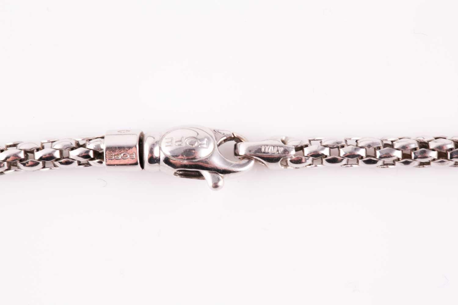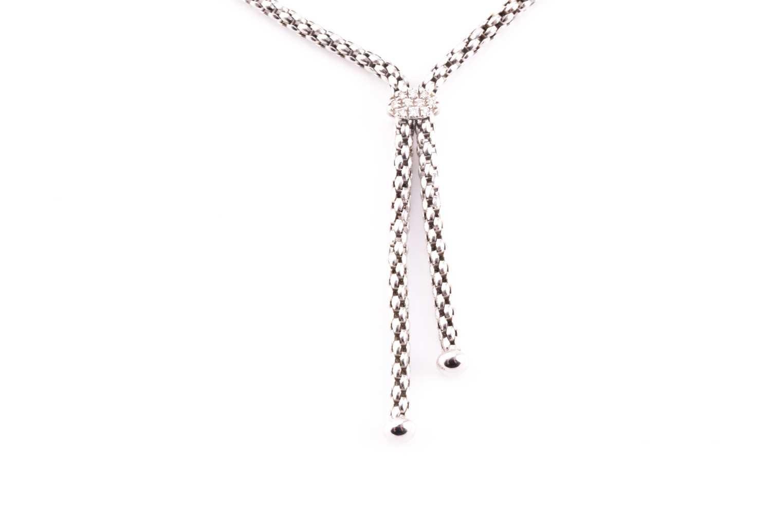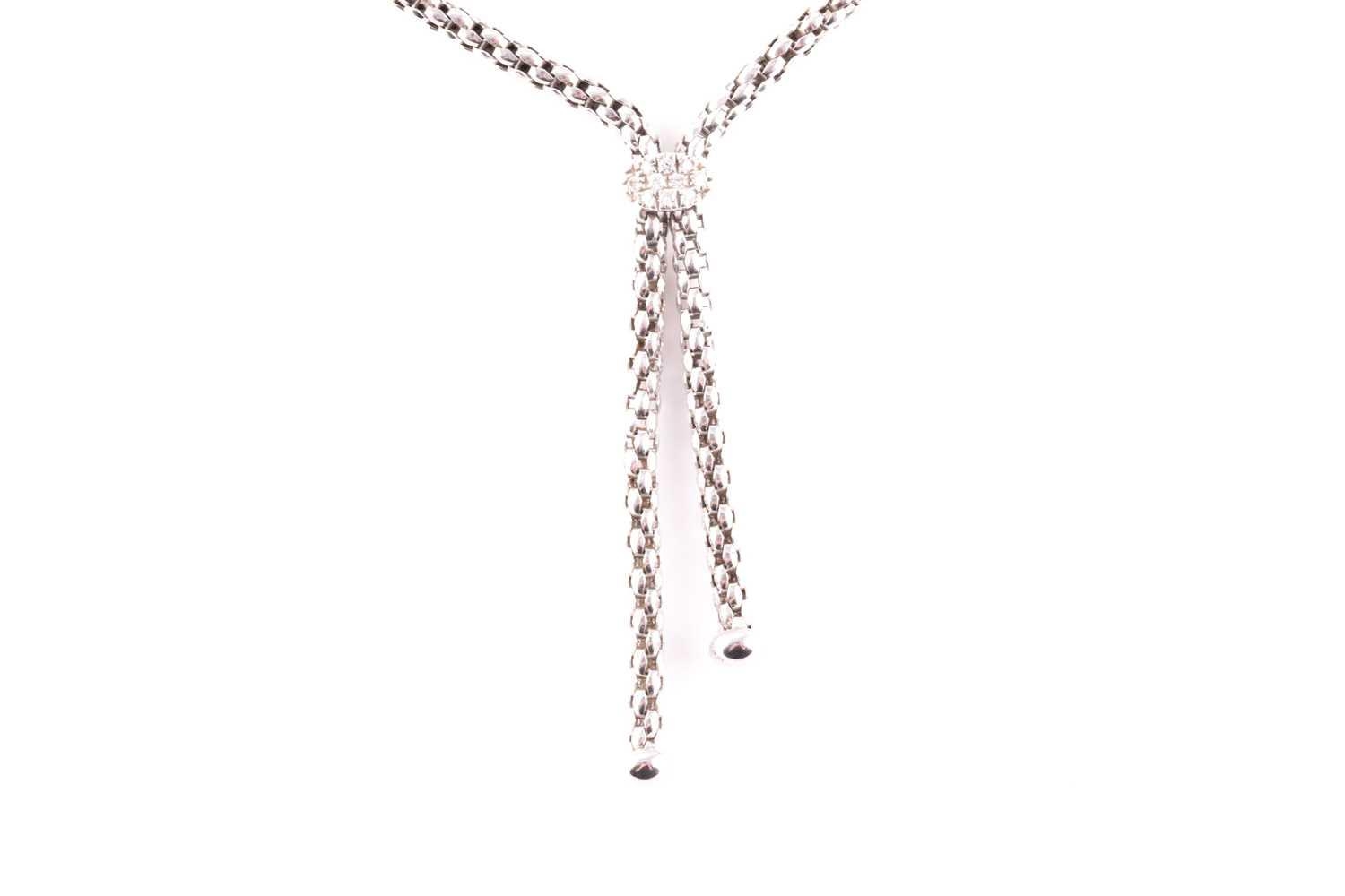 Fope, Italy. An 18ct white gold chain necklace, the lavaliere style with two drops with rounded terminals, fastened with a diamond-set link, approximately 43 cm long.