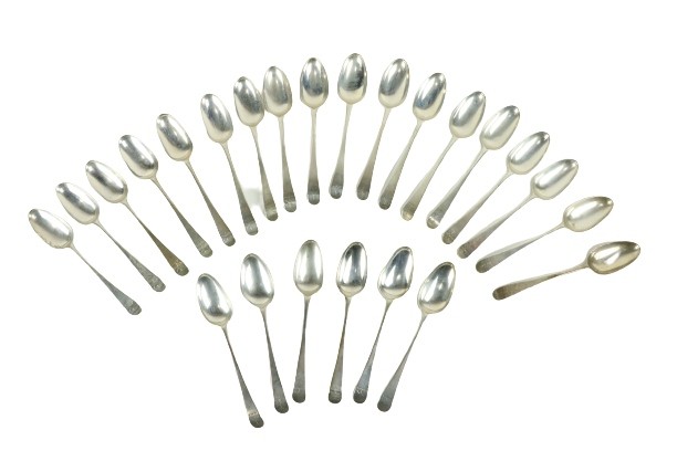 A set of 24 silver Hanoverian pattern Soup Spoons, London 1756-76, john Lautier (?), 48.5 ozs. (24)