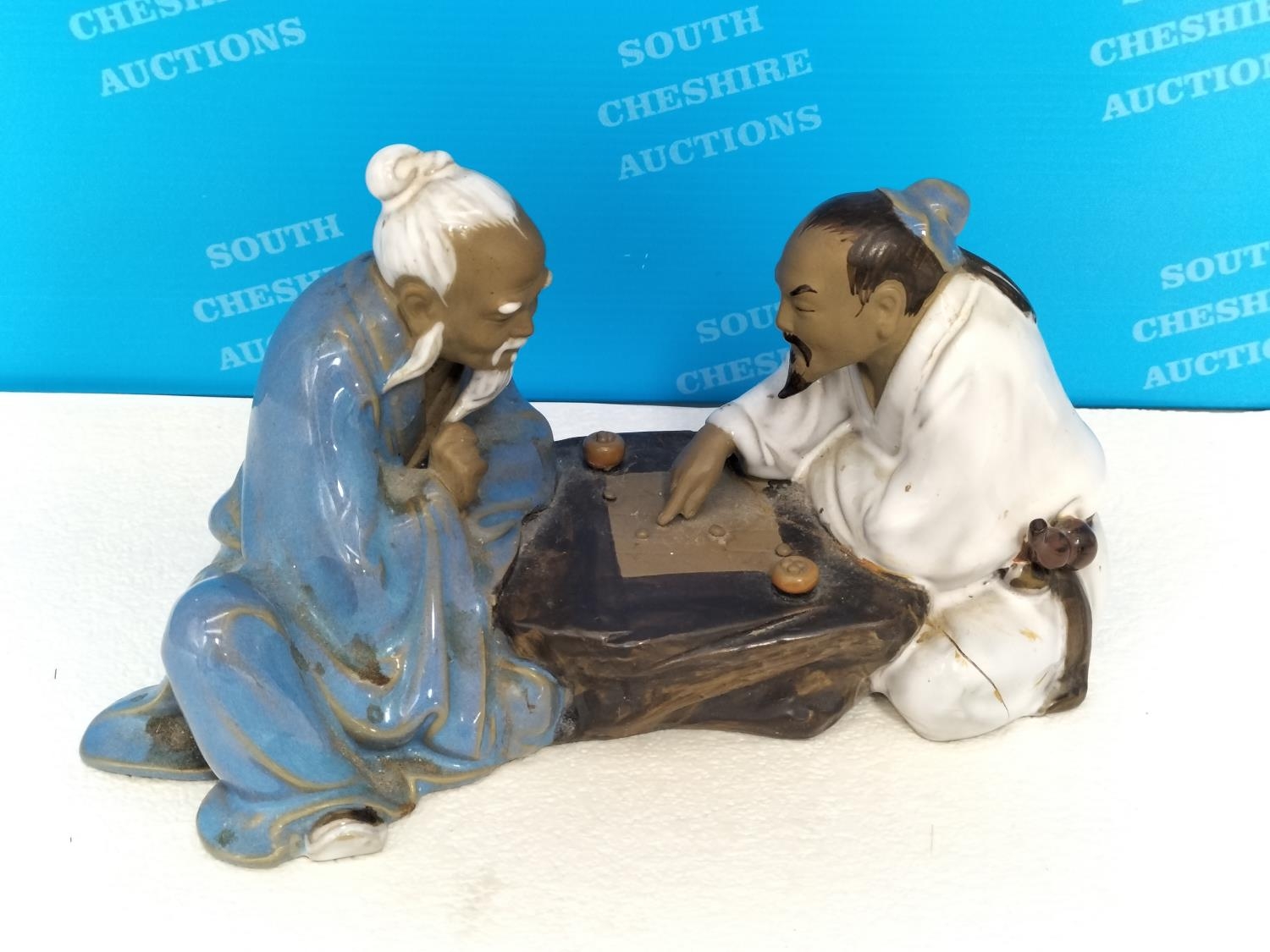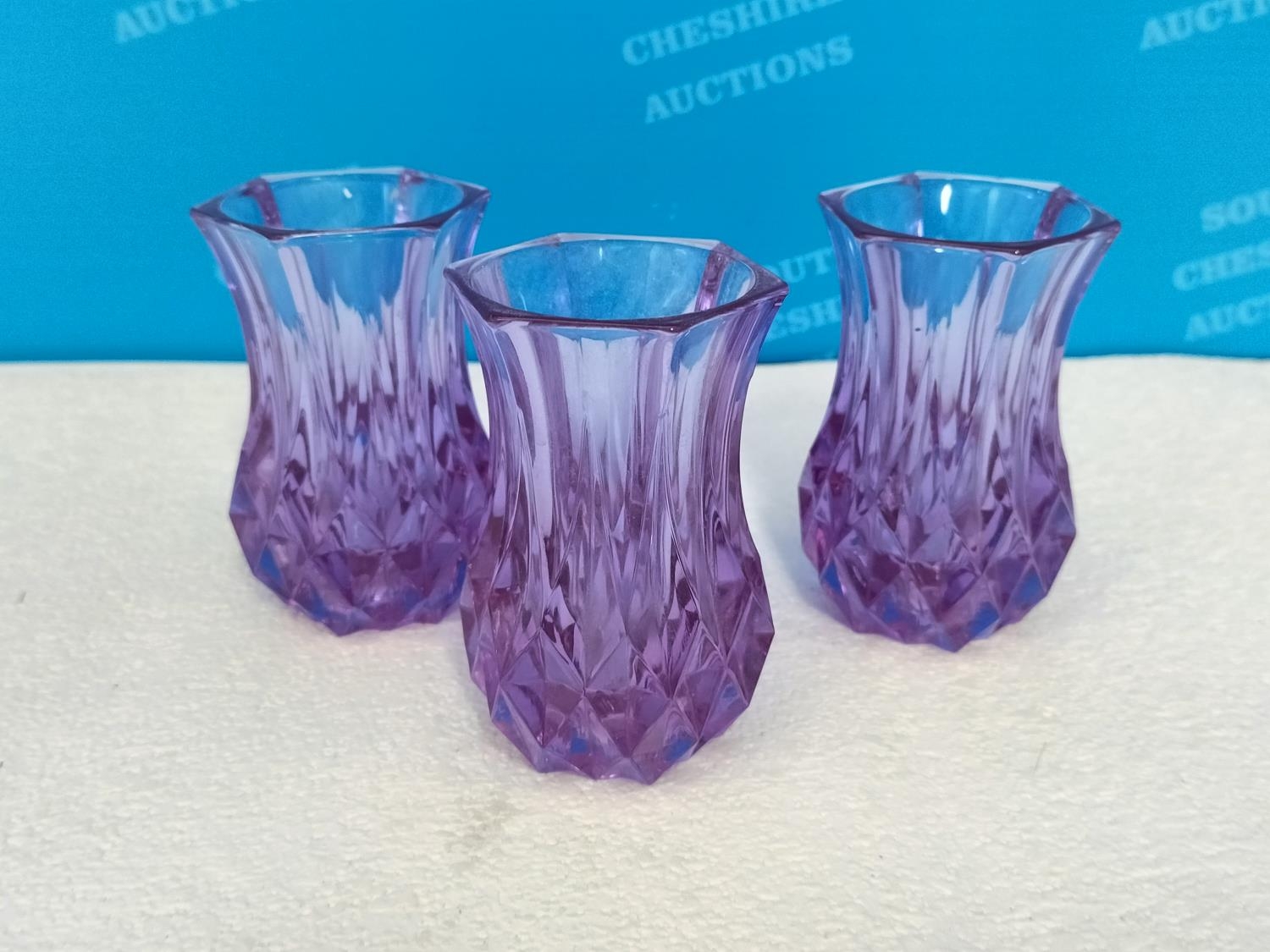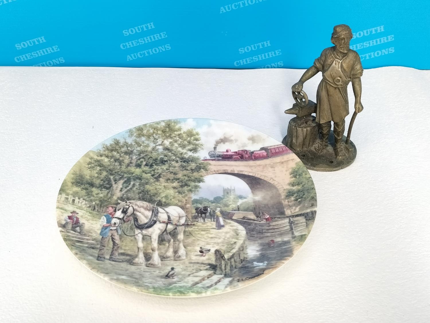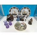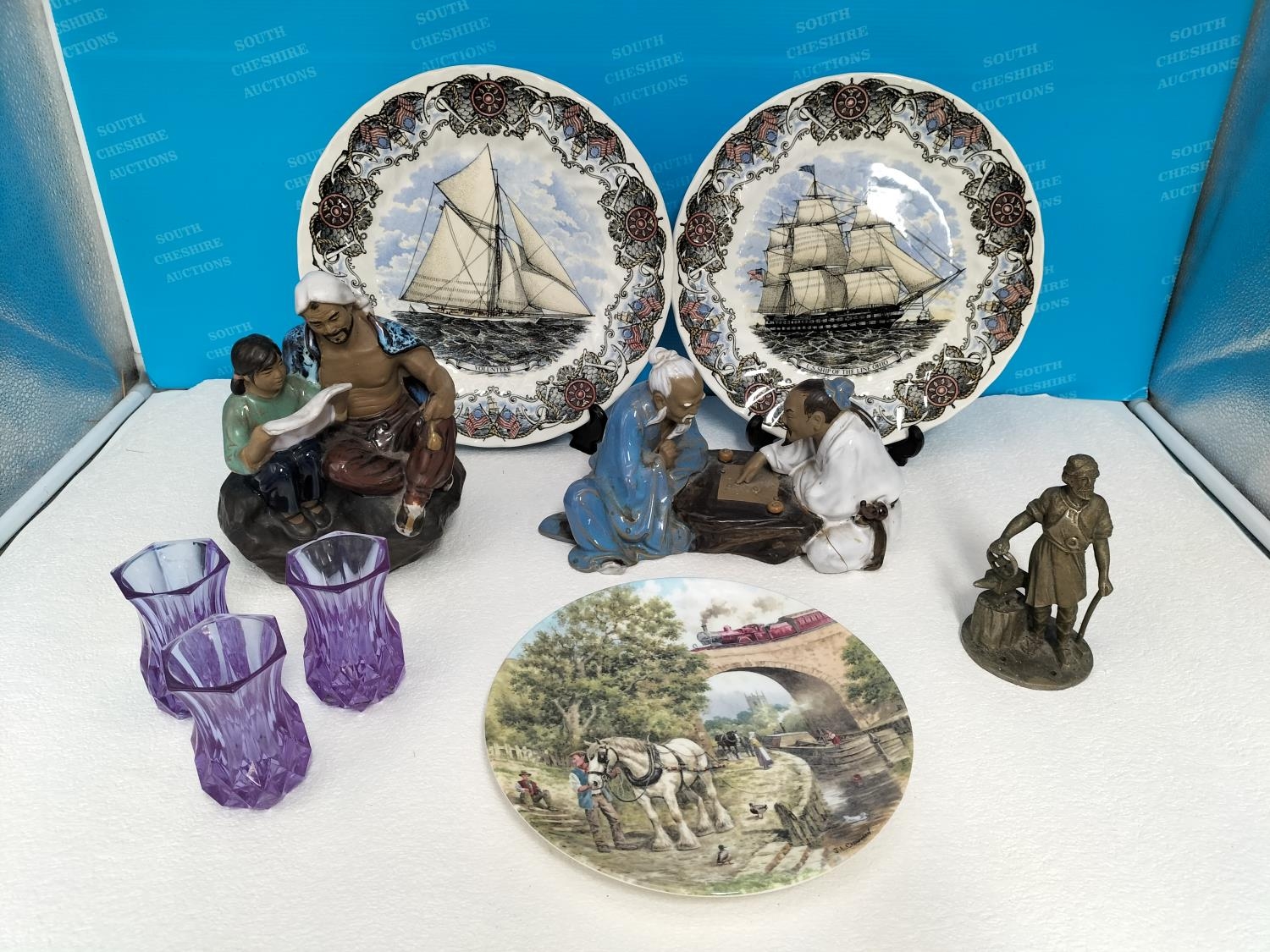 Collection of Items to include Mud Men Figures (2) 1A/F, Metal Blacksmith Figure, Purple Glass Small Vases (3), Plates, etc. Largest Figure 19cm Tall.