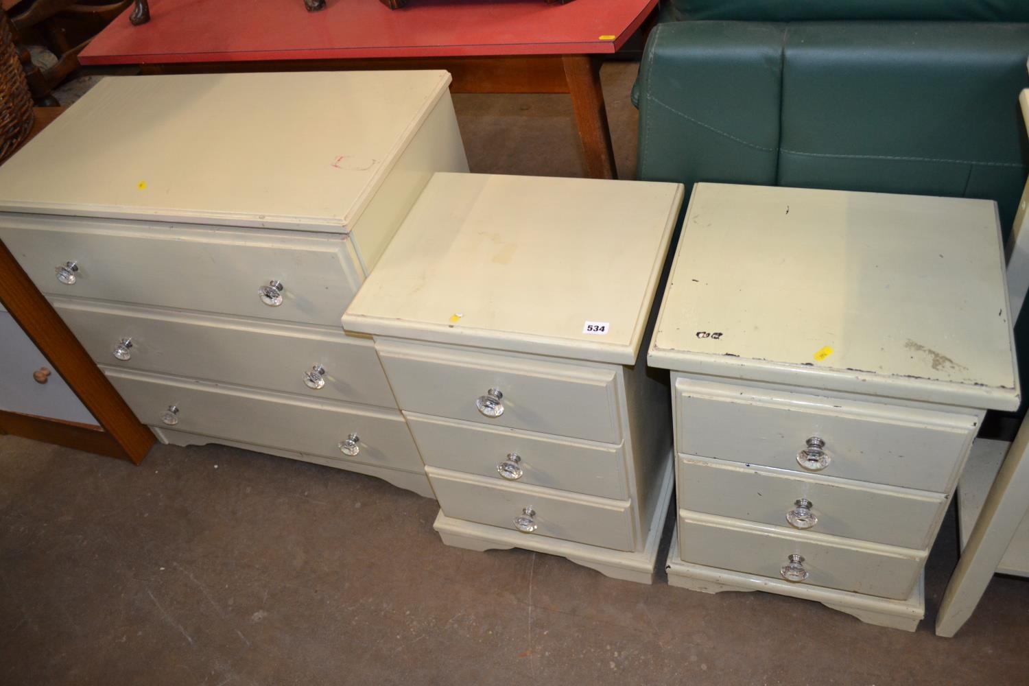 CHEST OF 3 DRAWERS AND PAIR OF 3 DRAWER BEDSIDES WITH GLASS KNOBS