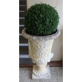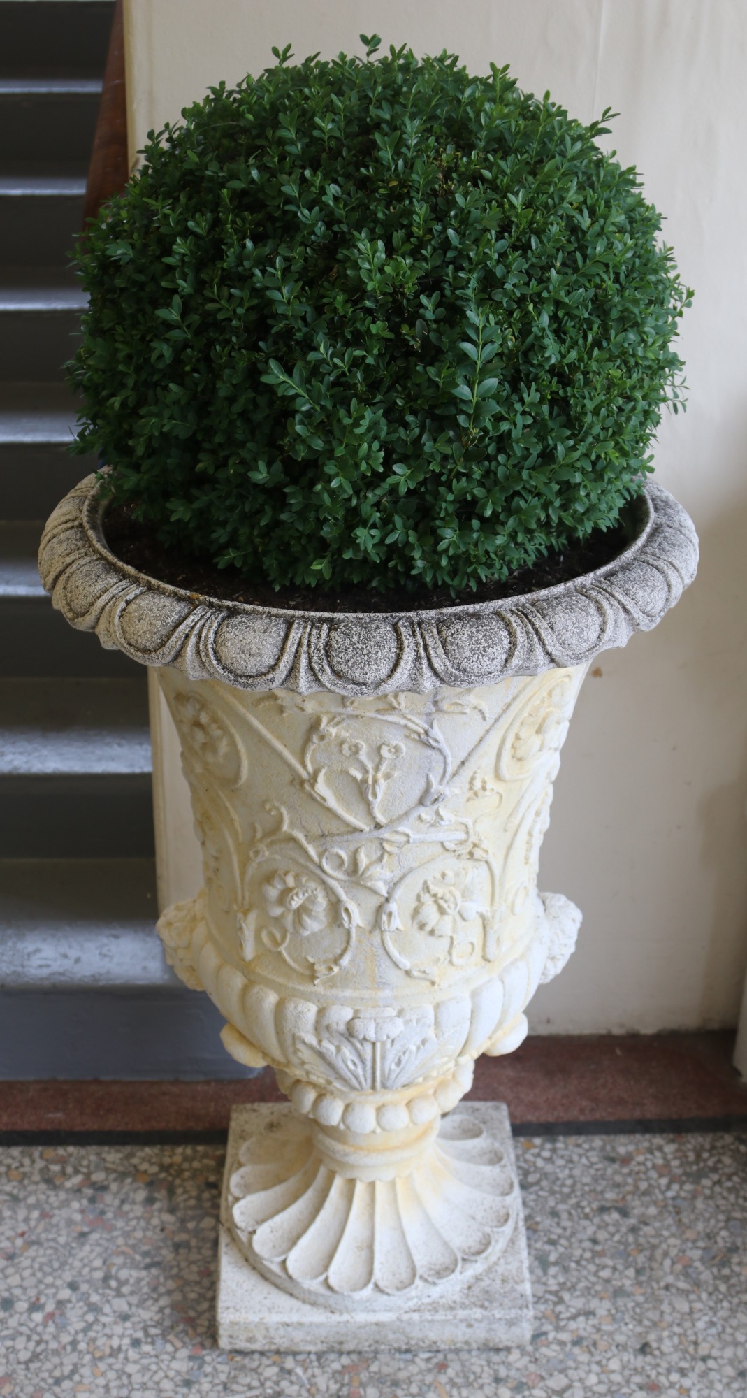 A good pair of Italian cast stone garden urns, inscribed Riprod vietata papilla to base. (96cm tall)