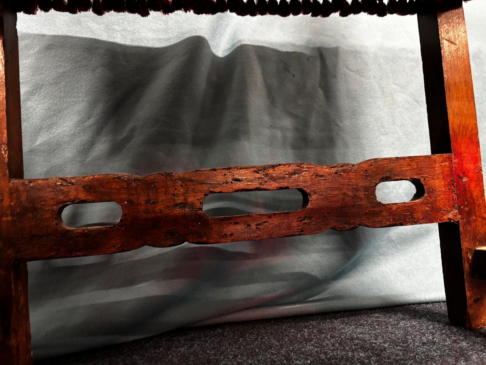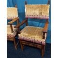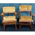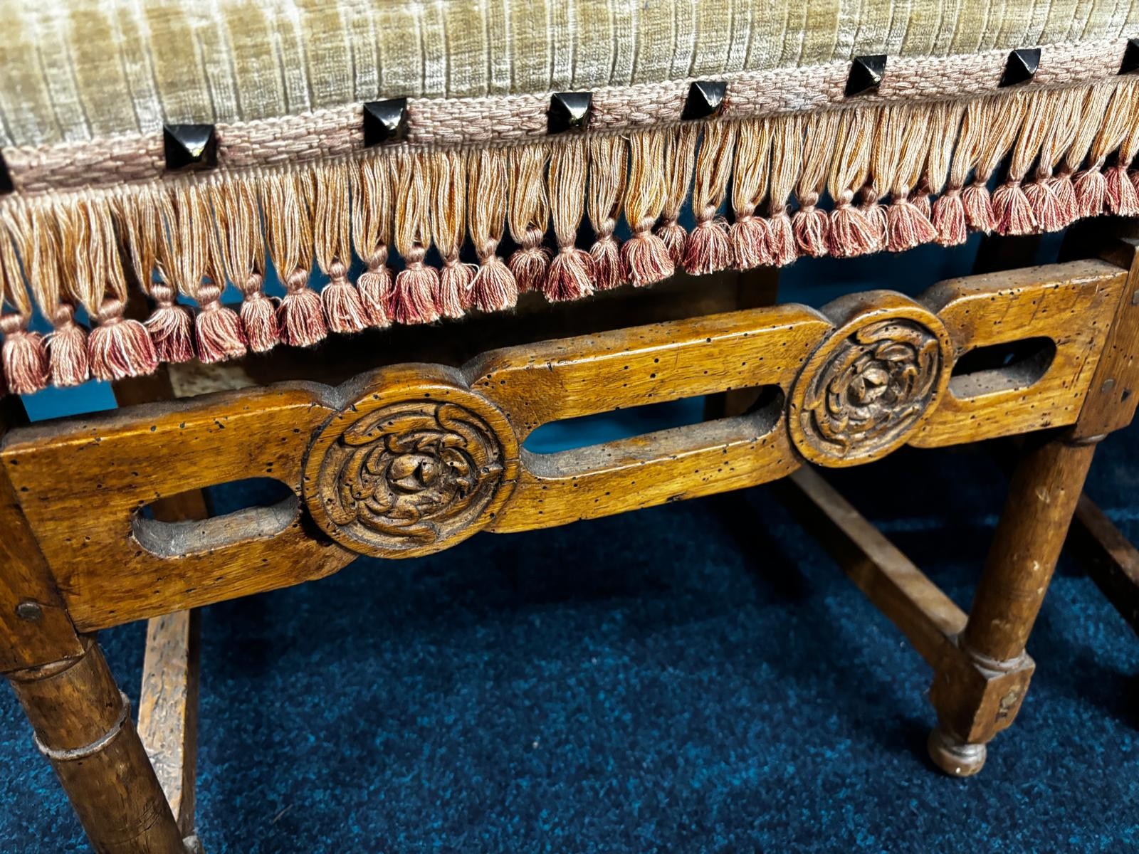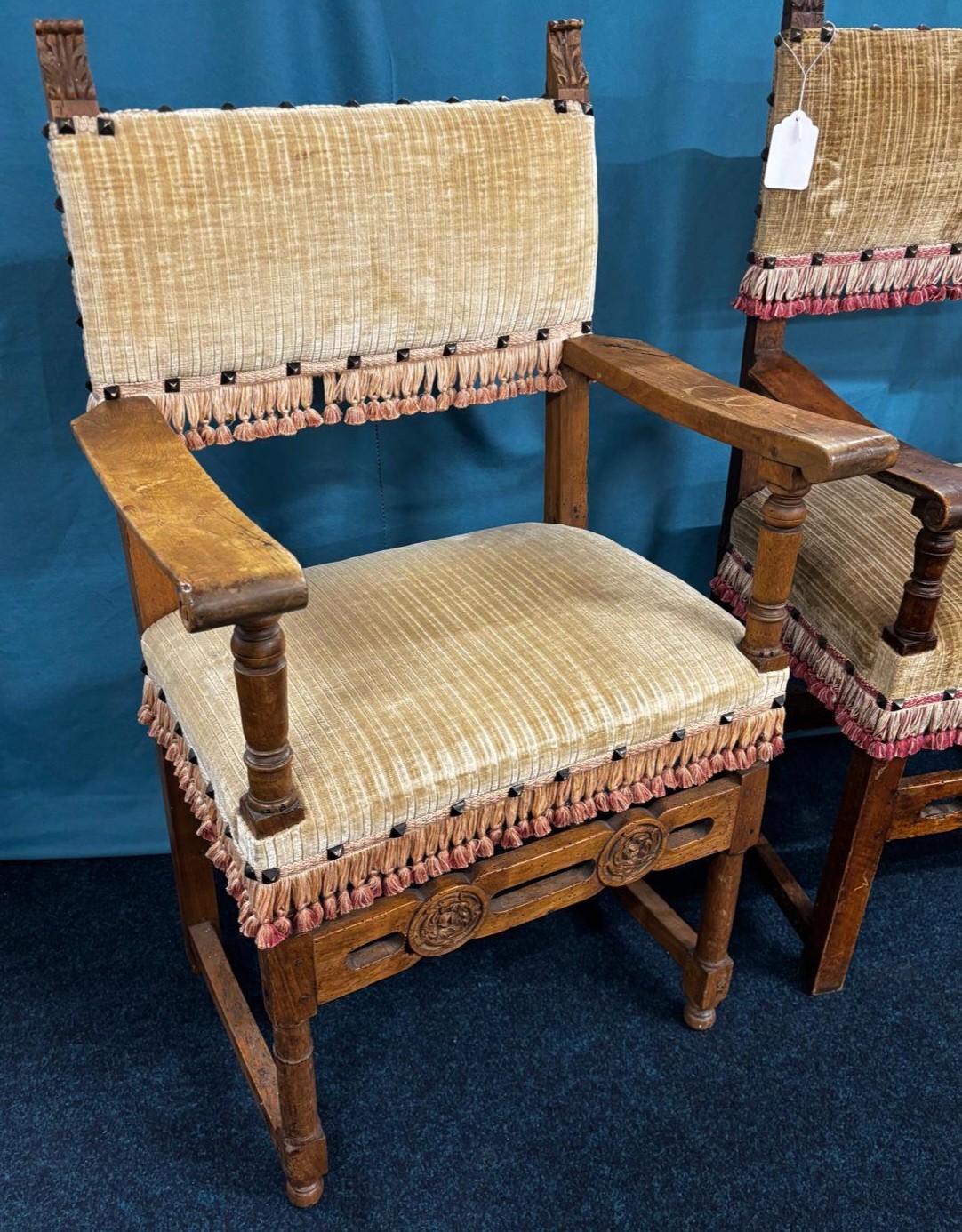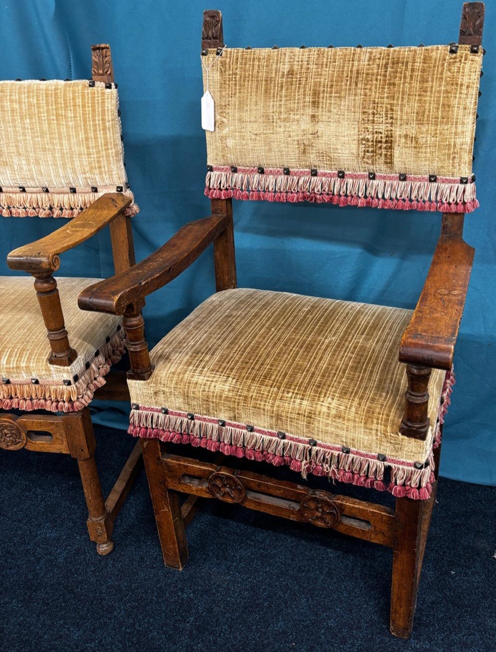 Two 18th century Italian Baroque style Walnut Arm Chairs. Both having carved support stretcher.