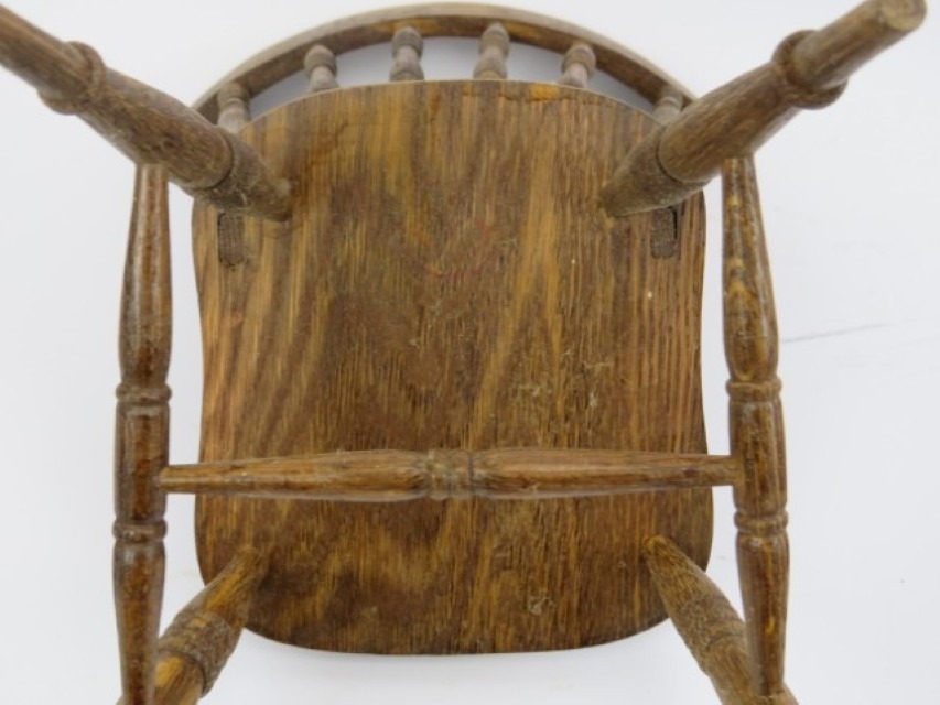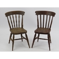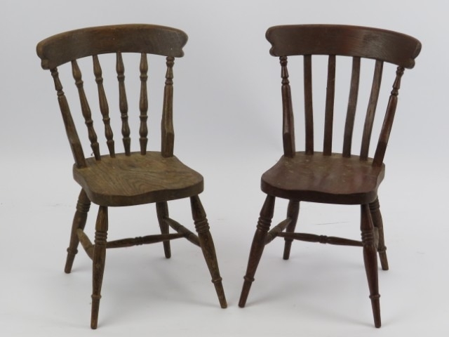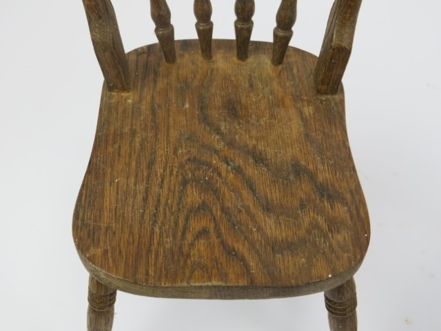 A pair of miniature apprentice stick back oak kitchen chairs. (2 items) 29.7 cm height.