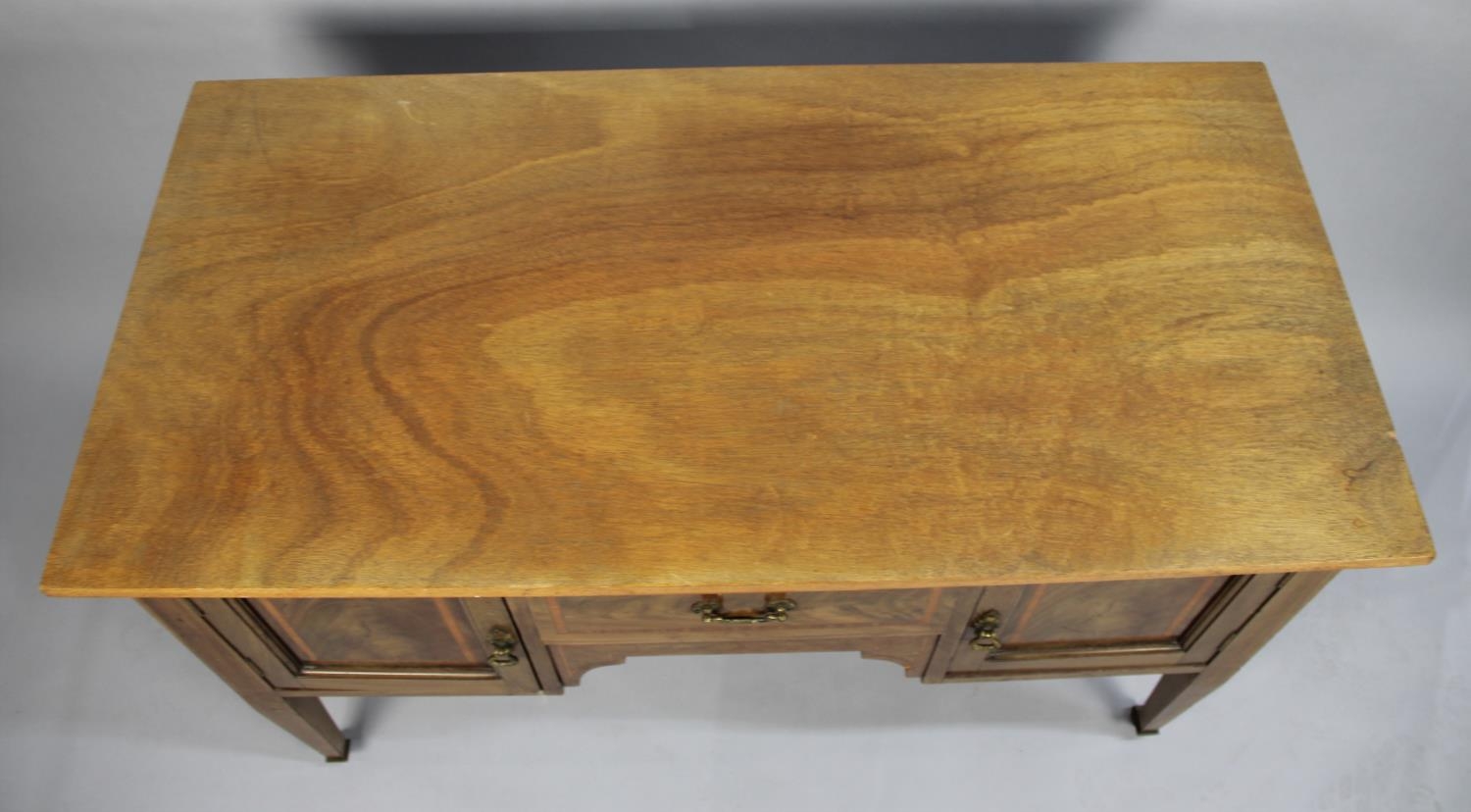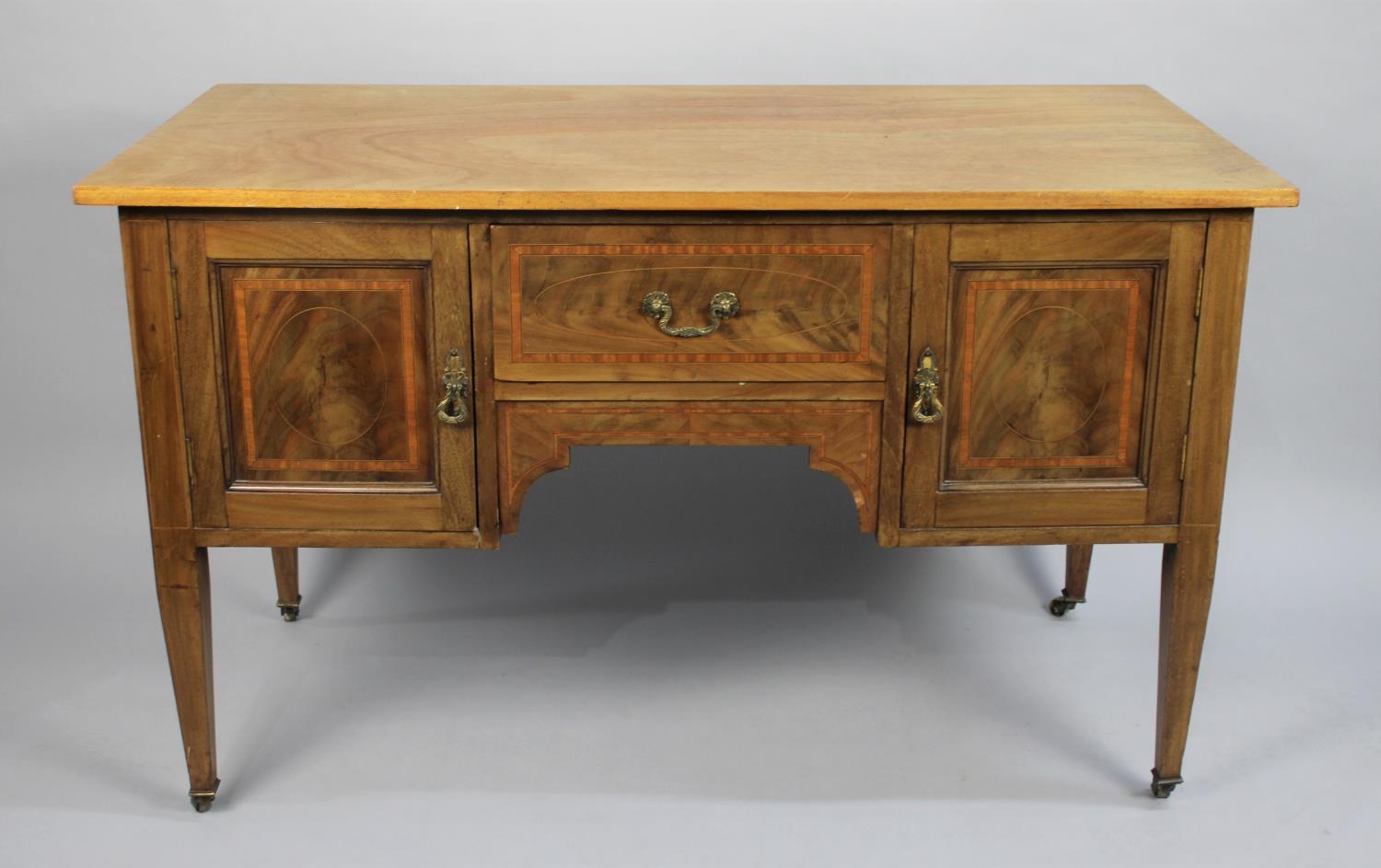 An Edwardian Inlaid walnut Dressing Table Base on Square Tapering Supports having Replacement Top, Converted into Writing Desk, 122cms Wide