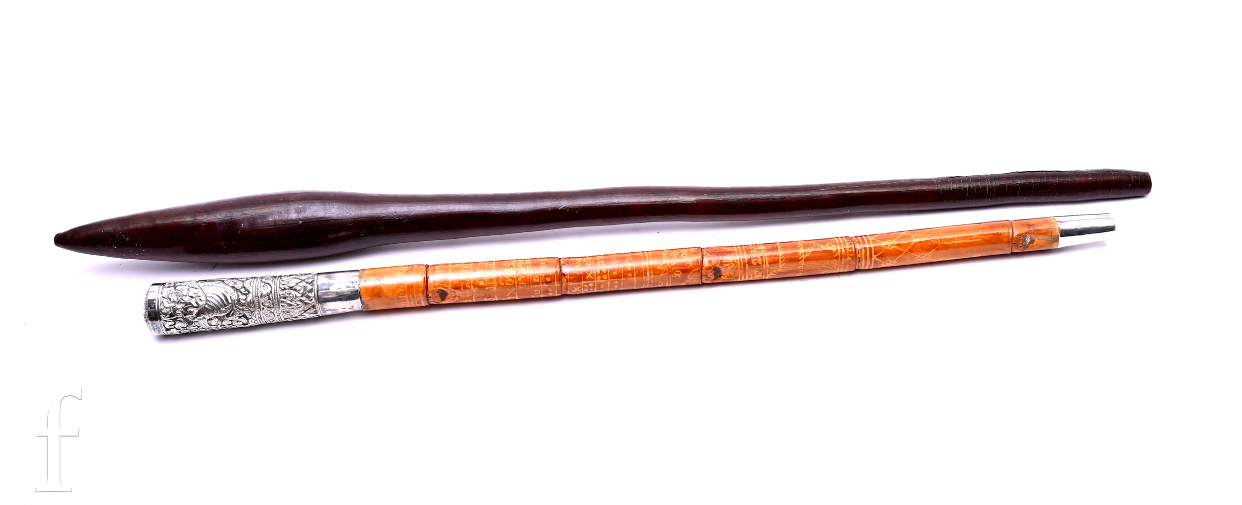 A South Seas hardwood throwing club / digging stick, the tapered grip with wire inlay, length 61.5cm, together with a 19th Century walking cane section, the handle decorated with beasts amidst bands of flowers, the bamboo section decorated with cattle, a game and words, later tipped, length 52cm. (2)