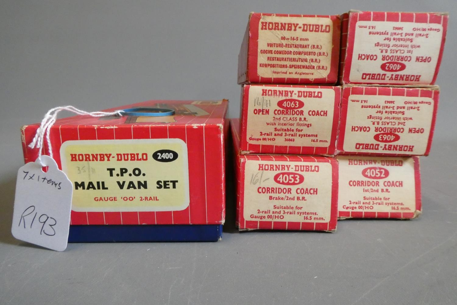 Six Hornby Dublo BR red passenger coaches and 2-rail TPO Set, all items boxed, fair