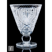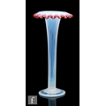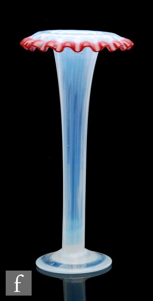 A large late 19th Century lily vase of footed and fluted form with roll rim, decorated with an applied cranberry trim to the opalescent body, height 44cm.