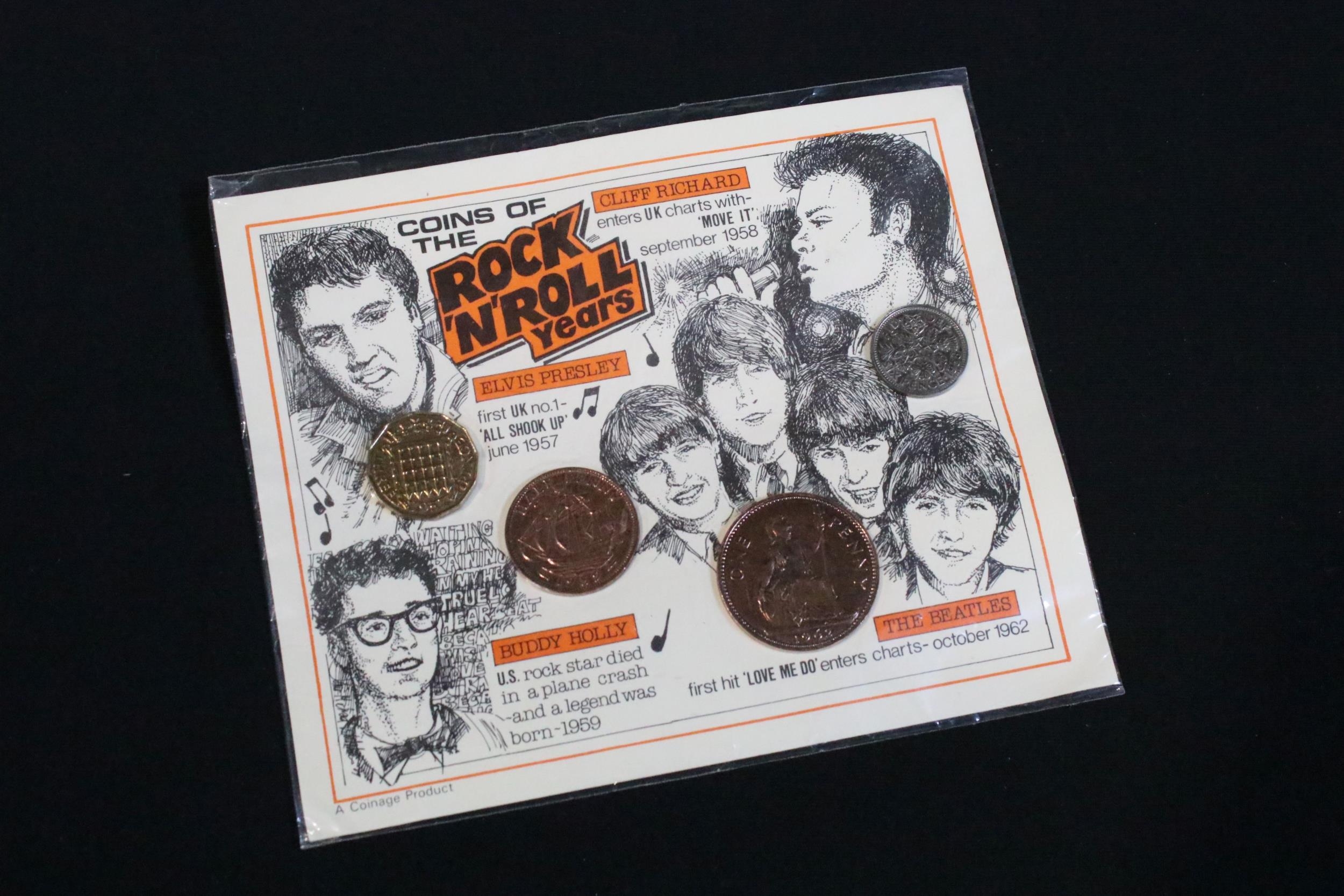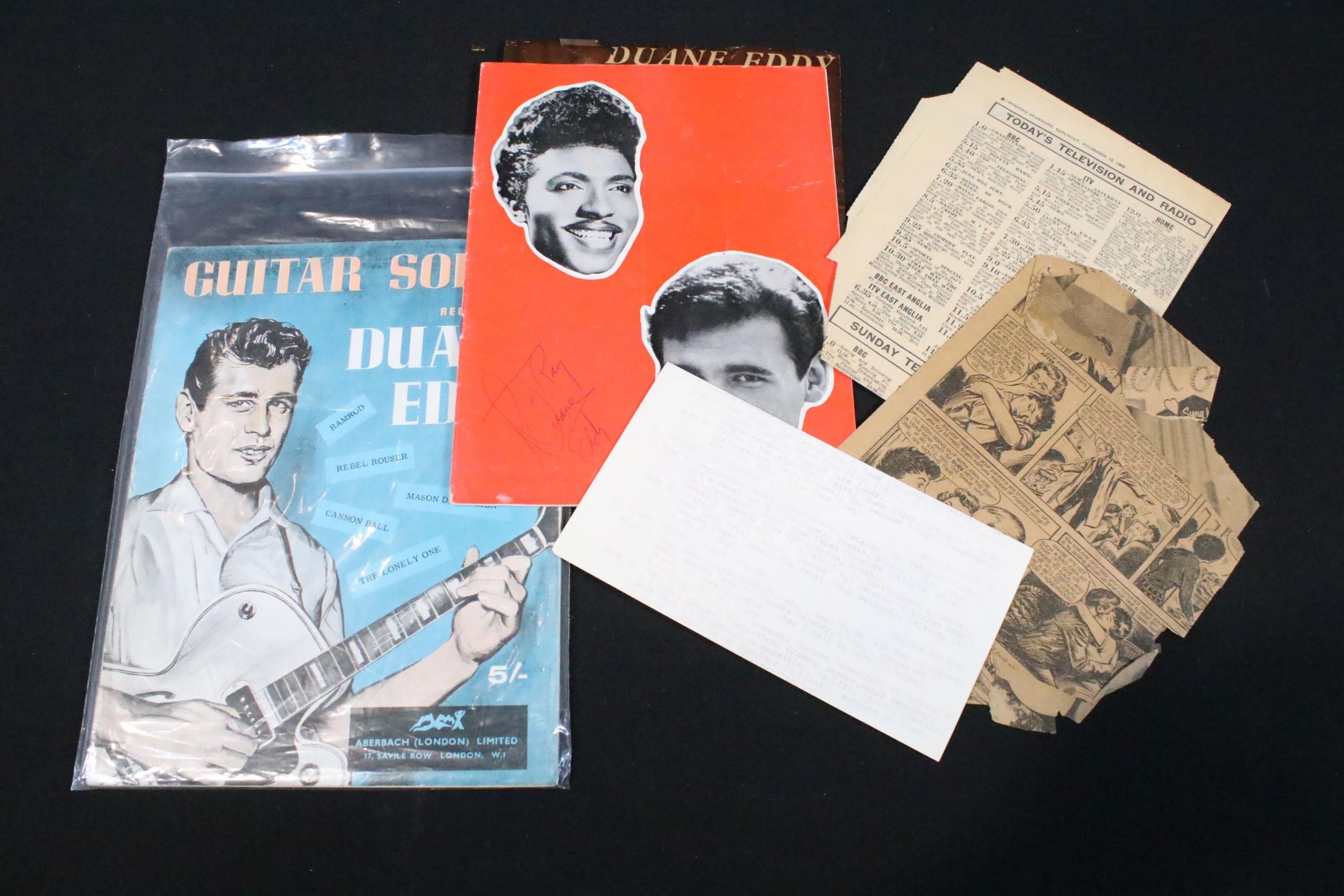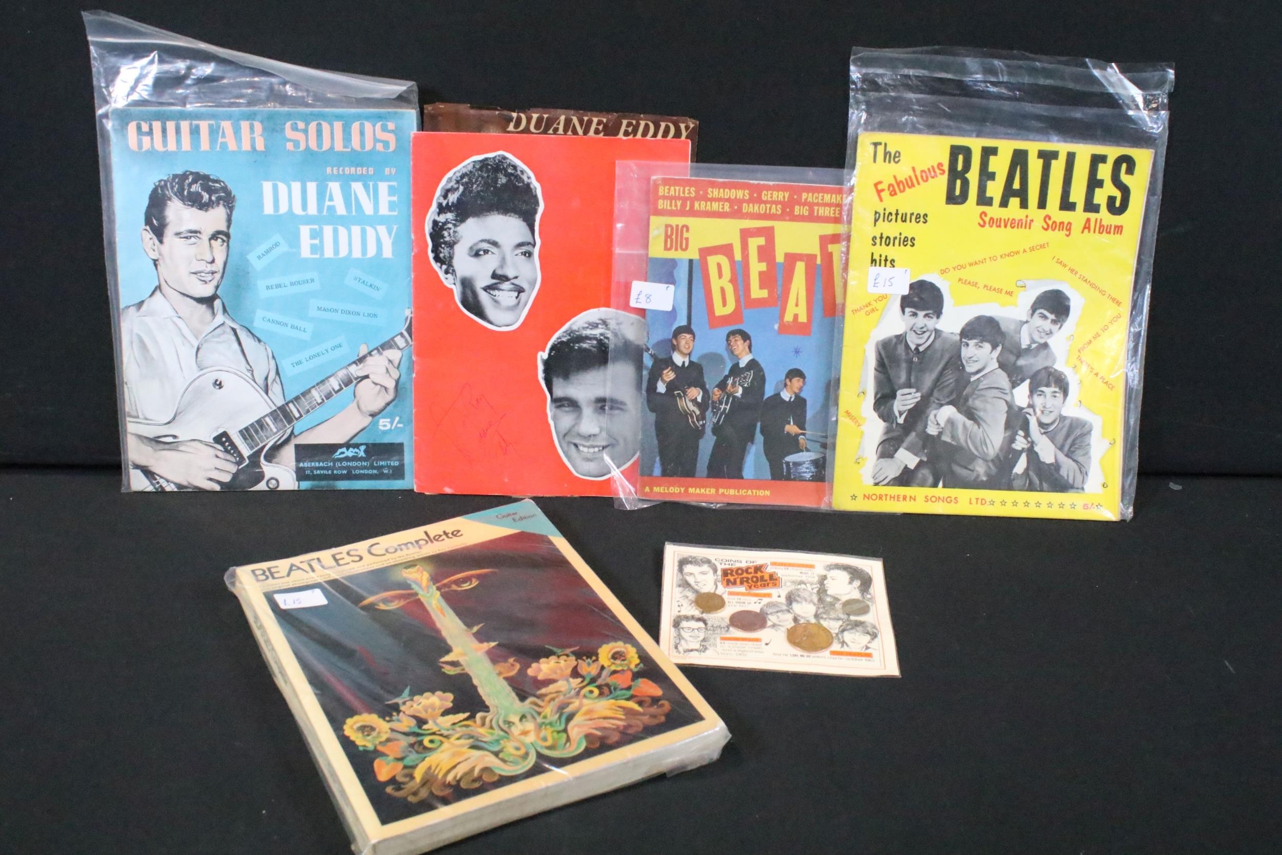 Memorabilia - Various items to include Little Richard 1963 tour programme signed three times by Duane Eddy (support act), Duane Eddy guitar book, Jet Harris guitar book, The Big Beat Boys magazine, The Fabulous Beatles Souvenir Song Album, The Beatles Complete Guitar Edition Book, Coins Of The Rock N Roll Years set