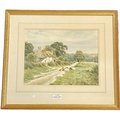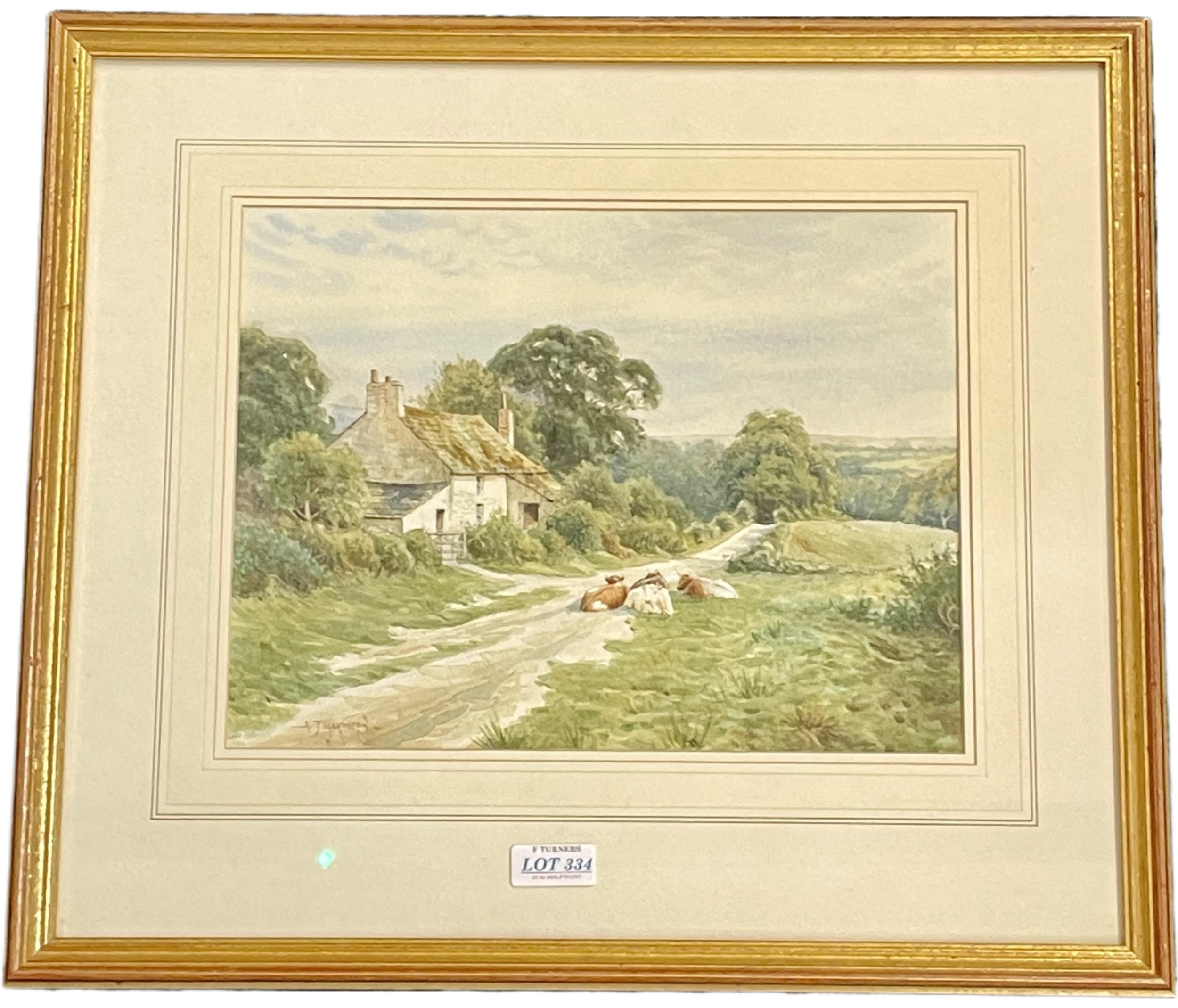 A J MAKINSON (ALISTAIR J MAKINSON BR.1961) - WATERCOLOUR -TITLE: 'COTTAGE NEAR BLEASDALE FELL' SHOWING A COTTAGE ON A COUNTRY LANE WITH FELL TO THE BACKGROUND WITH COWS LYING ON THE ROAD -FRAME: 48X42CMS - TO MOUNT 31X24CMS