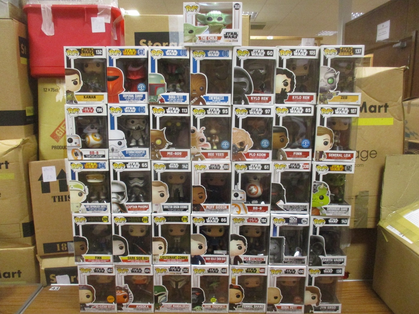 Star Wars. Funko. Collection of Pop! bobble-head figures, generally mint in near mint boxes, includes Original Trilogy, Sequel Trilogy, Rogue One, The Mandalorian, etc. Qty 36 (B)