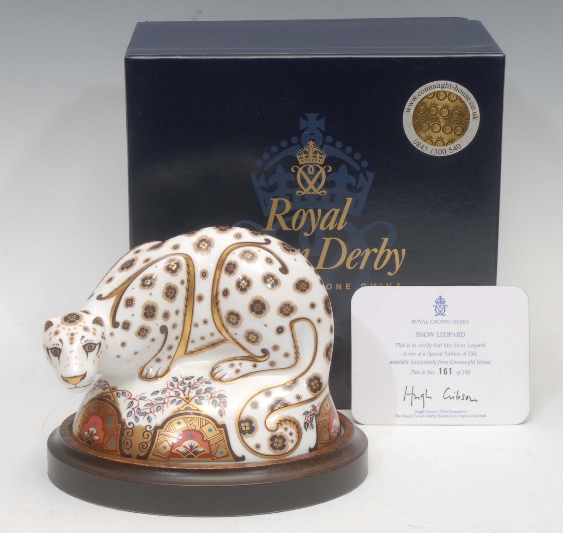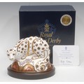 A Royal Crown Derby paperweight, Snow Leopard, Connaught House exclusive, limited edition 161/250, gold stopper, 14cm high, 17cm wide, printed mark in red, certificate, boxed