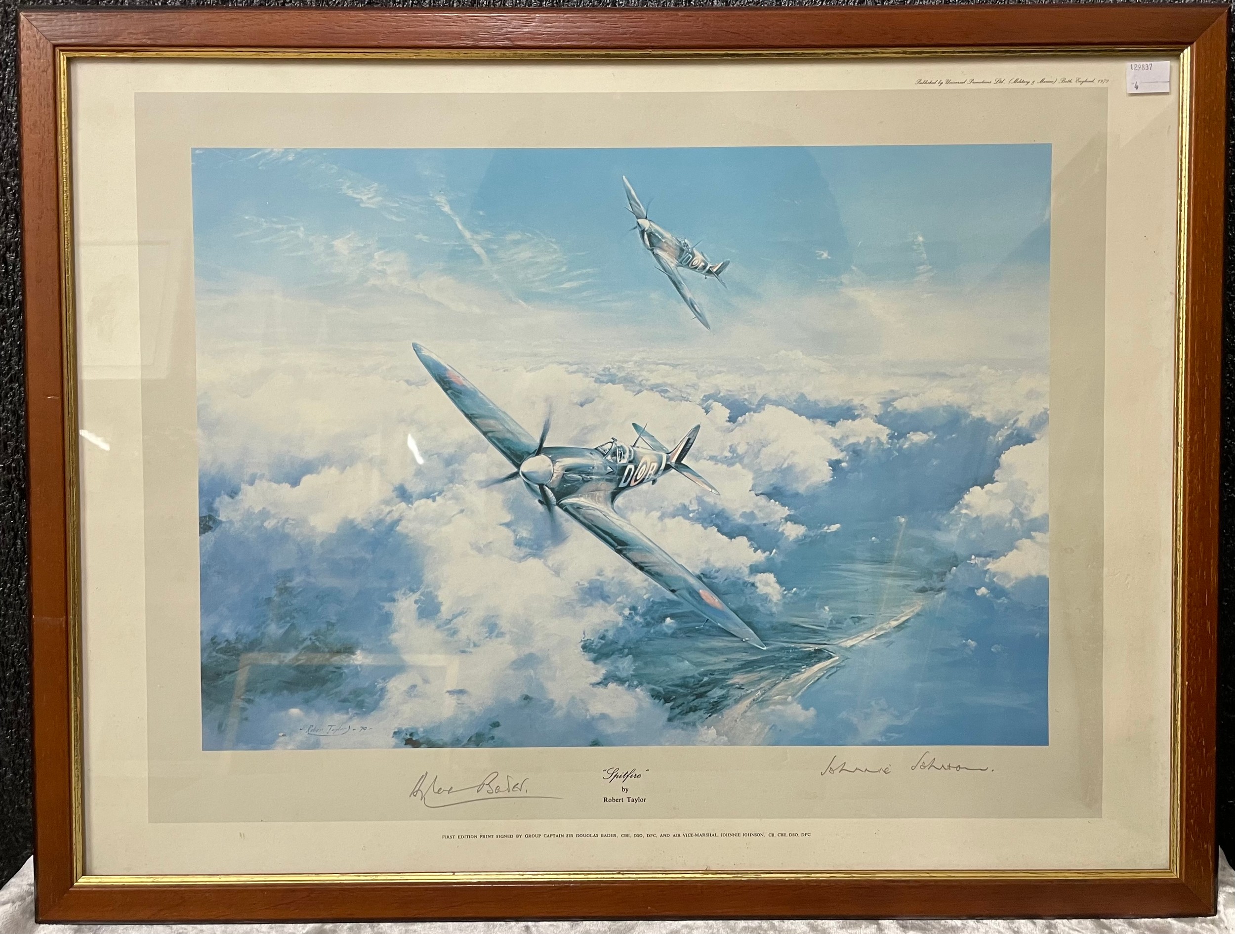 A Robret Taylor print, Spitfire, signed by Sir Douglas Bader and Johnnie Johnson, framed