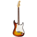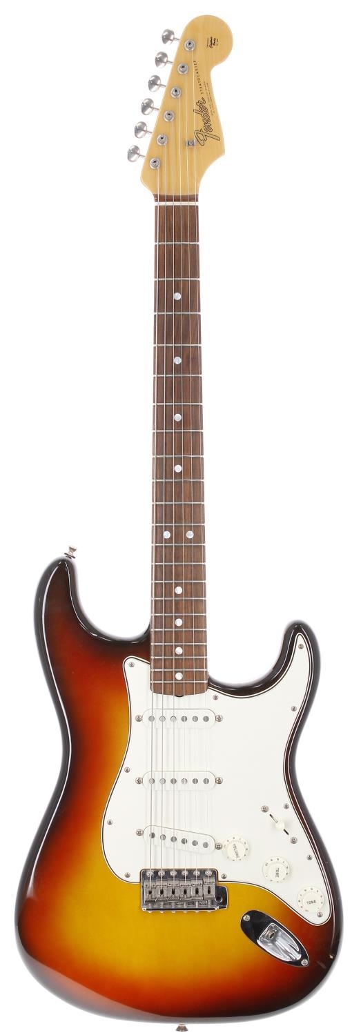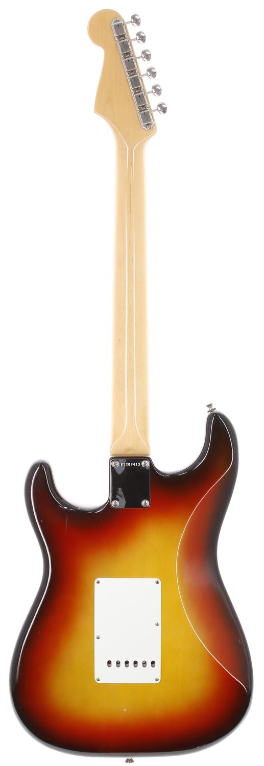 2013 Fender American Vintage 65 Reissue Stratocaster electric guitar, made in USA; Body: sunburst finish, small blemish to top treble edge, further dings to sides and back, light checking and other minor marks; Neck: maple; Fretboard: rosewood; Frets: good; Electrics: working; Hardware: good; Case: original hard case with tags and papers; Weight: 3.65kg; Overall condition: good