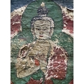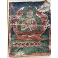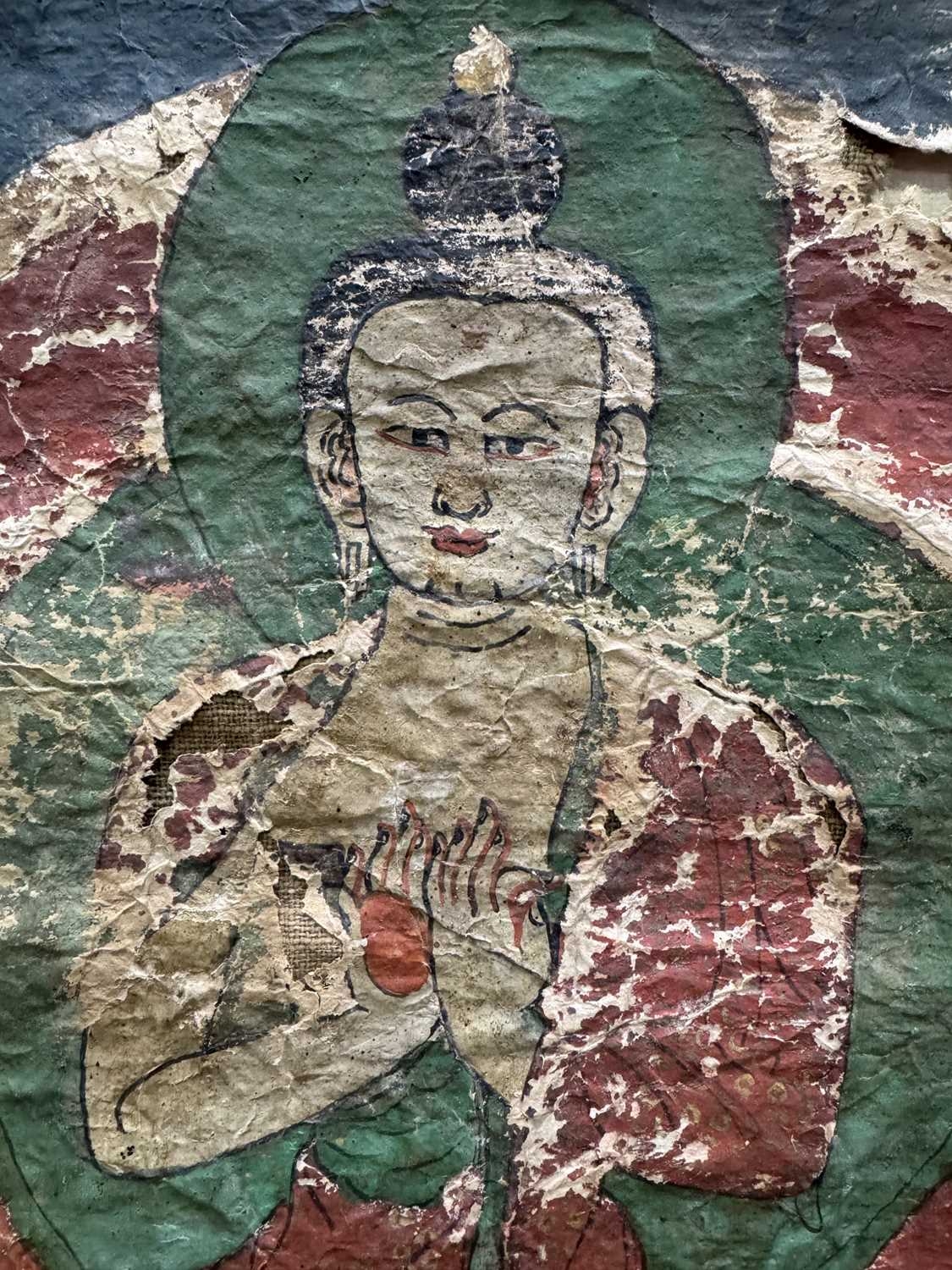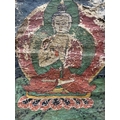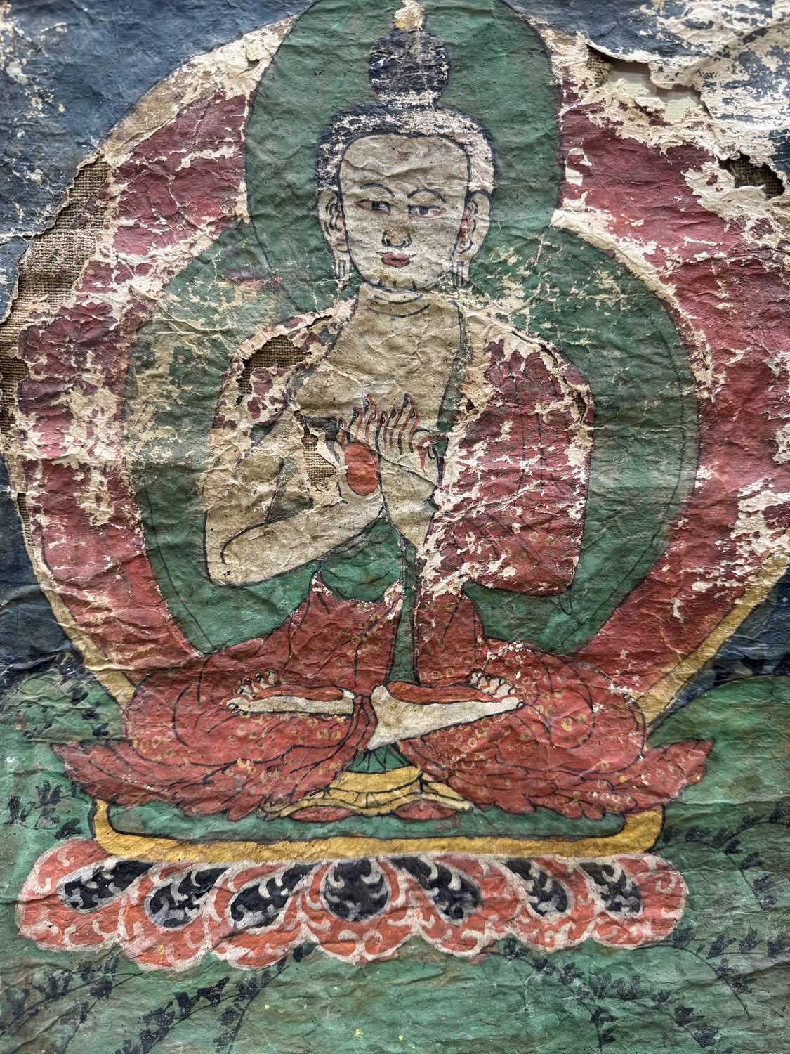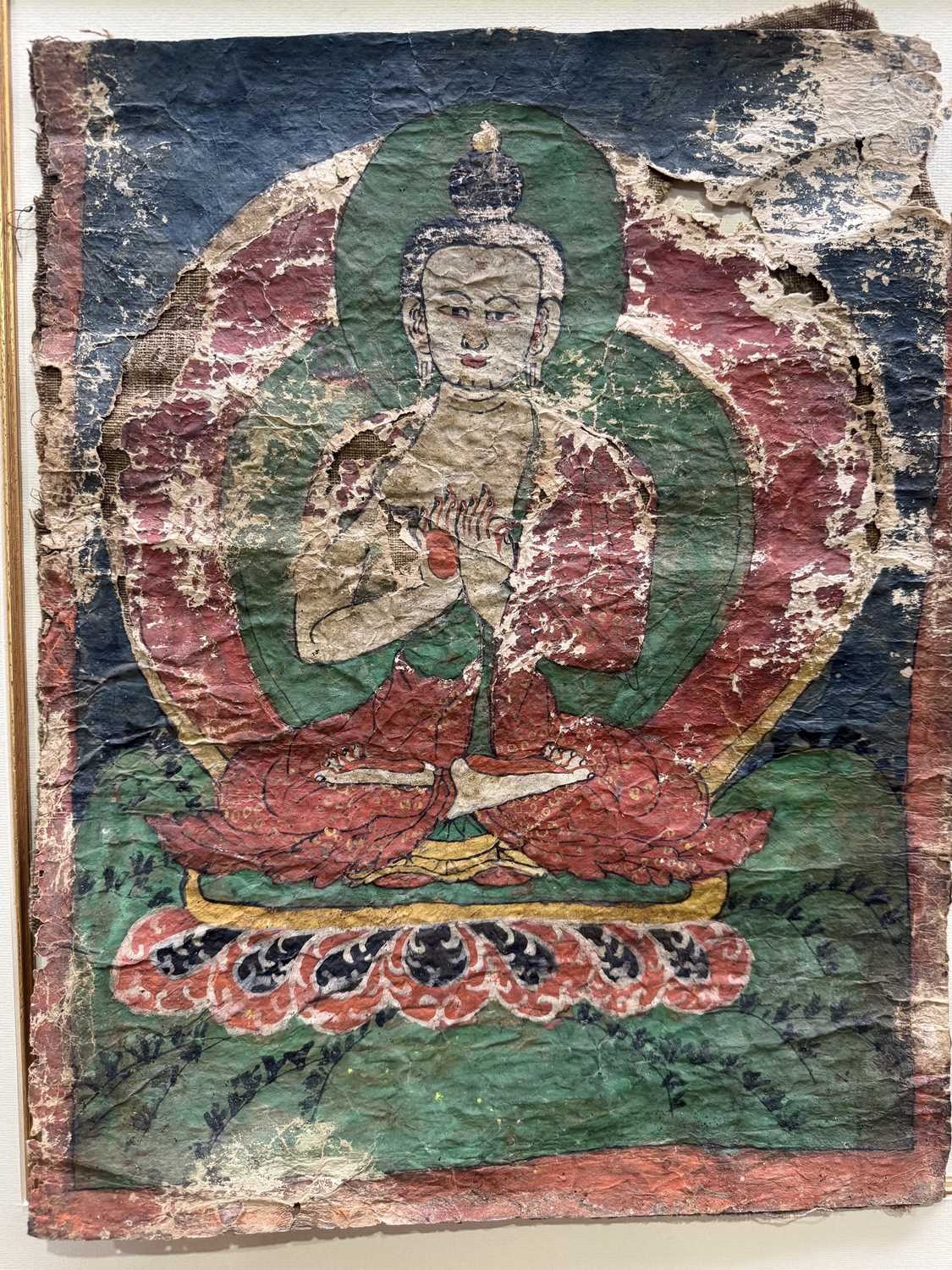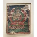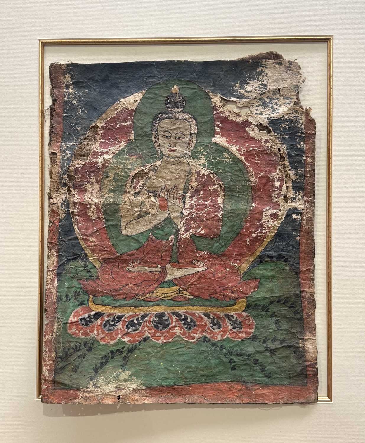 A Tibetan thangka painting of the Vairocana Buddha, 17th century, shown seated on a lotus throne holding the Dharmachakra (teaching) mudra, depicted with white skin and red palms, showing the upturned red soles of buddha's feet, dressed in red and gold robes with a green halo, gouache on lokta paper mounted on cloth, 41 by 31cm, mounted, unframed Provenance: The Alain Rouveure Collection
