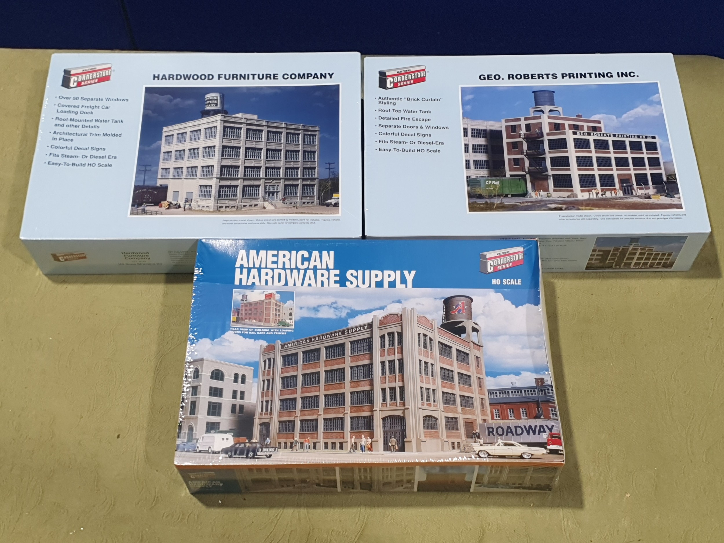 Three boxed Walthers Cornerstone American H0 Lineside Building Kits comprising American Hardware Supply, Hardwood Furniture Company and Geo. Roberts Printing Inc., all in sealed cellophane from new