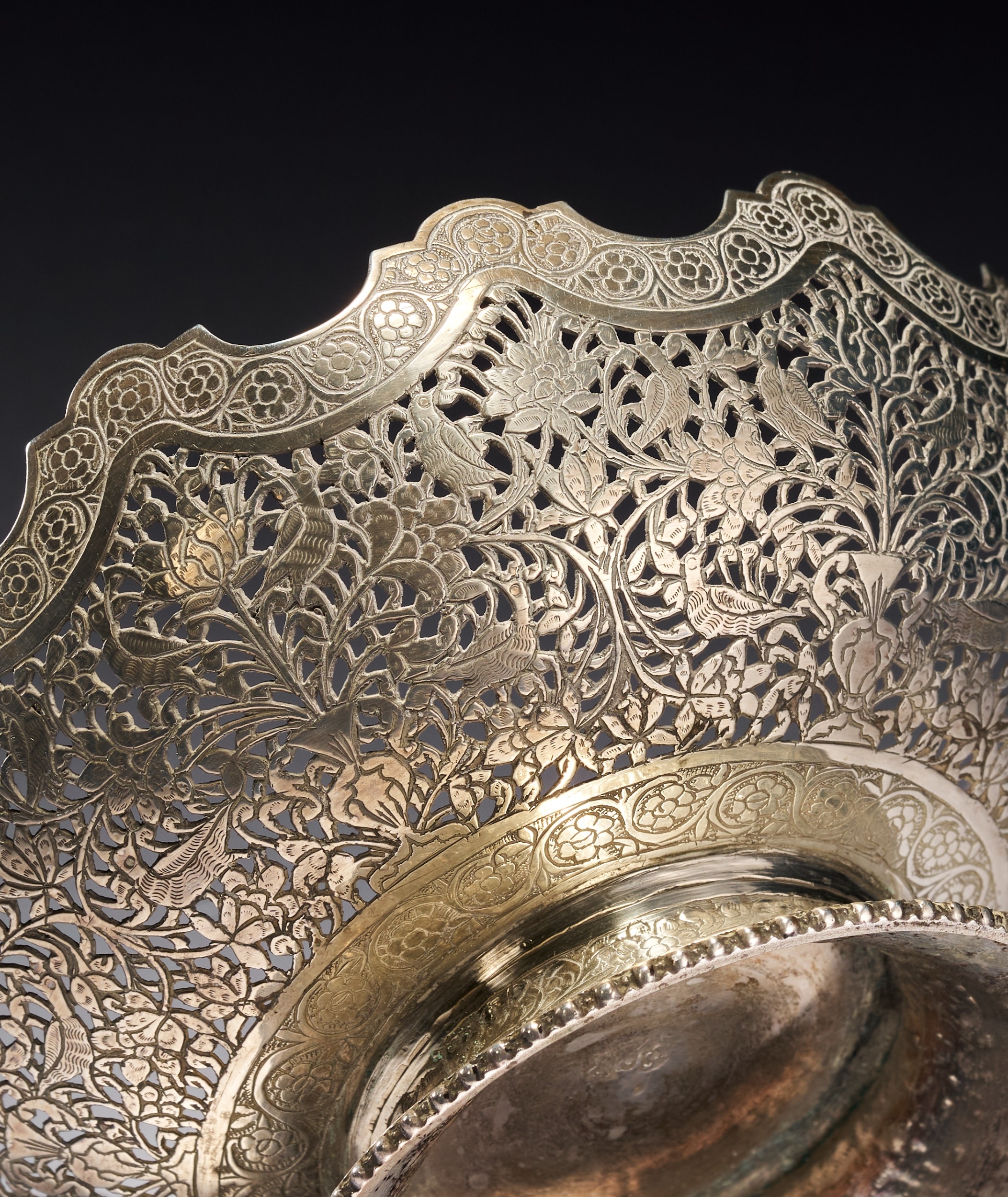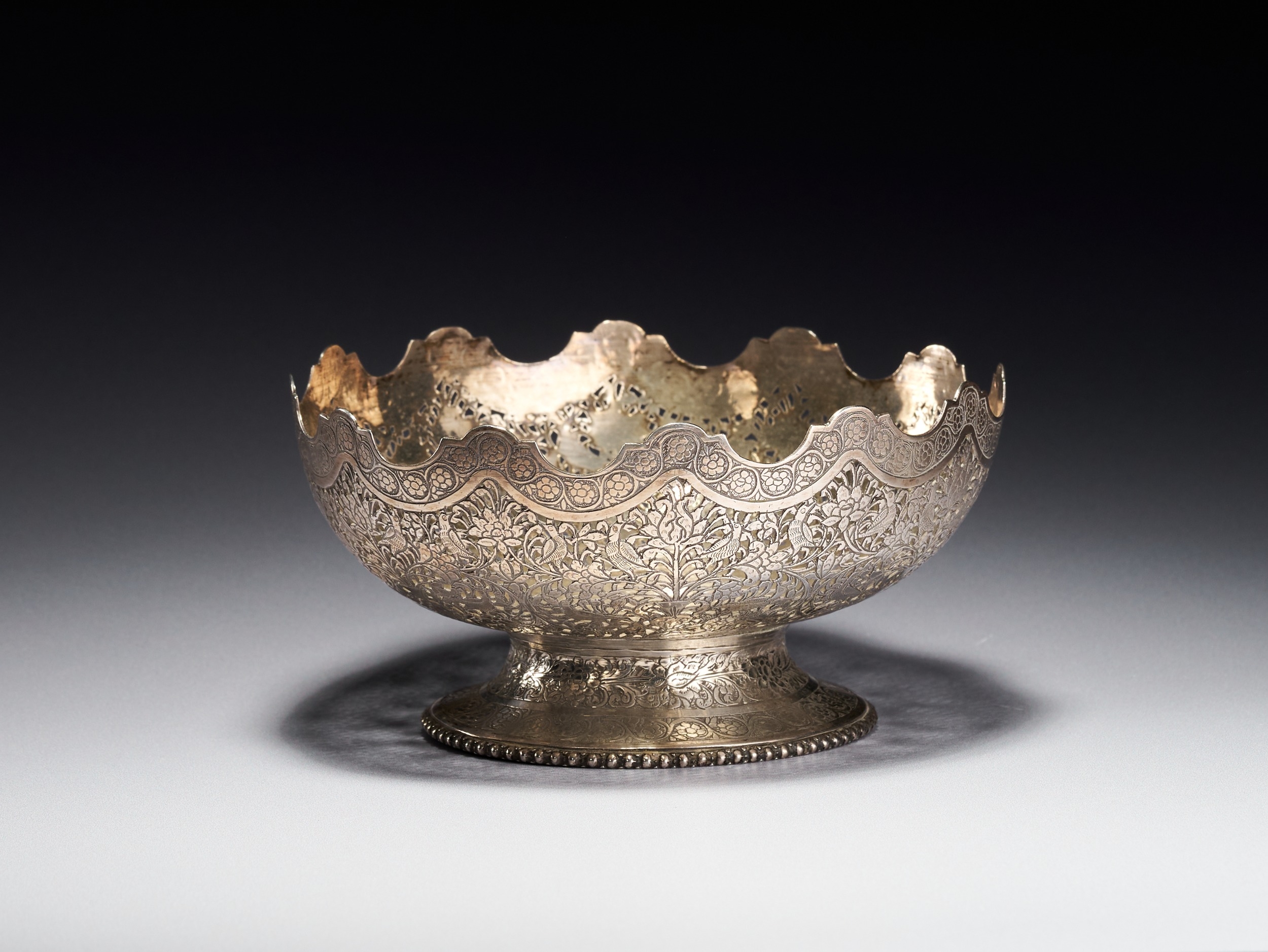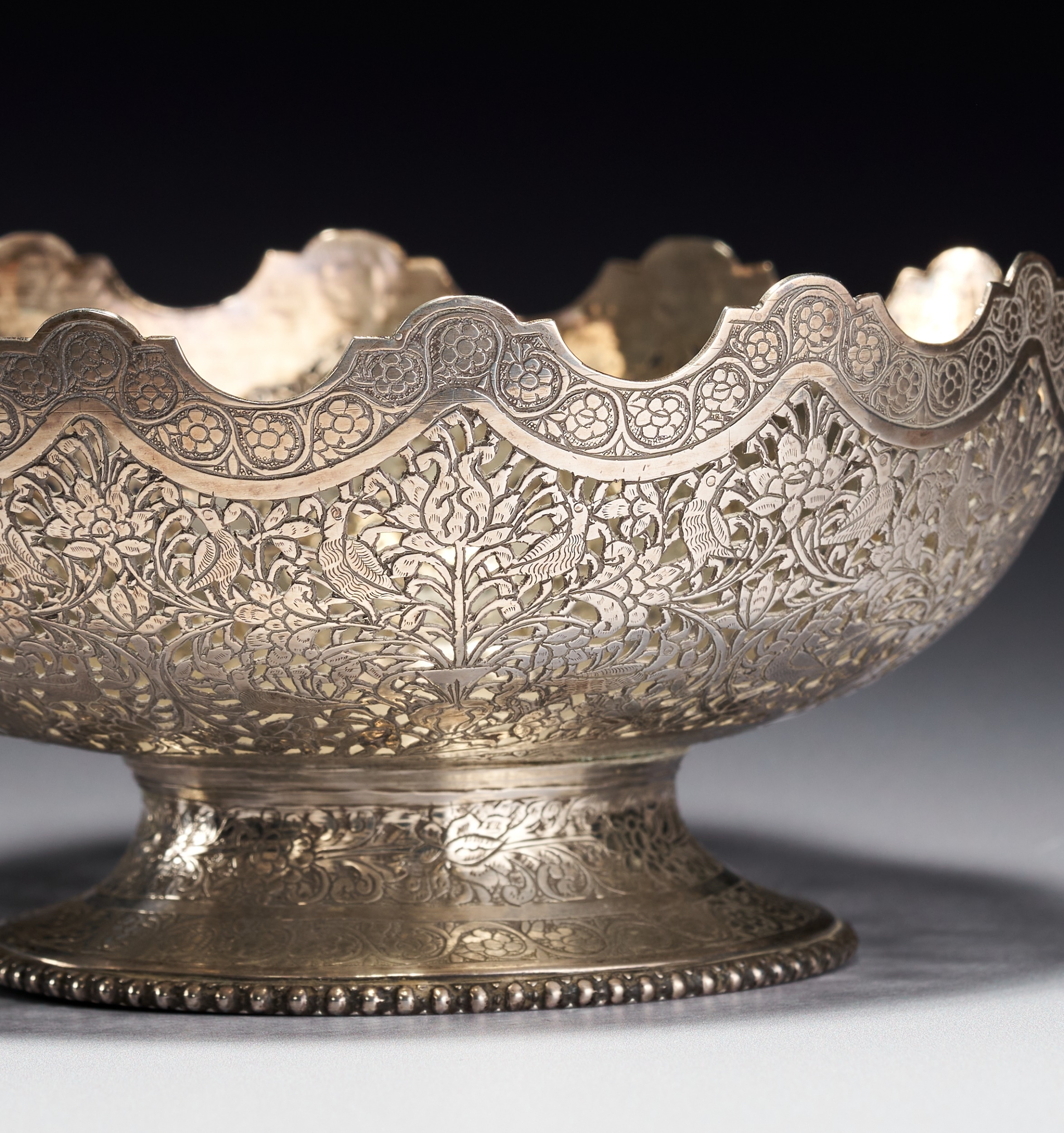 This Persian silver footed bowl is signed by Master Jaafar. The object is crafted from silver and features elaborate pierced openwork and chasing. The body is decorated with a dense pattern of birds and peacocks interspersed among flowering vines and foliate scrolls. The upper rim is deeply scalloped and finished with a band of chased floral roundels. The bowl rests on a flared circular foot decorated with a foliate border and a beaded edge at the base. A signature of Master Jaafar is located on the underside of the base.