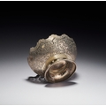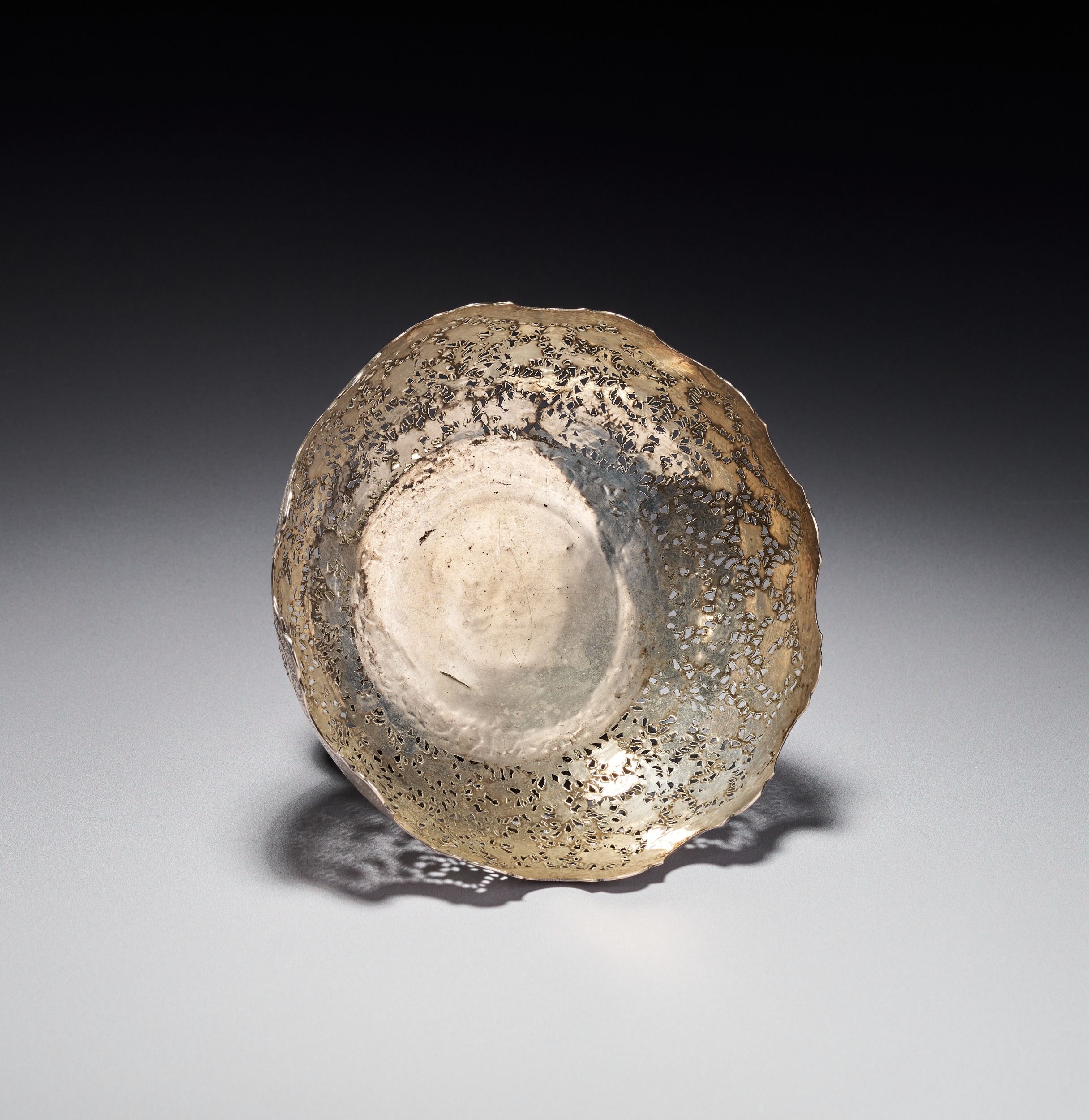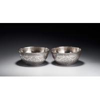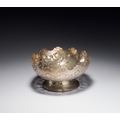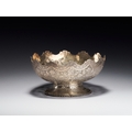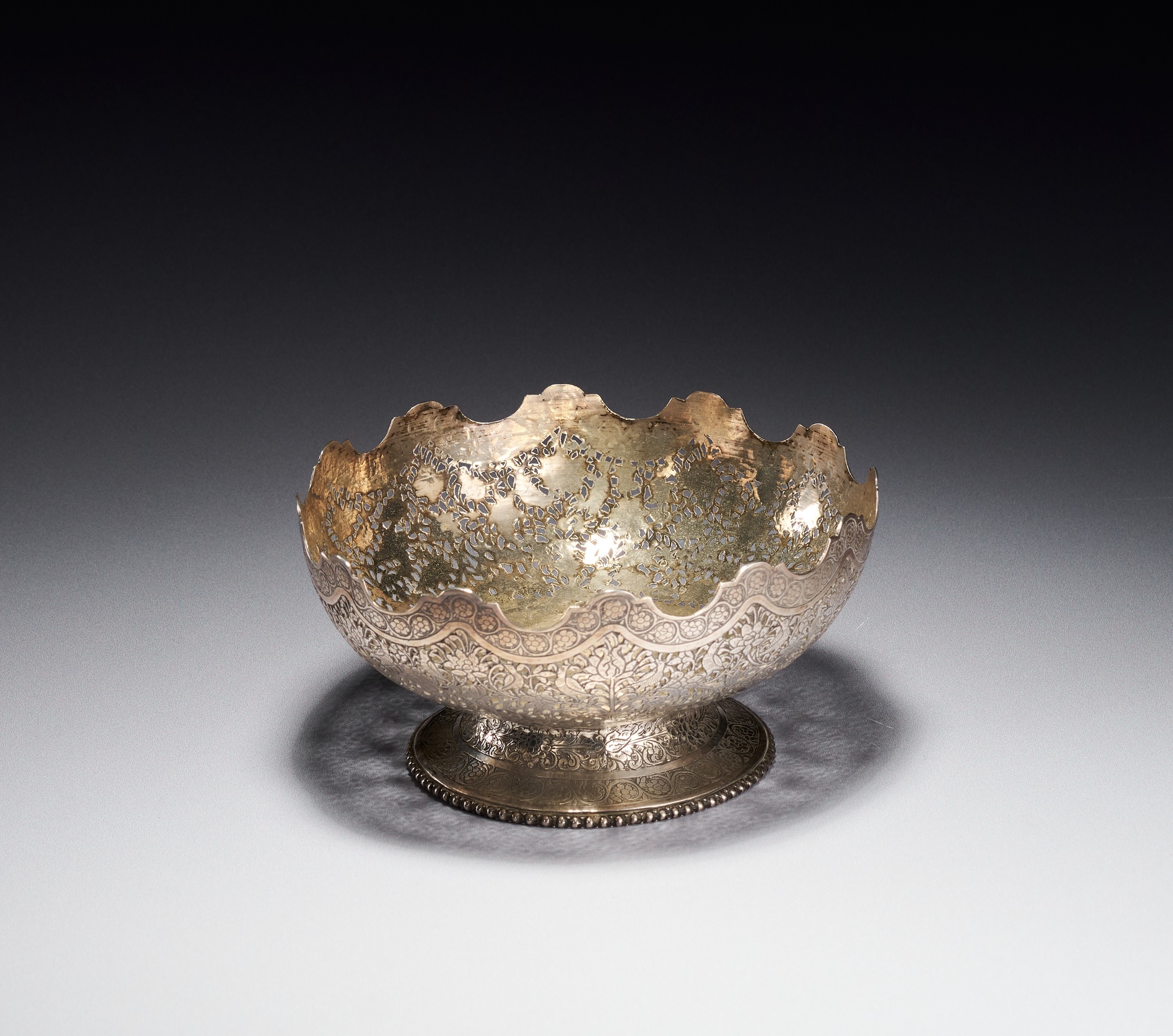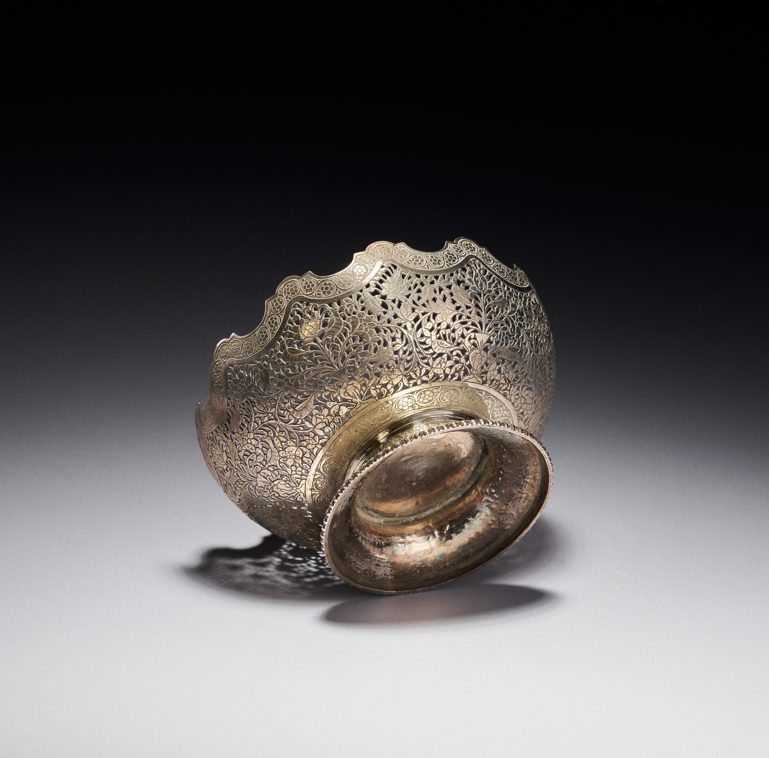 This Persian silver footed bowl is signed by Master Jaafar. The object is crafted from silver and features elaborate pierced openwork and chasing. The body is decorated with a dense pattern of birds and peacocks interspersed among flowering vines and foliate scrolls. The upper rim is deeply scalloped and finished with a band of chased floral roundels. The bowl rests on a flared circular foot decorated with a foliate border and a beaded edge at the base. A signature of Master Jaafar is located on the underside of the base.