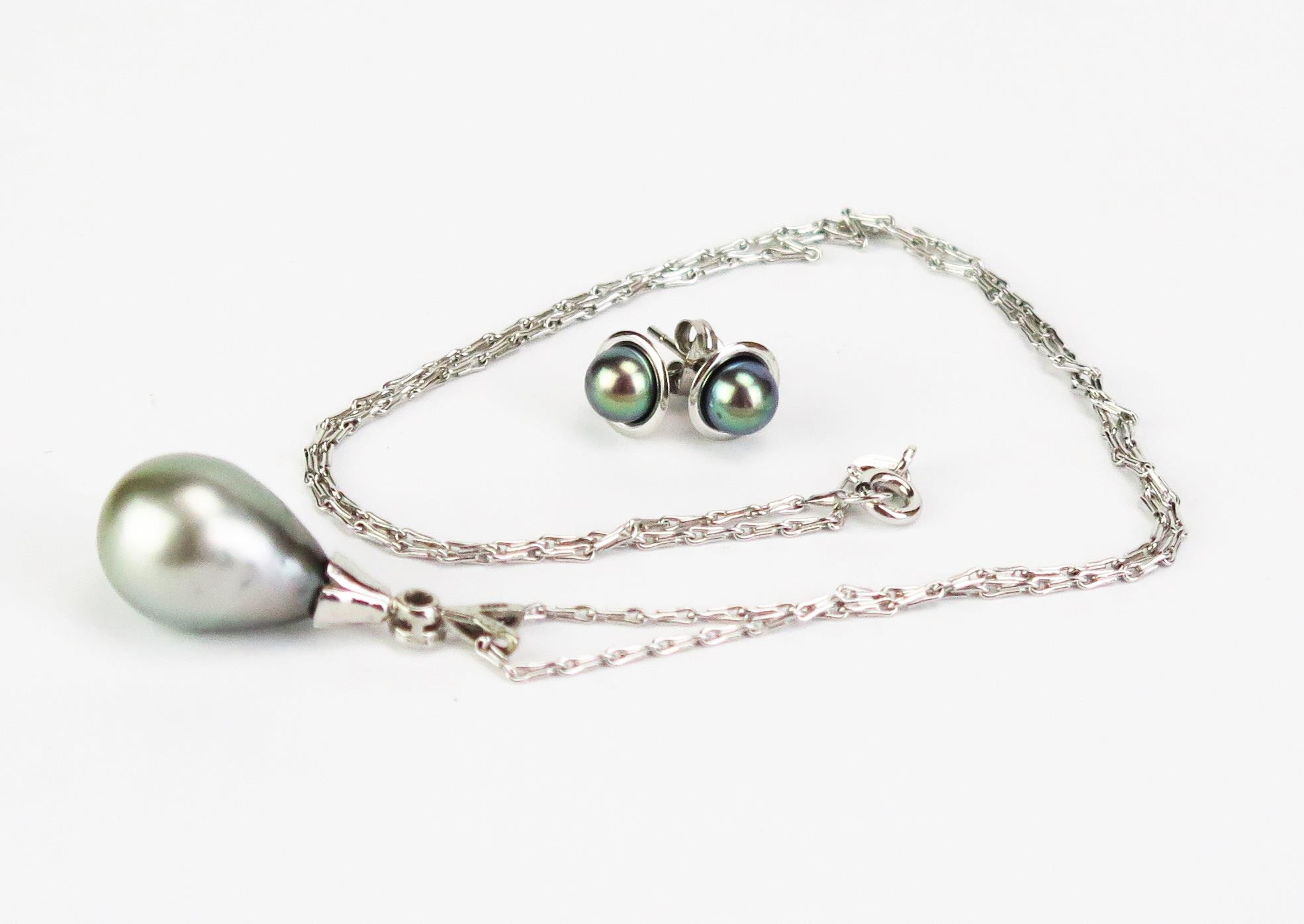 An untested South Sea Pearl and Diamond Pendant in a 9ct white gold hallmarked setting (30mm drop) and on a 9ct white gold chain (17.5", 44.5cm and a pair of studs), 7.46g
