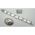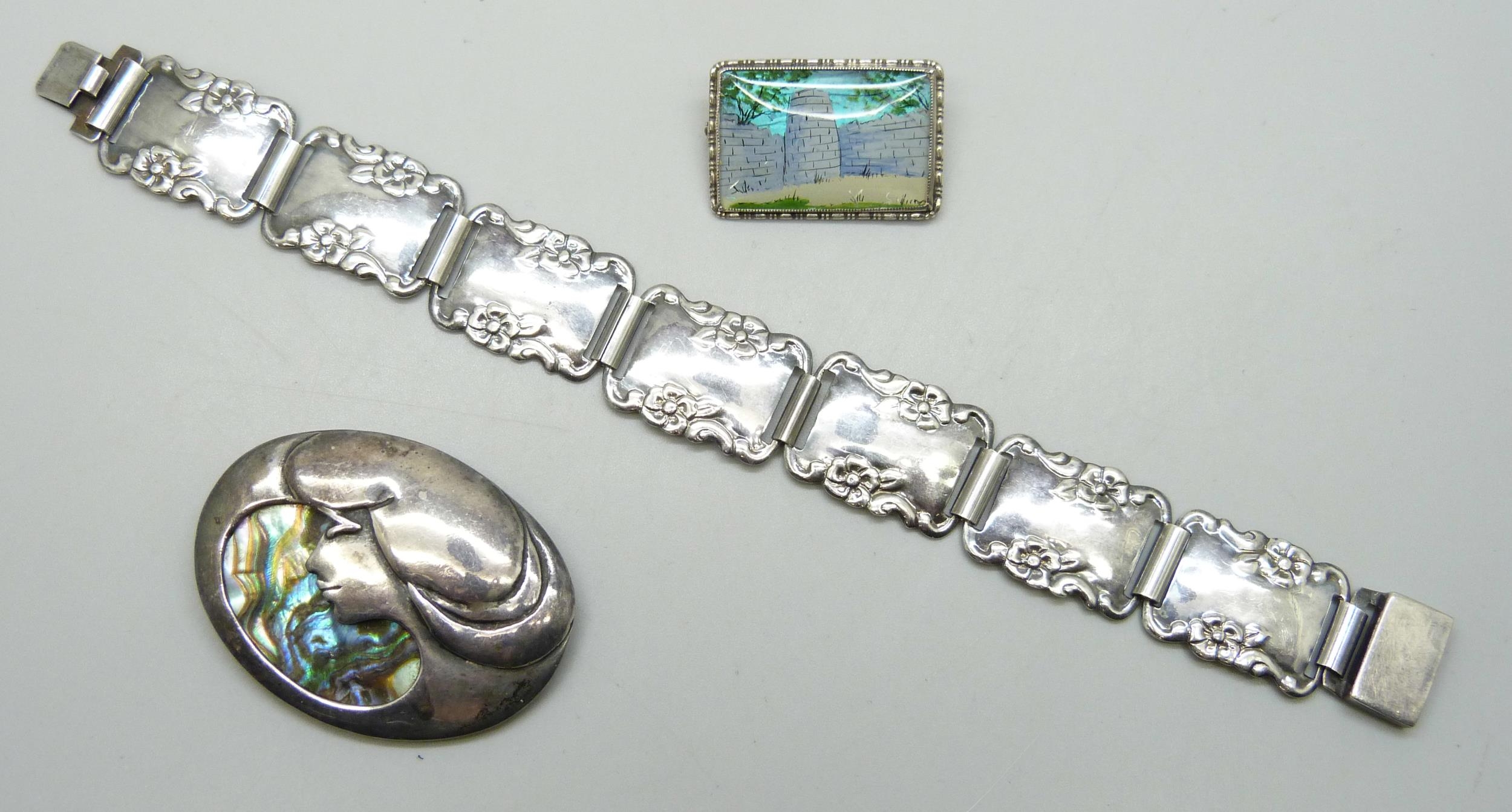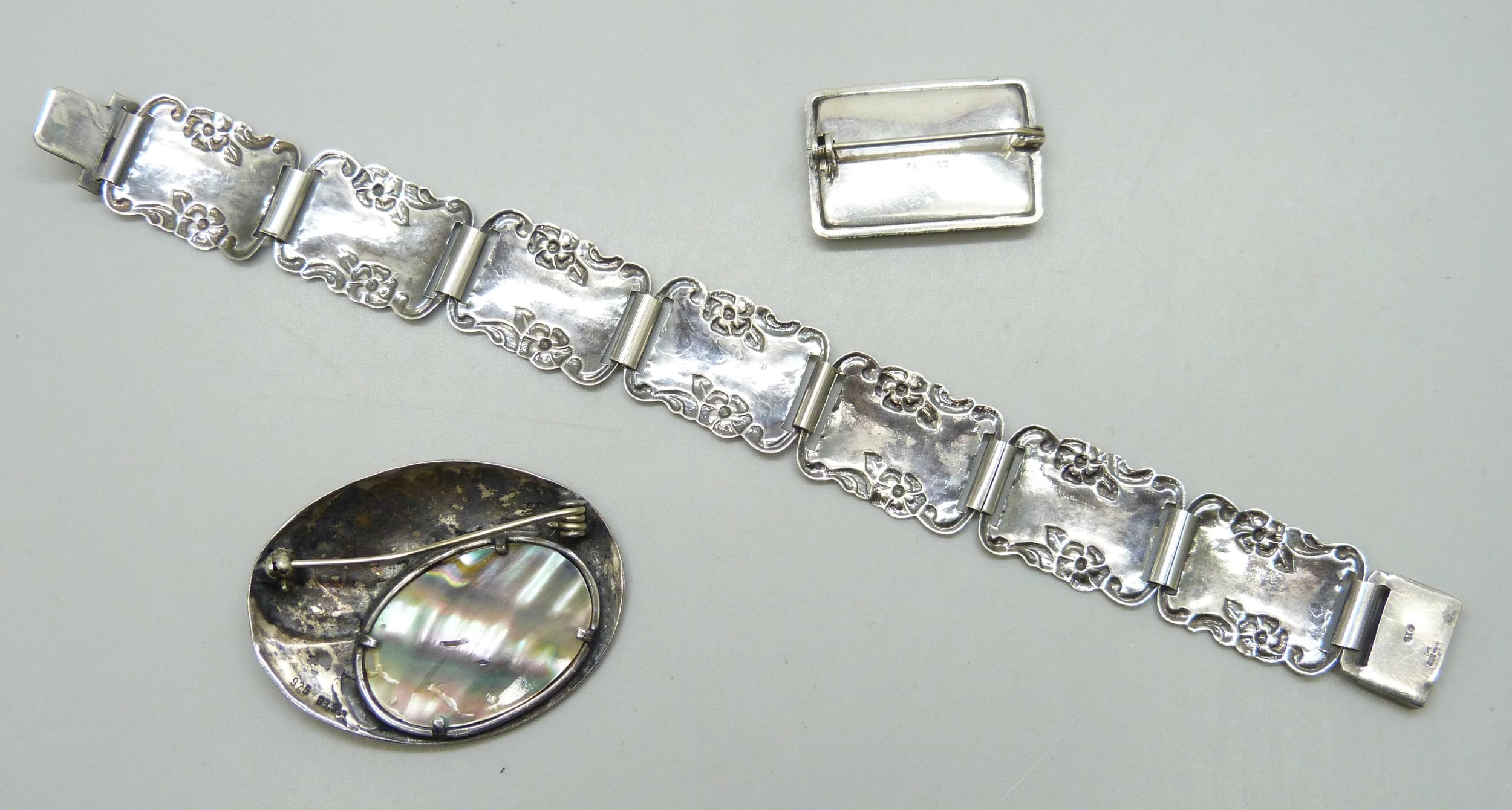 An Art Nouveau style silver brooch and bracelet, 18.5cm, and a Thomas Mott butterfly wing silver brooch, 3cm