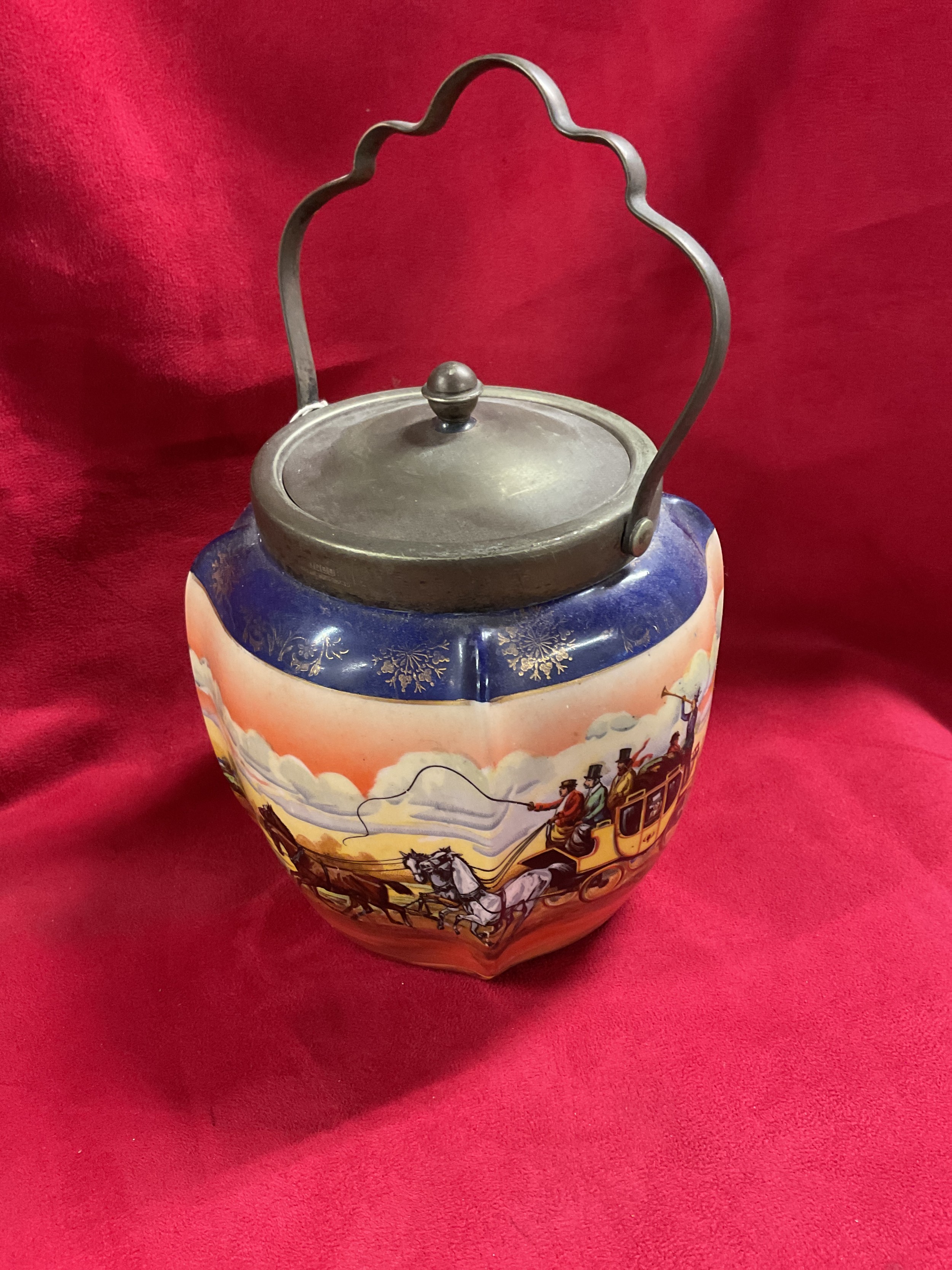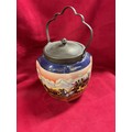 A hand painted biscuit barrel depicting a tavern scene