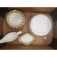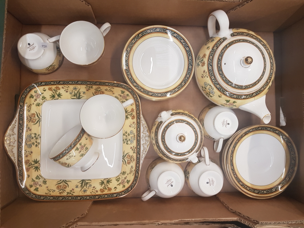 Wedgwood India pattern tea ware items to include teapot, 7 cups, 6 saucers, 6 side plates, cake plate and a lidded sugar bowl (1 tray).