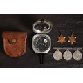 A WWII Group of five: comprising 1939-45 Star, Burma Star, two 1939-45 war Medals and a Defence Medal in postal box, together with a leather cased sighting compass with green crackle finish.