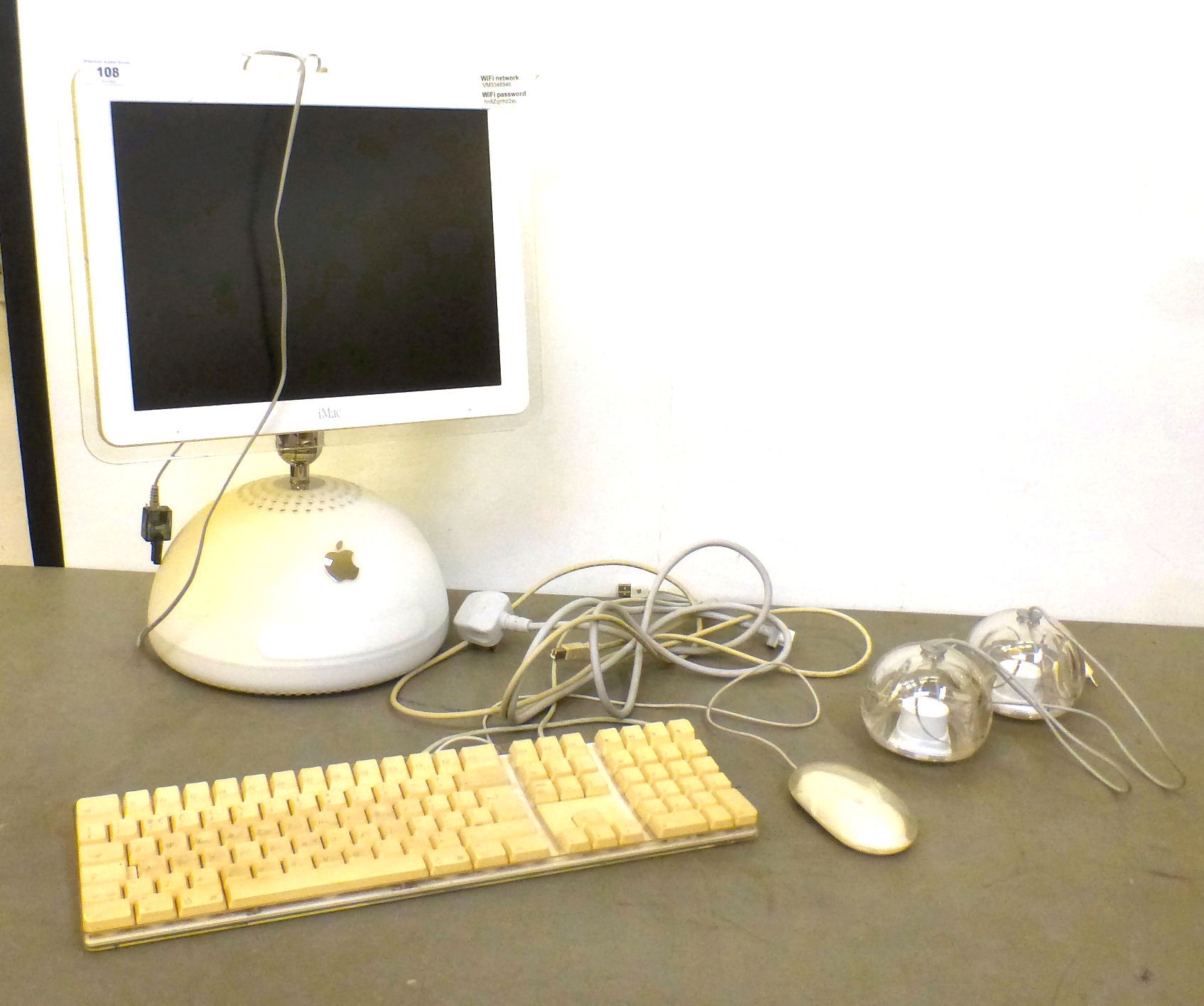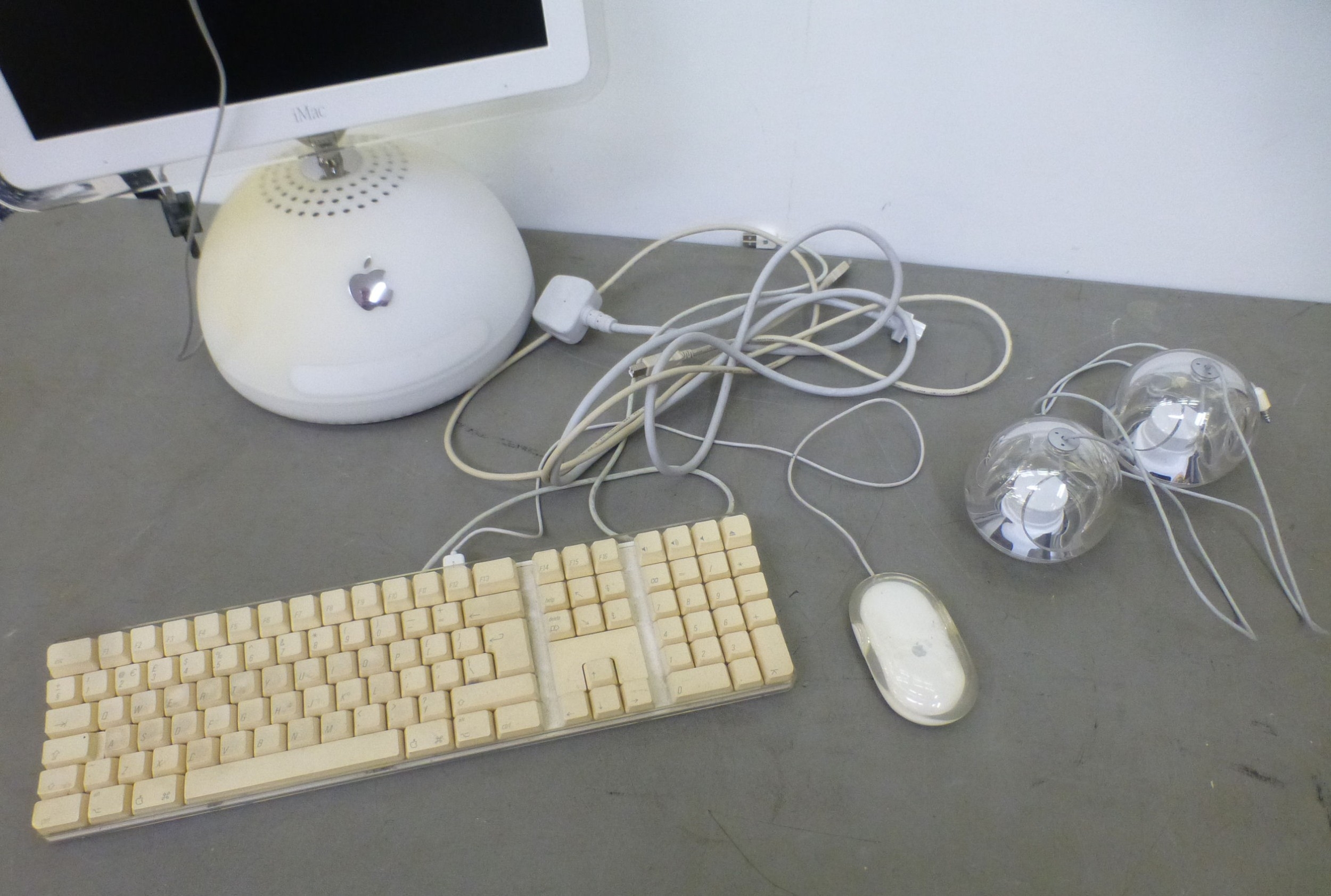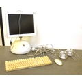A modern Apple IMac computer with a mouse, speakers and keyboard 20"h